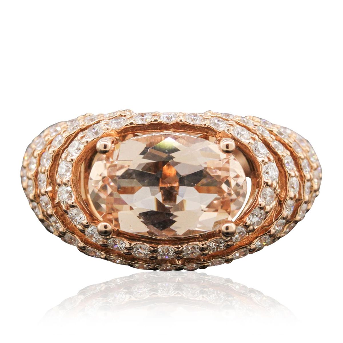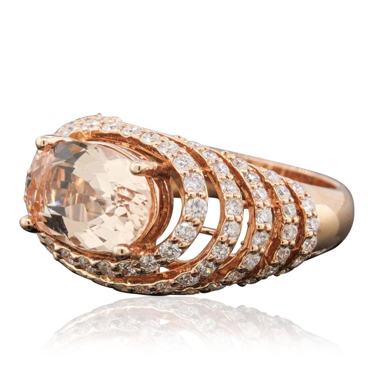 One electronically tested 14KT rose gold ladies cast morganite and diamond ring with a bright polish finish. Condition is new, good workmanship. The featured morganite is set within stacked diamond bezels, completed by a three and one-half millimeter wide band. Identified with markings of "K14". Containing: One prong set oval mixed cut natural morganite, measuring 11.60 x 12.40 x 4.50mm, 6%. bulge factor, approximate weight of 3.74ct., clarity is eye clean, type I, light, very slightly brownish, reddish orange color, (GIA rO 3/3), cut is good. Transmitting light with no distortion, transparent. Graded in the setting. Ninety-One prong set round brilliant cut diamonds, measuring 1.60 - 1.50 x 0.93mm (depth est.) approximate. Total Weight of 91 Stones = 1.33ct. Graded in the setting. Clarity: SI-1 to I-1. Color: G - I. Total Weight of Colored Stones 3.74ct. Total Weight of Diamonds 1.33ct. Total Weight of Ring 7.04 grams. AIG Appraised at $7,890.00.