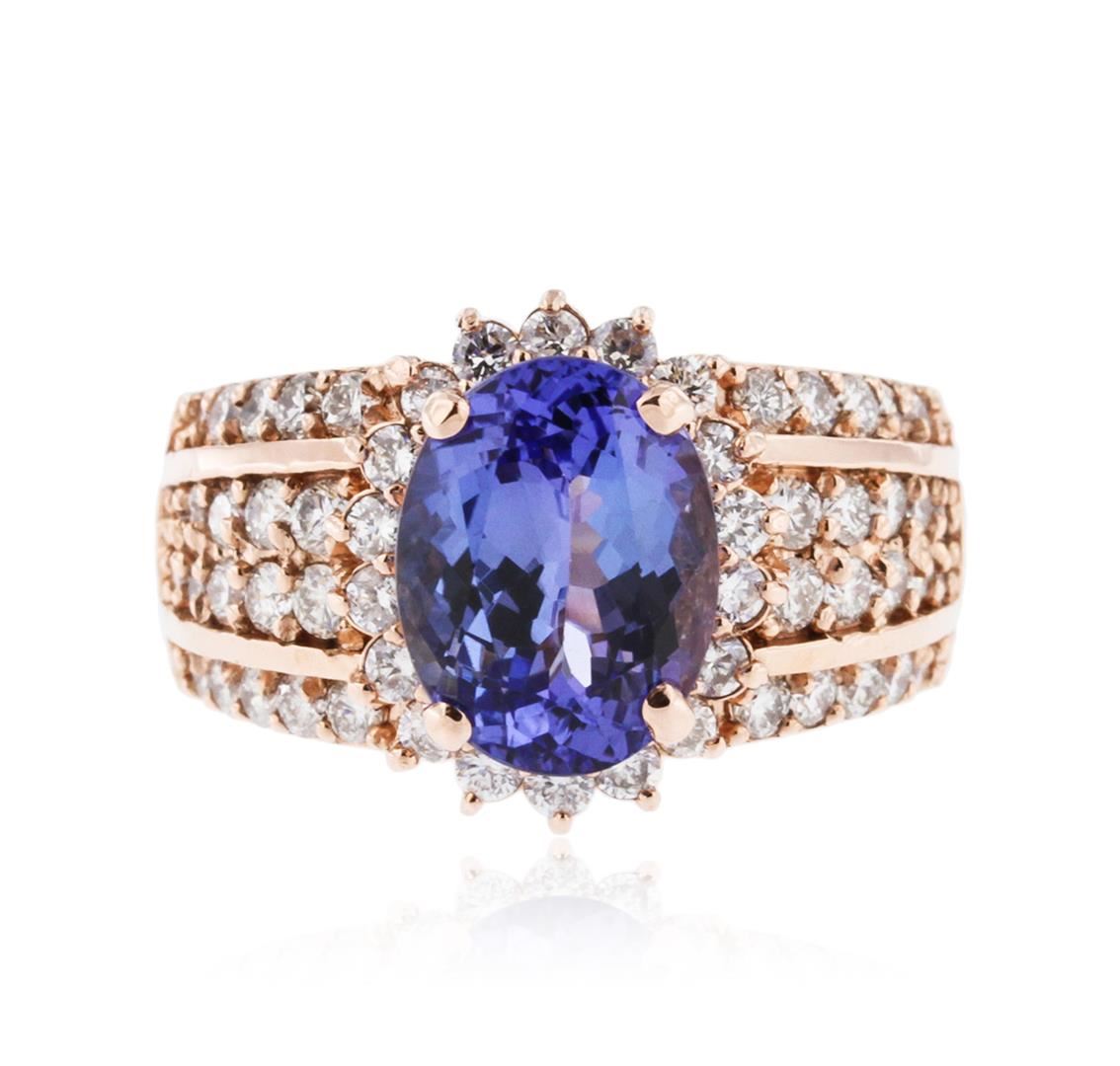 One electronically tested 14KT rose gold ladies cast tanzanite and diamond ring with a bright polish finish. Identified with markings of "K14". Condition is new. Containing: One prong set oval modified brilliant cut natural tanzanite, measuring 11.10 x 8.60 x 5.59mm, approximate weight of 3.75ct., clarity is eye clean, type I, medium light, very slightly grayish, violet color, (GIA V 4/3), cut is good. Fifty-Eight channel set round brilliant cut diamonds, measuring 1.80 - 1.80 x 1.08mm (depth est.) approximate total weight of 58 Stones = 1.24ct. Clarity: SI-1 to I-1. Color: H - I, Cut is Good. Colored gemstones are presumed to have been subjected to commonly used enhancement processes. All diamonds and colored gemstones are graded in the mounting, unless otherwise stated. Total Weight of Colored Stones 3.75ct. Total Weight of Diamonds 1.24ct. Total Weight of Ring 10.90 grams. GGL Appraised at $6,875.00.
