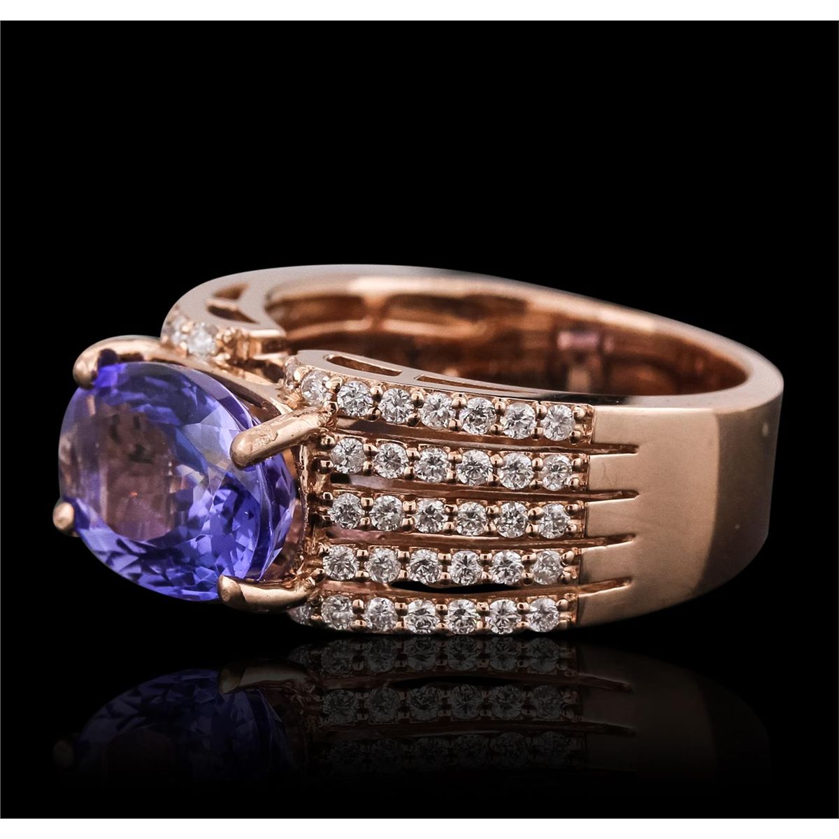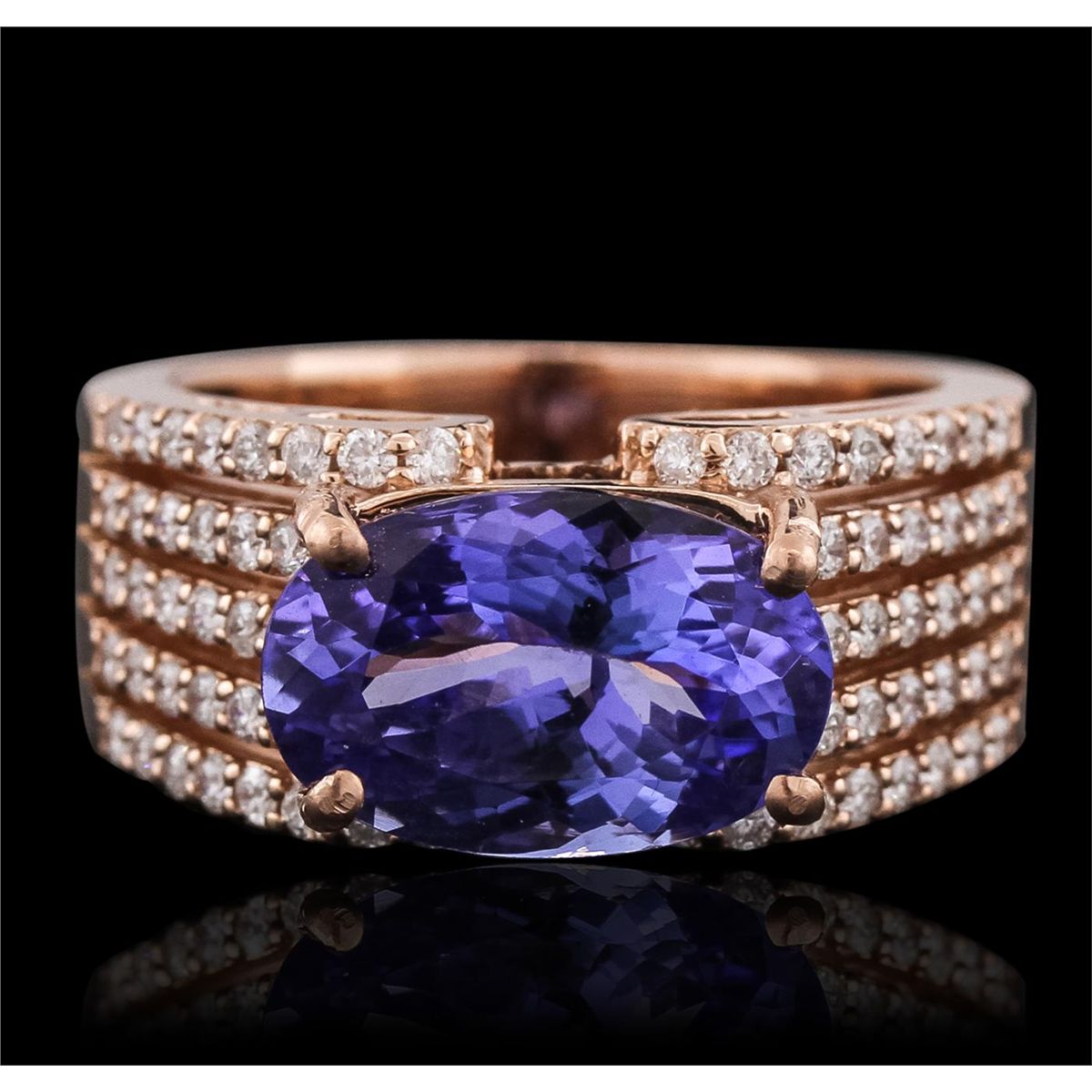 One electronically tested 14KT rose gold ladies combination cast & assembled tanzanite and diamond ring with a split shoulder shank with a bright polish finish. Identified with markings of "14K". Condition is new. Containing: One prong set oval modified brilliant cut natural tanzanite, measuring 12.51 x 7.69 x 5.59mm, approximate weight of 3.82ct., clarity is eye clean, type I, medium, moderately strong, bluish violet color, (GIA bV 5/4), cut is good. Sixty-Eight prong set round brilliant cut diamonds, measuring 1.30 - 1.30 x 0.78mm (depth est.) approximate total weight of 68 Stones = 0.54ct. Clarity: I-1 to I-2. Color: I - J, Cut is Good. Colored gemstones are presumed to have been subjected to commonly used enhancement processes. All diamonds and colored gemstones are graded in the mounting, unless otherwise stated. Total Weight of Colored Stones 3.82ct. Total Weight of Diamonds 0.54ct. Total Weight of Ring 8.50 grams. GGL Appraised at $9,265.00.