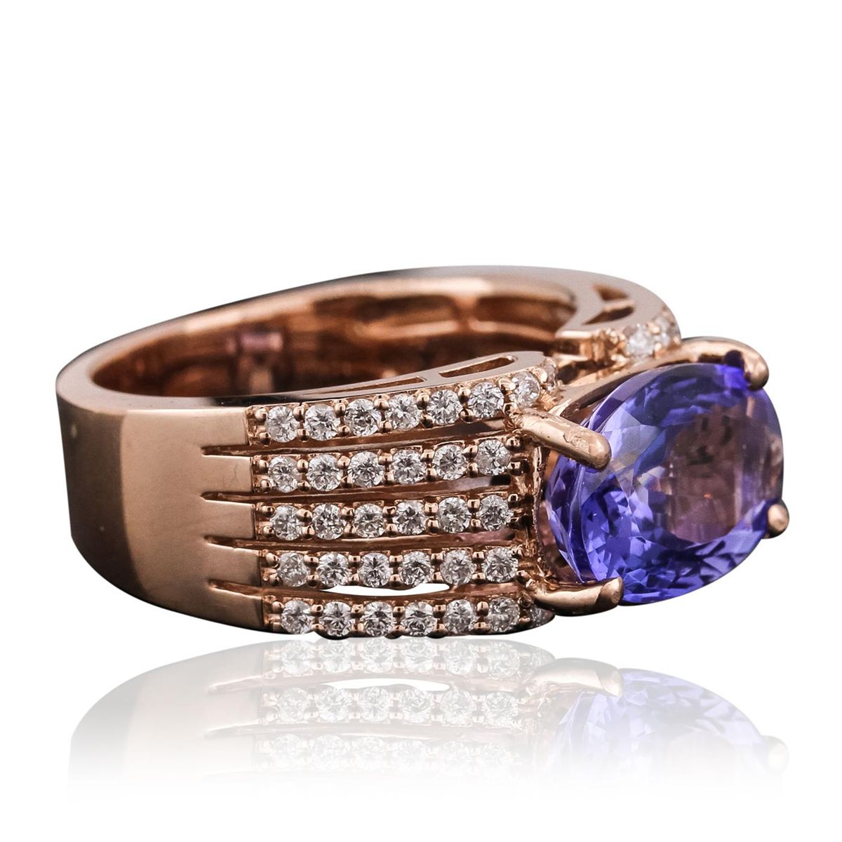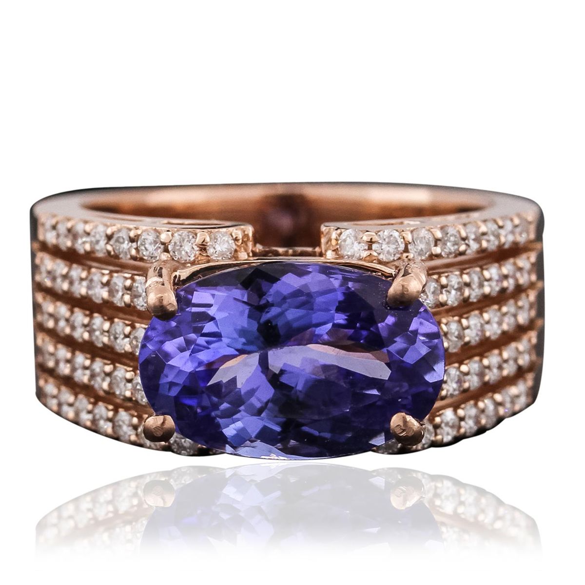 One electronically tested 14KT rose gold ladies combination cast & assembled tanzanite and diamond ring with a split shoulder shank with a bright polish finish. Identified with markings of "14K". Condition is new. Containing: One prong set oval modified brilliant cut natural tanzanite, measuring 12.51 x 7.69 x 5.59mm, approximate weight of 3.82ct., clarity is eye clean, type I, medium, moderately strong, bluish violet color, (GIA bV 5/4), cut is good. Sixty-Eight prong set round brilliant cut diamonds, measuring 1.30 - 1.30 x 0.78mm (depth est.) approximate total weight of 68 Stones = 0.54ct. Clarity: I-1 to I-2. Color: I - J, Cut is Good. Colored gemstones are presumed to have been subjected to commonly used enhancement processes. All diamonds and colored gemstones are graded in the mounting, unless otherwise stated. Total Weight of Colored Stones 3.82ct. Total Weight of Diamonds 0.54ct. Total Weight of Ring 8.50 grams. GGL Appraised at $9,265.00.