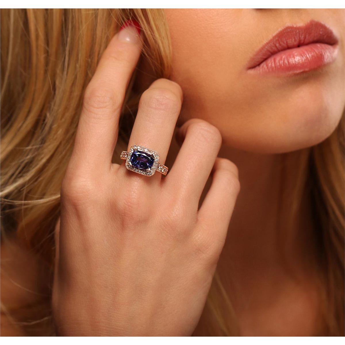 One electronically tested 14KT rose gold ladies cast tanzanite and diamond ring. Condition is new, good workmanship. The featured tanzanite is set within a diamond lattice gallery, supported by diamond set shoulders and completed by a three millimeter wide band. Bright and patterned finish with milgrain detailing throughout. Identified with markings of "14K". Containing: One prong set rectangular cushion mixed cut natural tanzanite, measuring 10.20 x 7.40 x 6.00mm, 8%. bulge factor, approximate weight of 3.85ct., clarity is eye clean, type I, medium dark, very slightly grayish, bluish violet color, (GIA bV 6/3), cut is good. Transmitting light with no distortion, transparent. Graded in the setting. Tanzanite is a very rare gemstone that is only found in the country of Tanzania. Originally discovered in 1967. Tiffany & Company, named the stone Tanzanite. It is found in the Usumburu Mountains that border the Umba Valley of northern Tanzania. Tanzanite occurs in gray, brown, violet, blue, reddish-purple, & green. The gem is interesting because of its exceptional pleochroism. Rotated in different directions a tanzanite will exhibit multiple changes of color. Tanzanite has a low tolerance to ultrasonic cleaning, and should not be cleaned using this method. Twenty-Two bead set round brilliant cut diamonds, measuring 1.40 - 1.30 x 0.81mm (depth est.) approximate. Total Weight of 22 Stones = 0.28ct. Graded in the setting. Clarity: SI-1 to I-1. Color: I - K Eight bead set round brilliant cut diamonds, measuring 2.20 - 2.00 x 1.26mm (depth est.) approximate. Total Weight of 8 Stones = 0.34ct. Graded in the setting. Clarity: SI-1 to I-1. Color: I - K. Total Weight of Colored Stones 3.85ct. Total Weight of Diamonds 0.62ct. Total Weight of Ring 7.20 grams. AIG Appraised at $11,875.00.