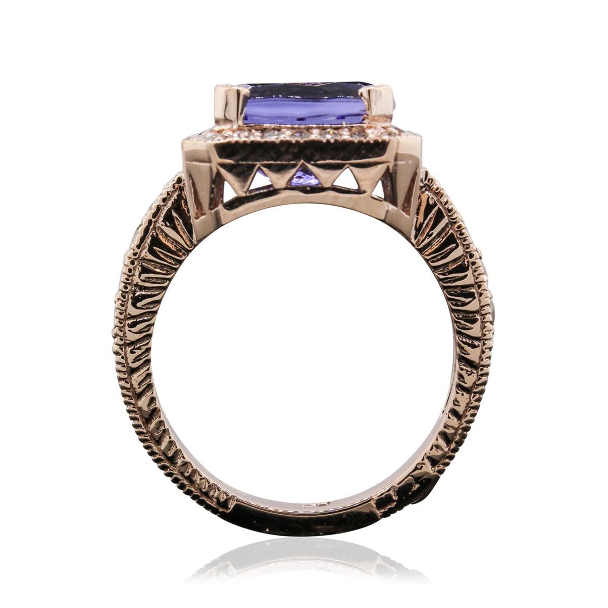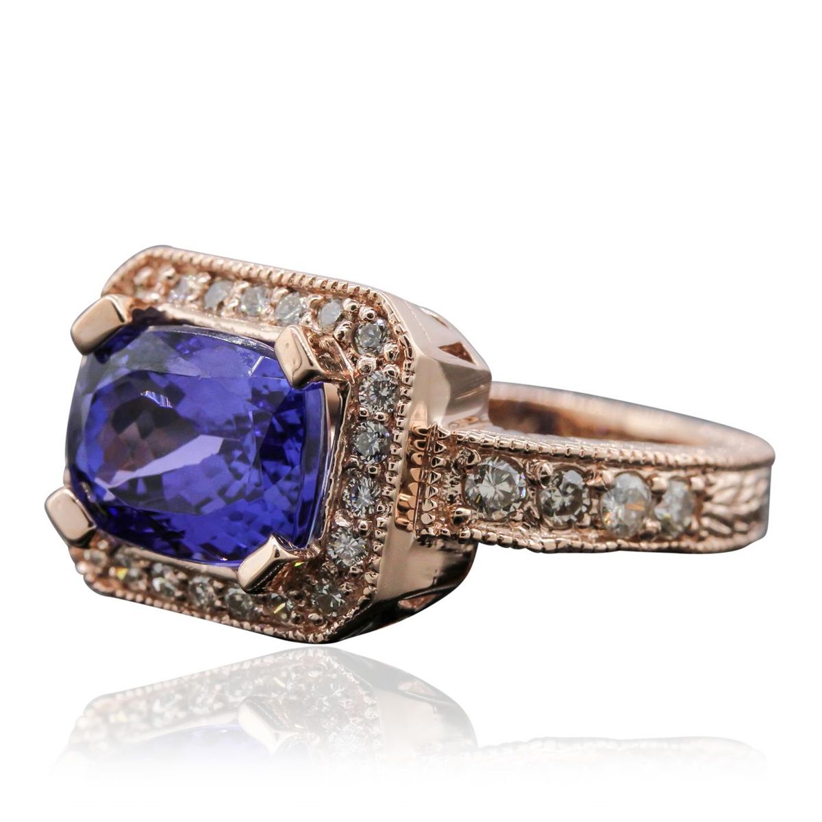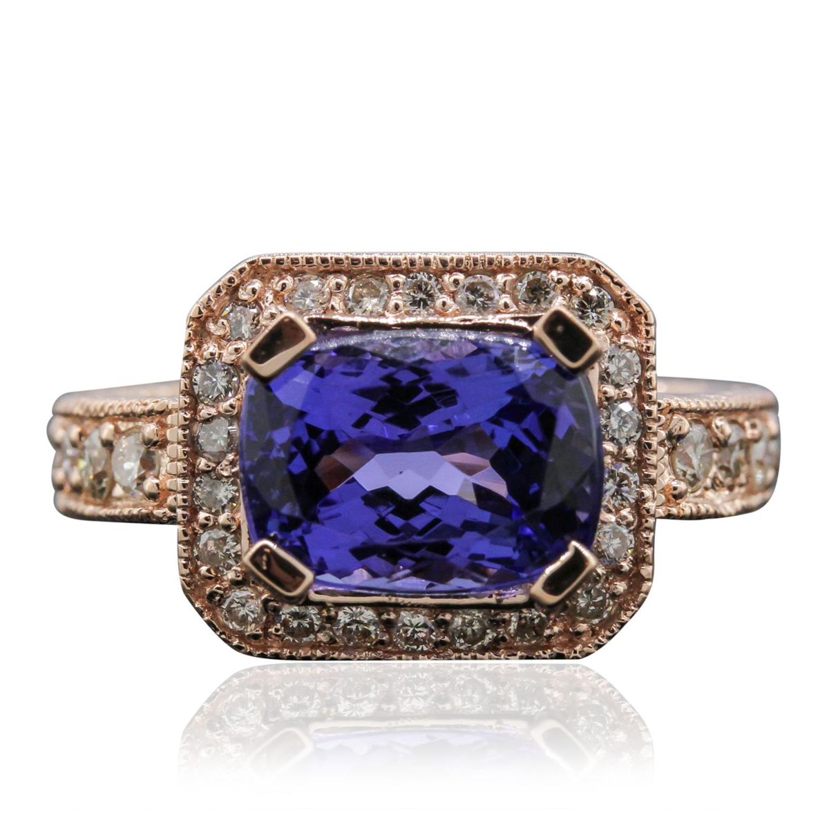 One electronically tested 14KT rose gold ladies cast tanzanite and diamond ring. Condition is new, good workmanship. The featured tanzanite is set within a diamond lattice gallery, supported by diamond set shoulders and completed by a three millimeter wide band. Bright and patterned finish with milgrain detailing throughout. Identified with markings of "14K". Containing: One prong set rectangular cushion mixed cut natural tanzanite, measuring 10.20 x 7.40 x 6.00mm, 8%. bulge factor, approximate weight of 3.85ct., clarity is eye clean, type I, medium dark, very slightly grayish, bluish violet color, (GIA bV 6/3), cut is good. Transmitting light with no distortion, transparent. Graded in the setting. Tanzanite is a very rare gemstone that is only found in the country of Tanzania. Originally discovered in 1967. Tiffany & Company, named the stone Tanzanite. It is found in the Usumburu Mountains that border the Umba Valley of northern Tanzania. Tanzanite occurs in gray, brown, violet, blue, reddish-purple, & green. The gem is interesting because of its exceptional pleochroism. Rotated in different directions a tanzanite will exhibit multiple changes of color. Tanzanite has a low tolerance to ultrasonic cleaning, and should not be cleaned using this method. Twenty-Two bead set round brilliant cut diamonds, measuring 1.40 - 1.30 x 0.81mm (depth est.) approximate. Total Weight of 22 Stones = 0.28ct. Graded in the setting. Clarity: SI-1 to I-1. Color: I - K Eight bead set round brilliant cut diamonds, measuring 2.20 - 2.00 x 1.26mm (depth est.) approximate. Total Weight of 8 Stones = 0.34ct. Graded in the setting. Clarity: SI-1 to I-1. Color: I - K. Total Weight of Colored Stones 3.85ct. Total Weight of Diamonds 0.62ct. Total Weight of Ring 7.20 grams. AIG Appraised at $11,875.00.