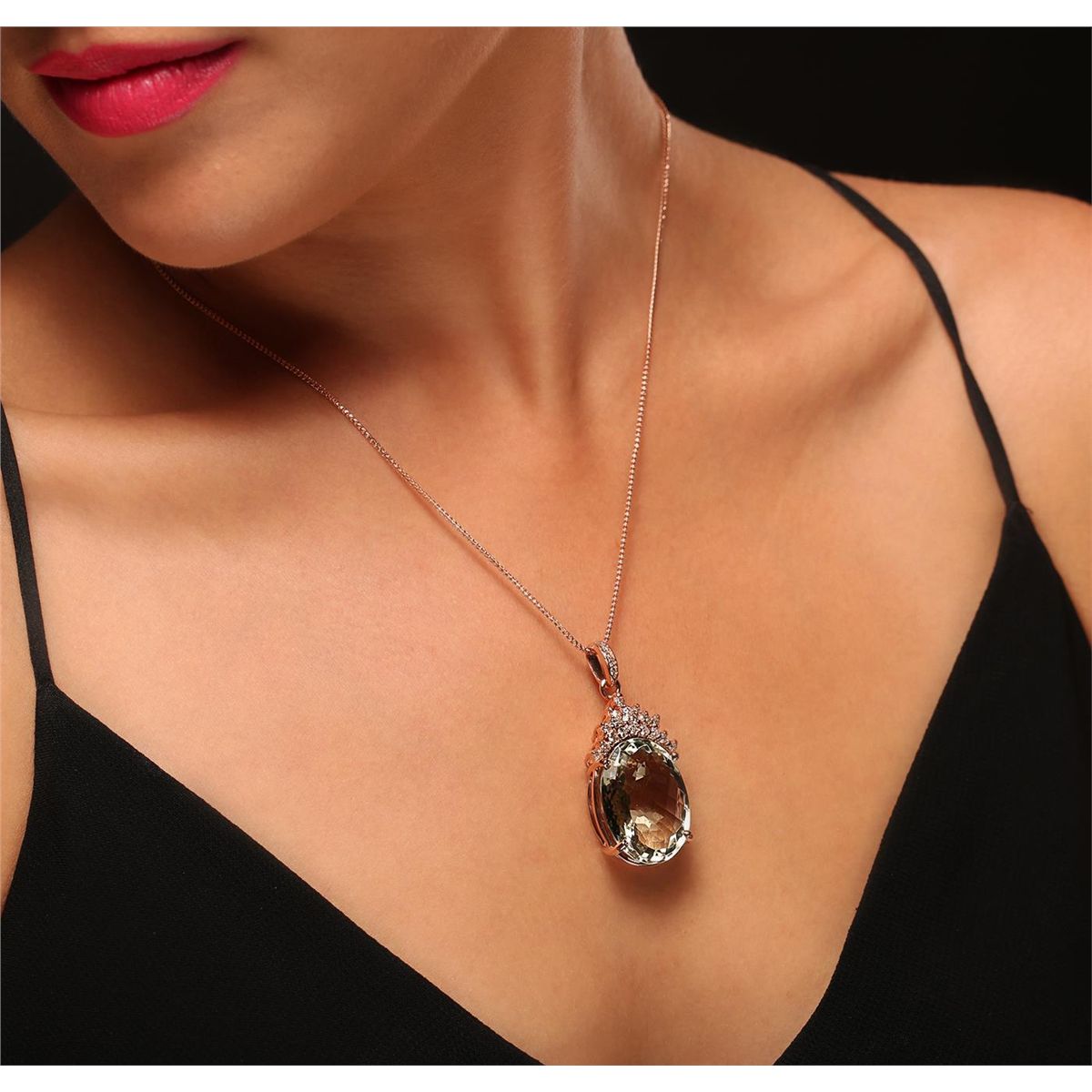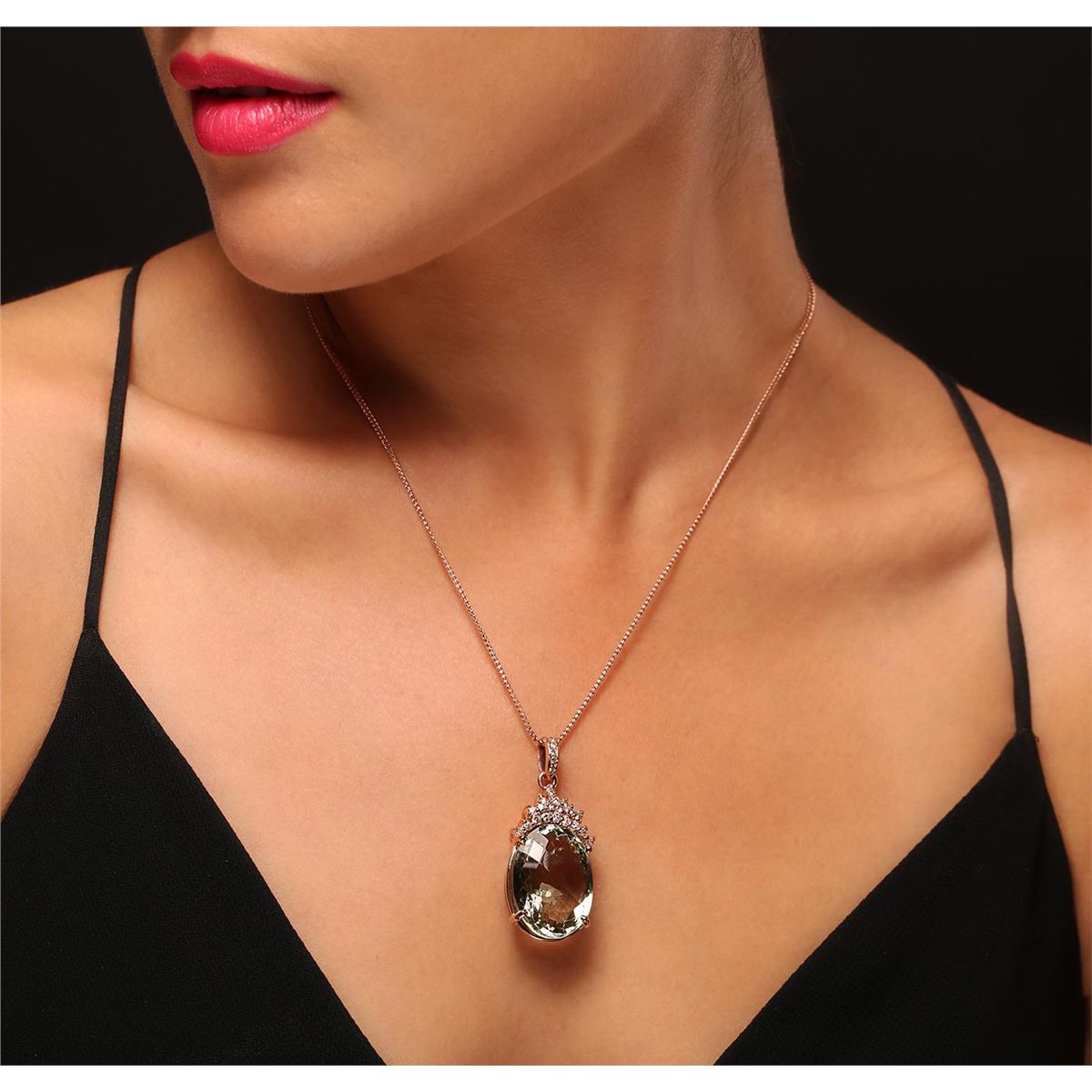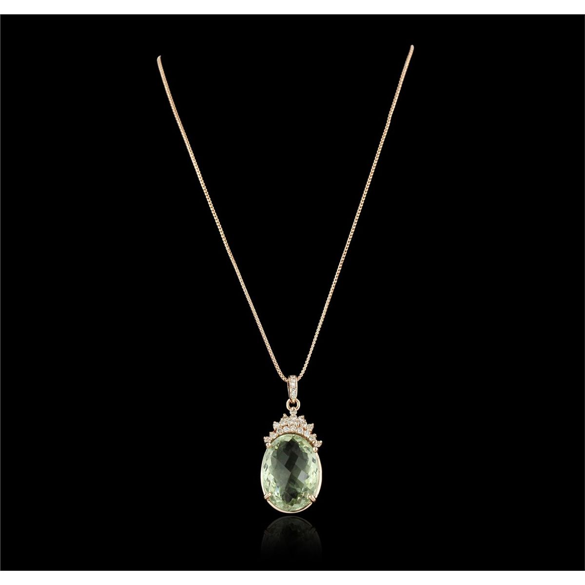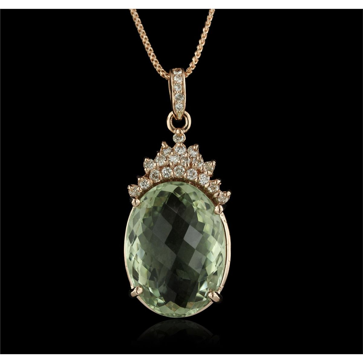 One electronically tested 14KT rose gold Ladies combination cast & die struck pendant & chain 17.0" long, medium fancy cable link with a lobster claw clasp with a bright polish finish. Condition is new. Identified with markings of "14K". Containing: Twenty-Four prong set round brilliant cut diamonds, measuring 2.50 - 1.50 x 1.20mm (depth est.) approximate. Total Weight of 24 Stones = 0.70ct. Clarity: SI-2 to I-1. Color: H - I, Cut is Good. One prong set checkerboard mixed cut natural greened amethyst, measuring 26.11 x 19.85 x 11.70mm, approximate weight of 31.81ct., clarity is eye clean, light, very slightly grayish, green color, (GIA G 3/3), cut is very good. Colored gemstones are presumed to have been subjected to commonly used and possible undetectable color/clarity enhancement processes. Total Weight of Colored Stones 31.81ct. Total Weight of Diamonds 0.70ct. Total Weight of Pendant & Chain 18.50gm. GGL Appraised at $10,485.00.