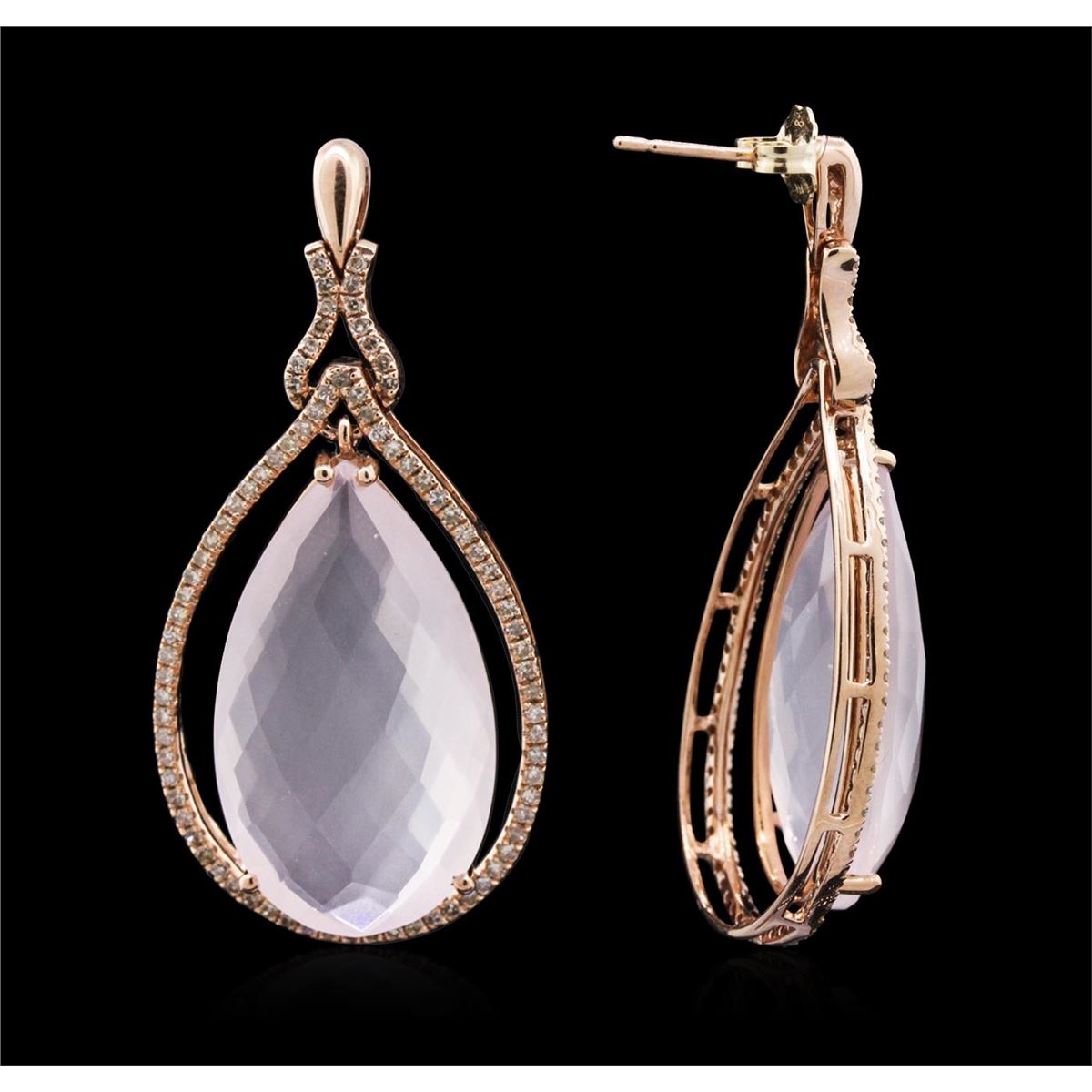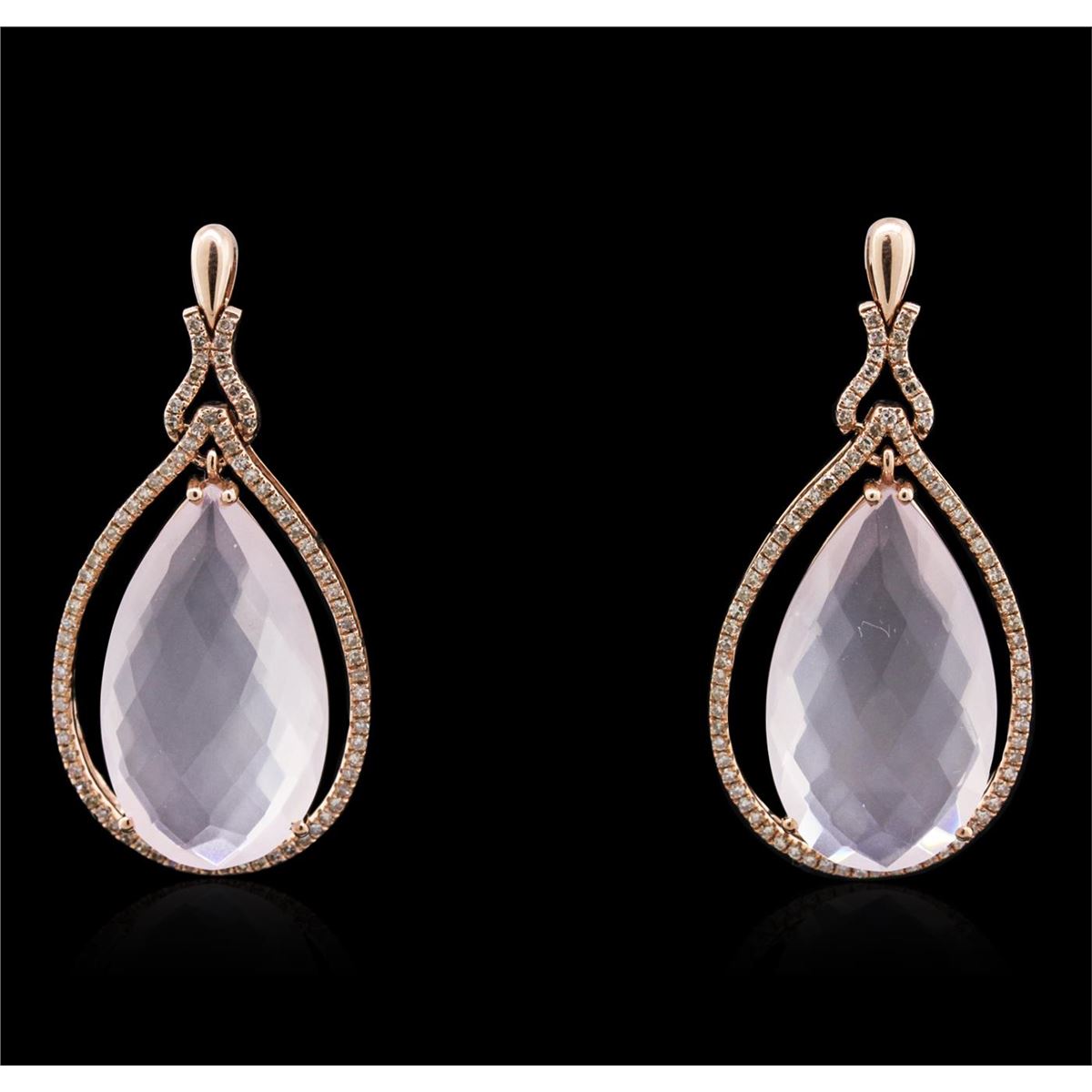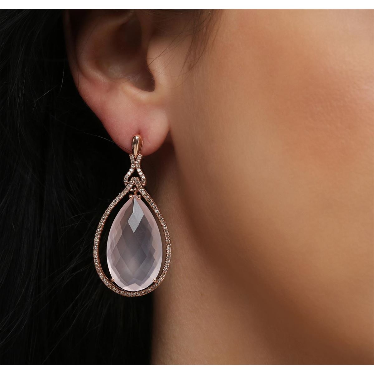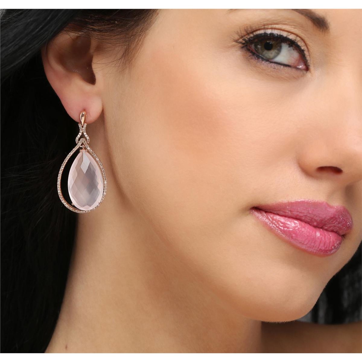 One pair of earrings featuring: 14KT rose gold weighing 13.30 grams containing two pink quartz with a total weight of 35.17cts and diamonds with a total weight of 0.84cts.