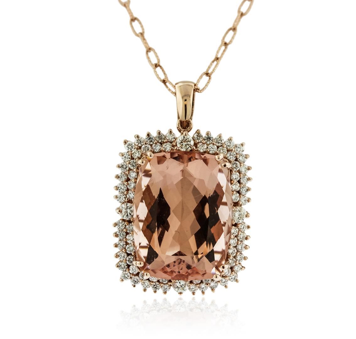One electronically tested 14KT rose gold ladies cast morganite and diamond pendant & chain 18.0" long, cable link with a lobster claw clasp with a bright polish finish. Identified with markings of "14K". Condition is new. Containing: One prong set rectangular cushion modified mixed cut natural morganite, measuring 24.27 x 18.68 x 12.60mm, approximate weight of 36.51ct., clarity is eye clean, type I, light, brownish, reddish orange color, (GIA rO 3/1), cut is good. Four prong set round brilliant cut diamonds, measuring 3.30 - 3.30 x 1.98mm (depth est.) approximate total weight of 4 Stones = 0.53ct. Clarity: SI-1 to I-1. Color: I - J, Cut is Good. Seventy-Two prong set round brilliant cut diamonds, measuring 1.80 - 1.80 x 1.08mm (depth est.) approximate total weight of 72 Stones = 1.53ct. Clarity: SI-1 to SI-2. Color: I - J, Cut is Good. Colored gemstones are presumed to have been subjected to commonly used enhancement processes. All diamonds and colored gemstones are graded in the mounting, unless otherwise stated. Total Weight of Colored Stones 36.51ct. Total Weight of Diamonds 2.06ct. Total Weight of Pendant & Chain 24.60 grams. GGL Appraised at $13,165.00.