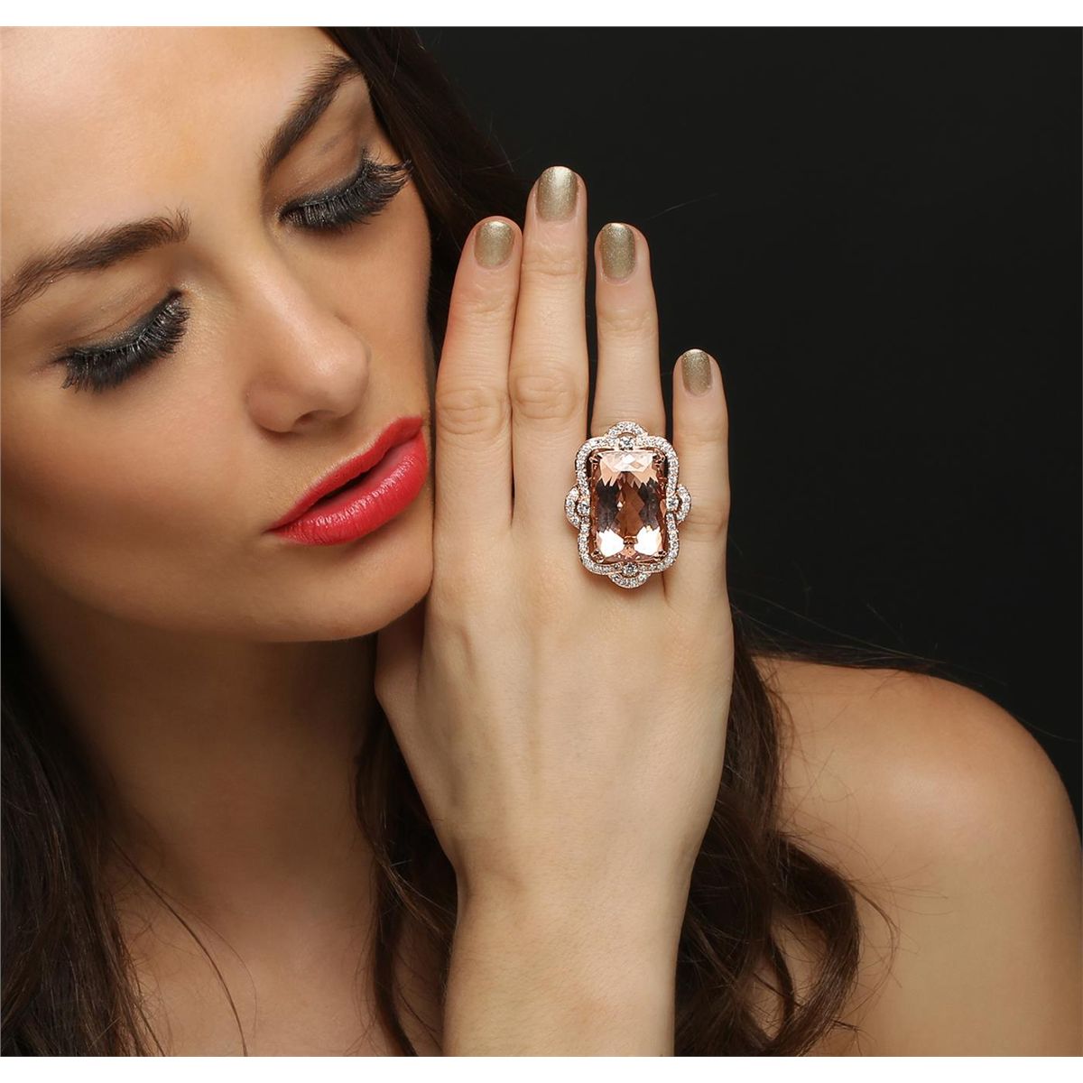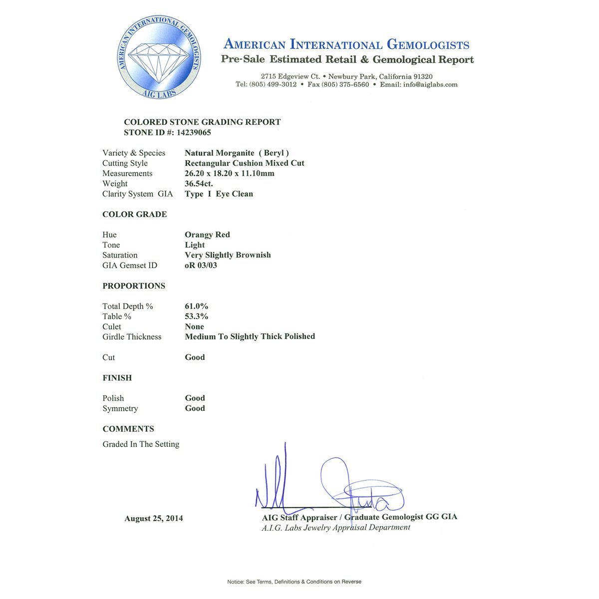 One electronically tested 14KT rose gold ladies cast morganite and diamond ring with a bright polish finish. The featured morganite is set within a stylized diamond bezel, completed by a three and one-half millimeter wide band. Identified with markings of "14K". Condition is new, good workmanship. Containing: One prong set rectangular cushion mixed cut natural morganite, measuring 26.20 x 18.20 x 11.10mm, 8% bulge factor, approximate weight of 36.54ct., clarity is eye clean, type I, light, very slightly brownish, orangy red color, (GIA oR 3/3), cut is good. Transmitting light with no distortion, transparent. Colored Stone Grading Report attached. Graded in the setting. Four prong set round brilliant cut diamonds, measuring 3.40 - 3.30 x 2.01mm (depth est.) approximate total weight of 4 Stones = 0.60ct. Graded in the setting. Clarity: SI-2 to I-1. Color: G - H Fifty-Two bead set round brilliant cut diamonds, measuring 2.00 - 1.90 x 1.17mm (depth est.) approximate total weight of 52 Stones = 1.50ct. Graded in the setting. Clarity: SI-1 to I-1. Color: G - I. Total Weight of Colored Stones 36.54ct. Total Weight of Diamonds 2.10ct. Total Weight of Ring 19.86 grams. AIG Appraised at $33,440.00.
