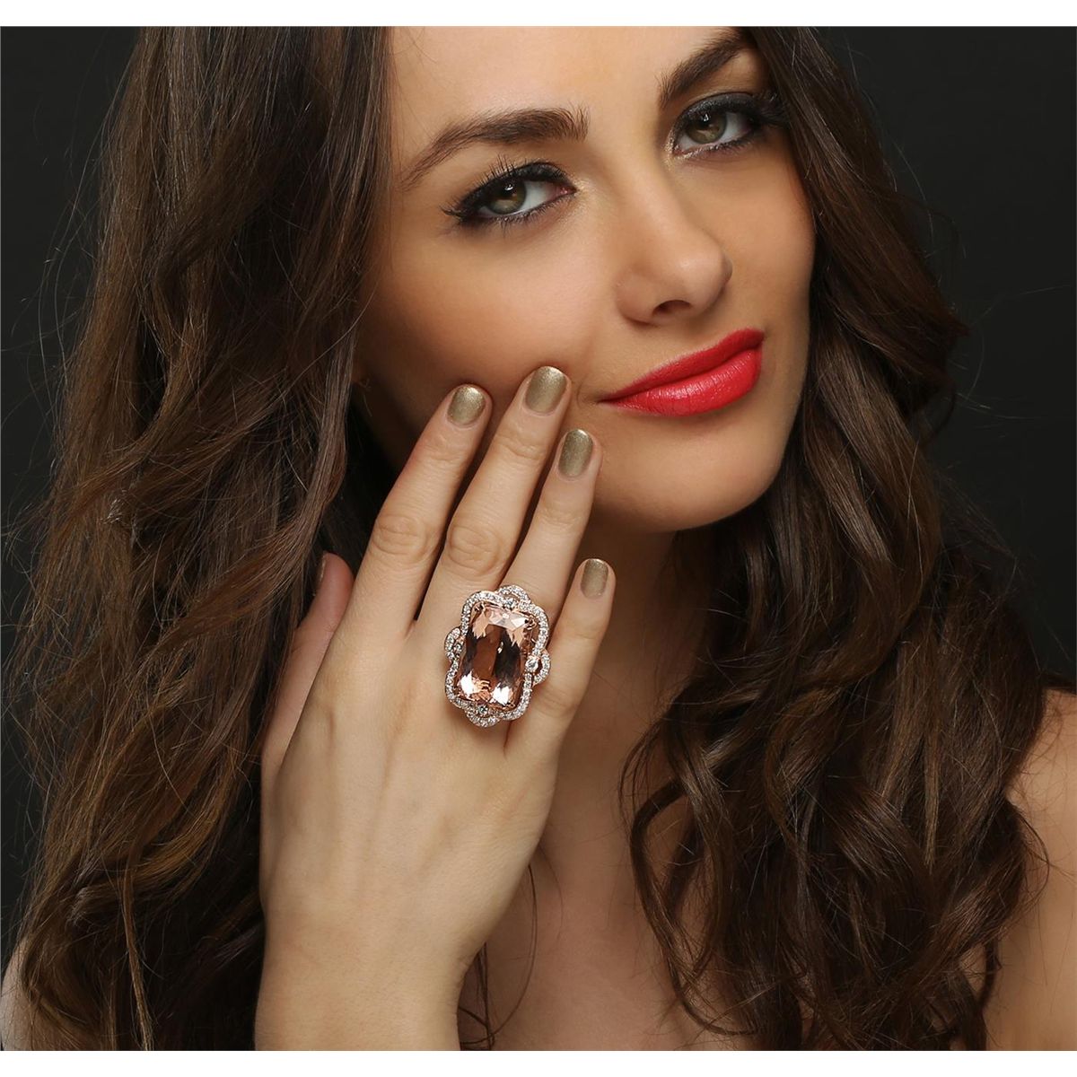 One electronically tested 14KT rose gold ladies cast morganite and diamond ring with a bright polish finish. The featured morganite is set within a stylized diamond bezel, completed by a three and one-half millimeter wide band. Identified with markings of "14K". Condition is new, good workmanship. Containing: One prong set rectangular cushion mixed cut natural morganite, measuring 26.20 x 18.20 x 11.10mm, 8% bulge factor, approximate weight of 36.54ct., clarity is eye clean, type I, light, very slightly brownish, orangy red color, (GIA oR 3/3), cut is good. Transmitting light with no distortion, transparent. Colored Stone Grading Report attached. Graded in the setting. Four prong set round brilliant cut diamonds, measuring 3.40 - 3.30 x 2.01mm (depth est.) approximate total weight of 4 Stones = 0.60ct. Graded in the setting. Clarity: SI-2 to I-1. Color: G - H Fifty-Two bead set round brilliant cut diamonds, measuring 2.00 - 1.90 x 1.17mm (depth est.) approximate total weight of 52 Stones = 1.50ct. Graded in the setting. Clarity: SI-1 to I-1. Color: G - I. Total Weight of Colored Stones 36.54ct. Total Weight of Diamonds 2.10ct. Total Weight of Ring 19.86 grams. AIG Appraised at $33,440.00.