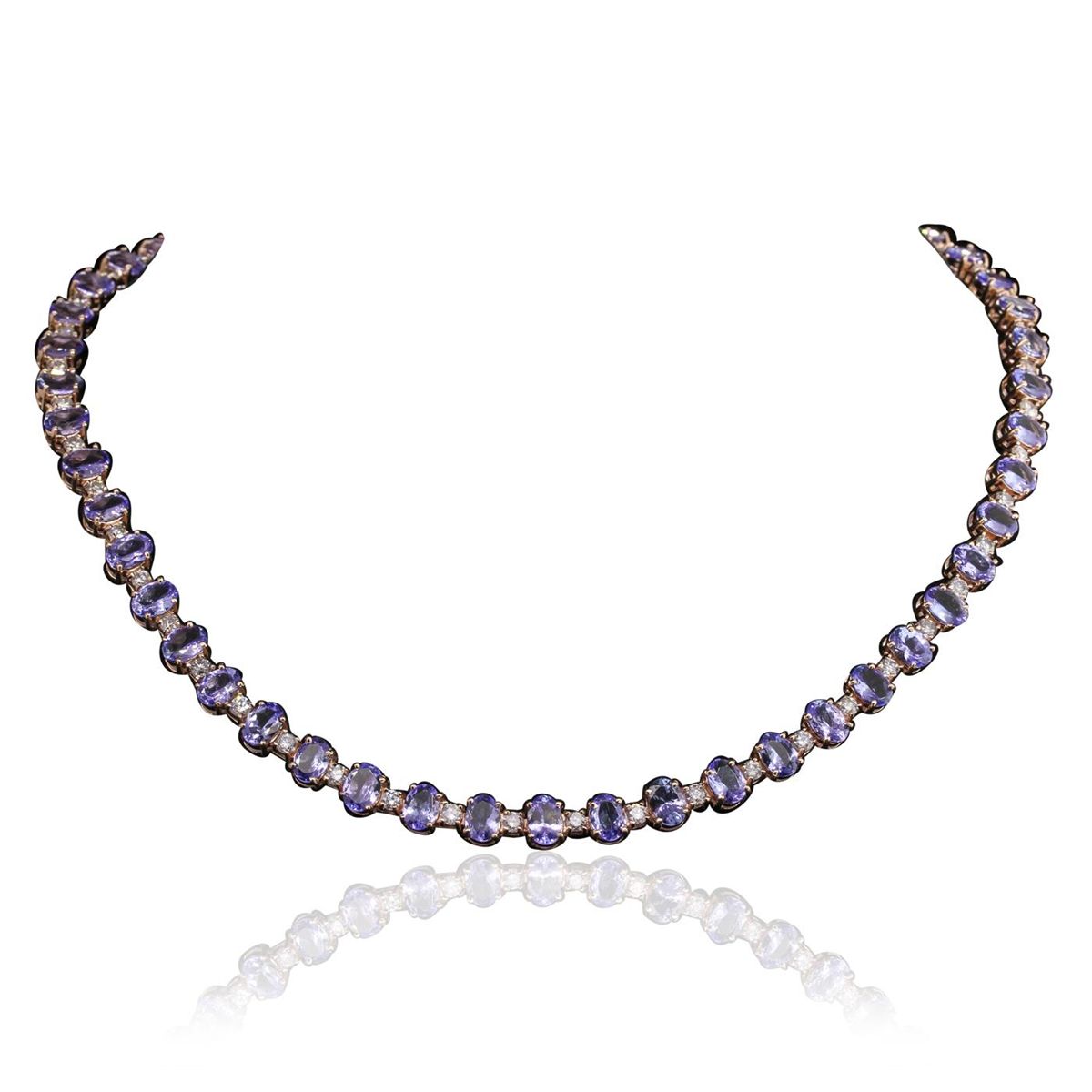 One electronically tested 14KT rose gold Ladies combination cast & assembled necklace with a hidden box clasp with a bright polish finish. Condition is new. Measurements: 17.75" in length. Identified with markings of "14K". Containing: Fifty-two prong set oval modified brilliant cut natural tanzanites, measuring 6.86 x 4.90 x 2.60mm, approximate. Total Weight of 38.17ct., clarity is eye clean, type I, medium light, very slightly grayish, violet color, (GIA V 4/3), cut is very good. Colored gemstones are presumed to have been subjected to commonly used color/clarity enhancement processes. Fifty-Two prong set round brilliant cut diamonds, measuring 3.00 - 3.00 x 1.80mm (depth est.) approximate. Total Weight of 52 Stones = 5.62ct. Clarity: I-2 to I-3. Color: I - J, Cut is Good. Total Weight of Colored Stones 38.17ct. Total Weight of Diamonds 5.62ct. Total Weight of Necklace 45.30 grams. GGL Appraised at $54,840.00.
