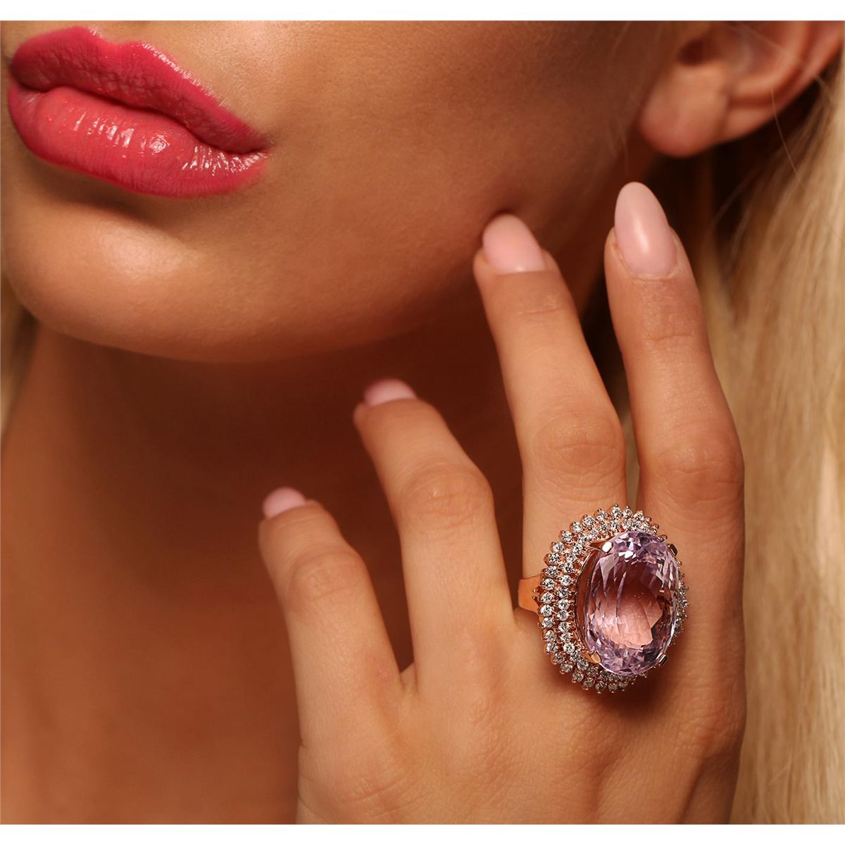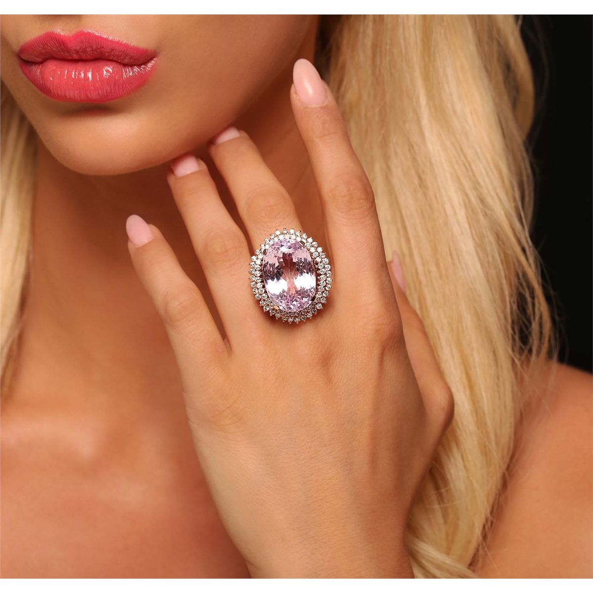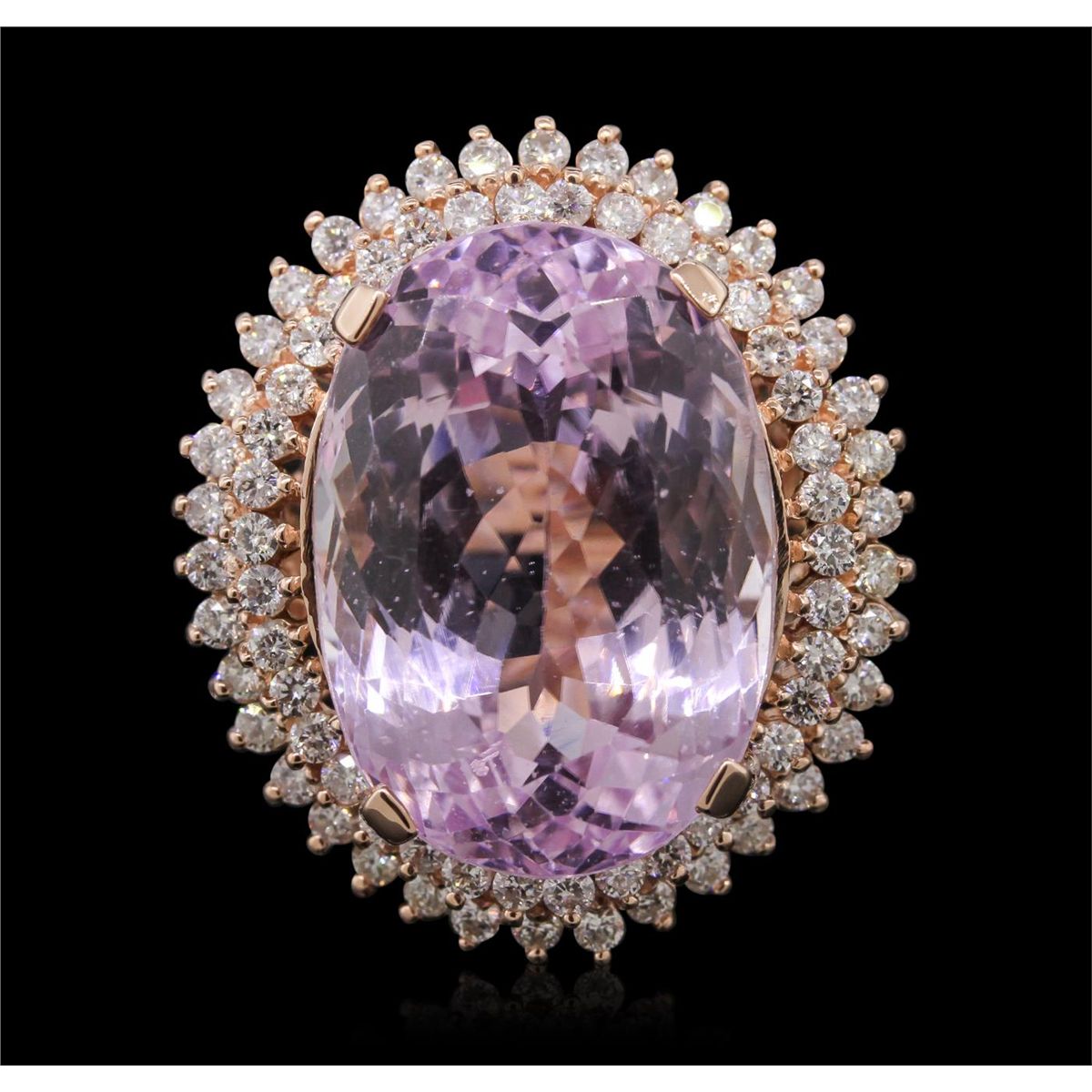 One electronically tested 14KT rose gold ladies cast kunzite and diamond ring with a bright polish finish. Condition is new, good workmanship. The featured kunzite is set within two stylized tiered diamond bezels supported by split shoulders, completed by a four millimeter wide band. Identified with markings of "K14". Containing: One prong set oval modified brilliant cut natural kunzite, measuring 23.29 x 16.31 x 13.19mm, exact weight 39.46ct., type I Clarity is slightly included, medium, very slightly grayish, Purple-Pink, (GIA PPi 5/3), cut is good. Transmitting light with no distortion, transparent. Naturally occurring internal & external characteristics are present. GIA Gemological Report attached. Graded loose prior to setting in the GIA Laboratory, Report #6157953494.Seventy-Three prong set round brilliant cut diamonds, measuring 1.90 - 1.80 x 1.11mm (depth est.) approximate. Total Weight of 73 Stones = 1.78ct. Graded in the setting. Clarity: SI-1 to I-1. Color: G - I. Total Weight of Colored Stones 39.46ct. Total Weight of Diamonds 1.78ct. Total Weight of Ring 19.46 grams. AIGAppraised at $19,015.00.