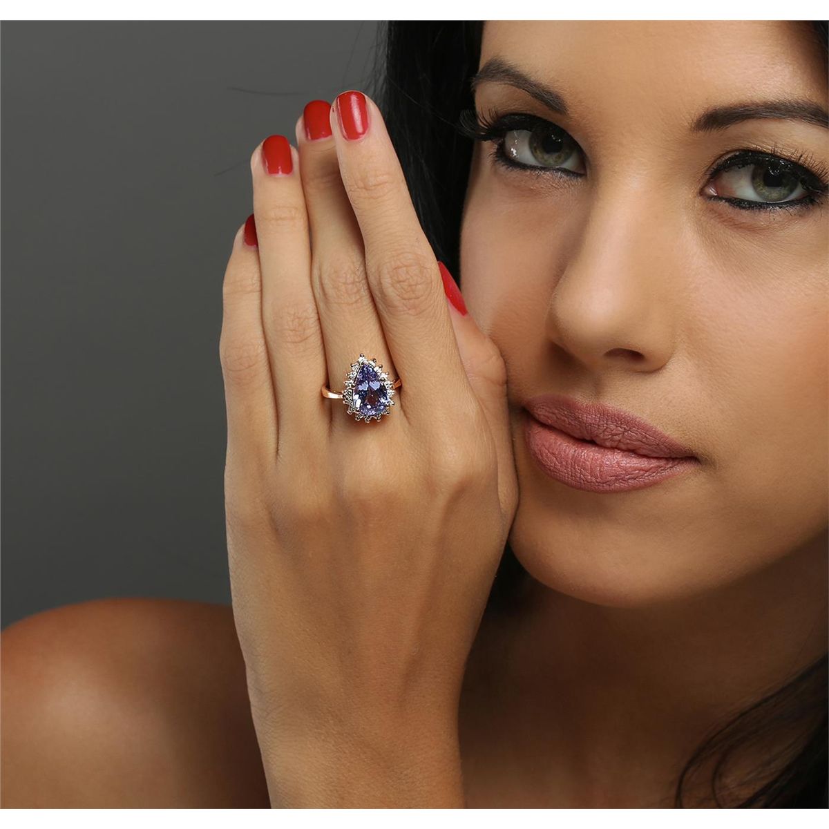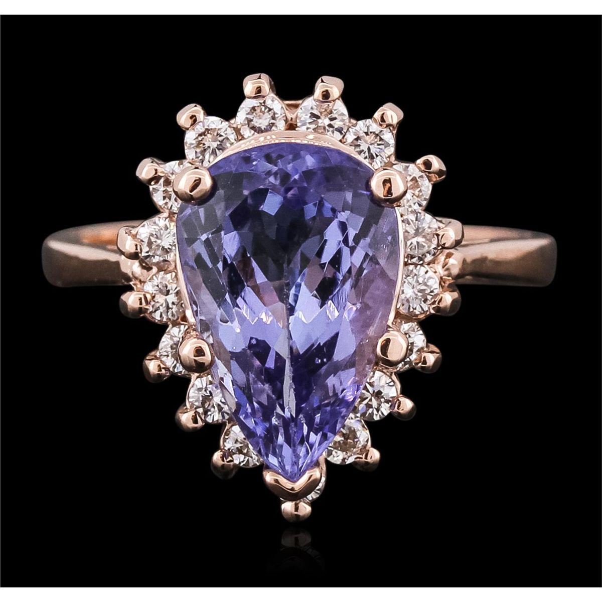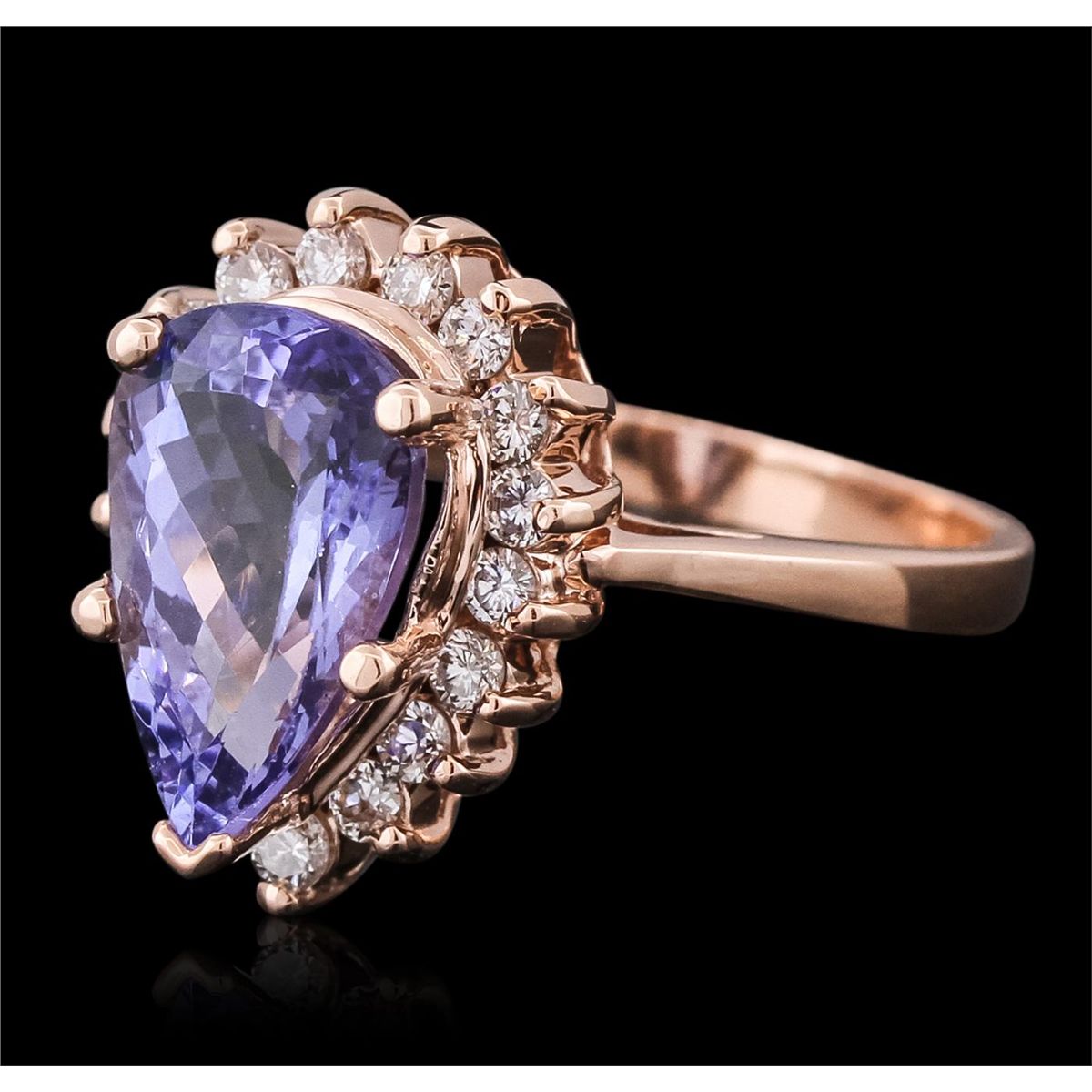 One electronically tested 14KT rose gold ladies combination cast & assembled ring with a bright polish finish. Identified with markings of "14K". Condition is new. Containing: One prong set pear modified brilliant cut natural tanzanite, measuring 12.50 x 8.20 x 5.89mm, approximate weight of 4.04ct., clarity is eye clean, type I, medium light, very slightly grayish, bluish violet color, (GIA bV 4/3), cut is good. Seventeen prong set round brilliant cut diamonds, measuring 1.80 - 1.80 x 1.08mm (depth est.) approximate total weight of 17 Stones = 0.36ct. Clarity: SI-1. Color: J - K, Cut is Good. Colored gemstones are presumed to have been subjected to commonly used enhancement processes. All diamonds and colored gemstones are graded in the mounting, unless otherwise stated. Total Weight of Colored Stones 4.04ct. Total Weight of Diamonds 0.36ct. Total Weight of Ring 5.90 grams. GGL Appraised at $7,350.00.