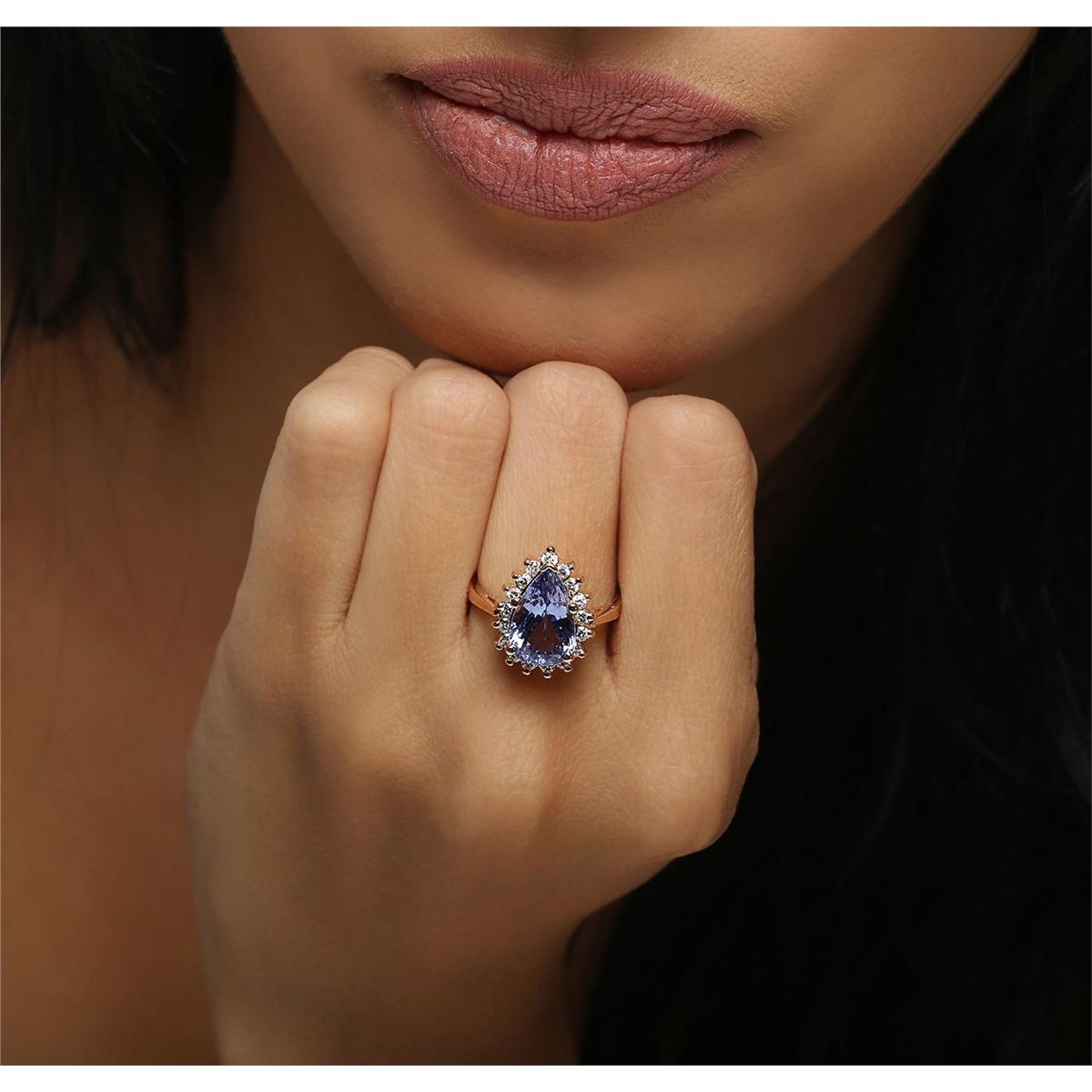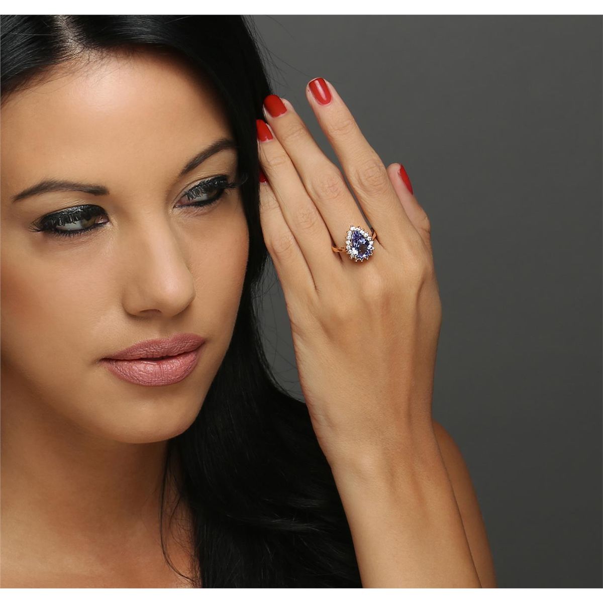 One electronically tested 14KT rose gold ladies combination cast & assembled ring with a bright polish finish. Identified with markings of "14K". Condition is new. Containing: One prong set pear modified brilliant cut natural tanzanite, measuring 12.50 x 8.20 x 5.89mm, approximate weight of 4.04ct., clarity is eye clean, type I, medium light, very slightly grayish, bluish violet color, (GIA bV 4/3), cut is good. Seventeen prong set round brilliant cut diamonds, measuring 1.80 - 1.80 x 1.08mm (depth est.) approximate total weight of 17 Stones = 0.36ct. Clarity: SI-1. Color: J - K, Cut is Good. Colored gemstones are presumed to have been subjected to commonly used enhancement processes. All diamonds and colored gemstones are graded in the mounting, unless otherwise stated. Total Weight of Colored Stones 4.04ct. Total Weight of Diamonds 0.36ct. Total Weight of Ring 5.90 grams. GGL Appraised at $7,350.00.