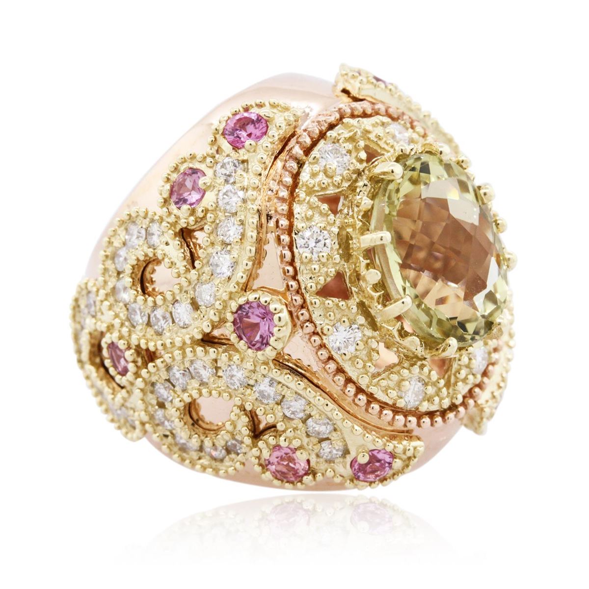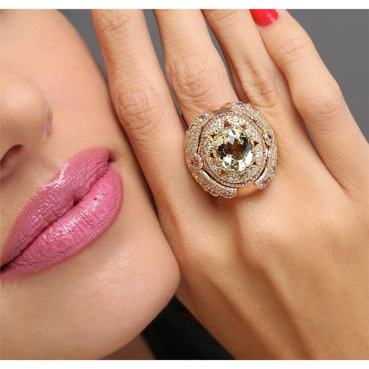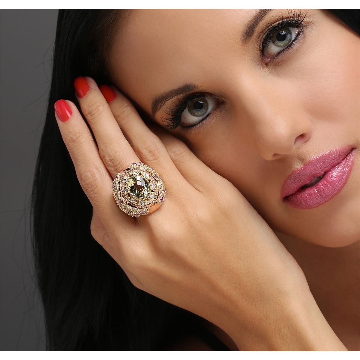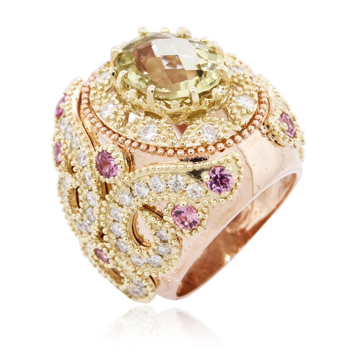 One electronically tested 14KT rose gold ladies combination cast & assembled citrine, amethyst and diamond ring with a bright polish finish. Condition is new. Containing: One prong set oval modified mixed cut natural citrine quartz, measuring 12.45 x 8.95 x 6.50mm, approximate weight of 4.05ct., clarity is eye clean, type I, medium light, brownish, yellowish green color, (GIA Y 4/3), cut is good. Ten gypsy set round modified brilliant cut natural amethysts, measuring 3.00 - 3.00 x 1.95 mm, approximate total weight of 0.90ct., clarity is eye clean, type II, medium, moderately strong, purple color, (GIA P 5/4), cut is good. Seventy prong set round brilliant cut diamonds, measuring 2.00 - 2.00 x 1.20mm (depth est.) approximate total weight of 70 Stones = 2.04ct. Clarity: SI-2 to I-1. Color: I - J, Cut is Good. Colored gemstones are presumed to have been subjected to commonly used enhancement processes. All diamonds and colored gemstones are graded in the mounting, unless otherwise stated. Total Weight of Colored Stones 4.95ct. Total Weight of Diamonds 2.04ct. Total Weight of Ring 21.50 grams. GGL Appraised at $7,855.00.