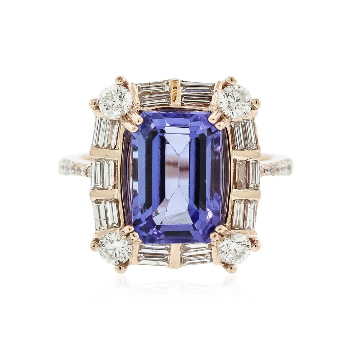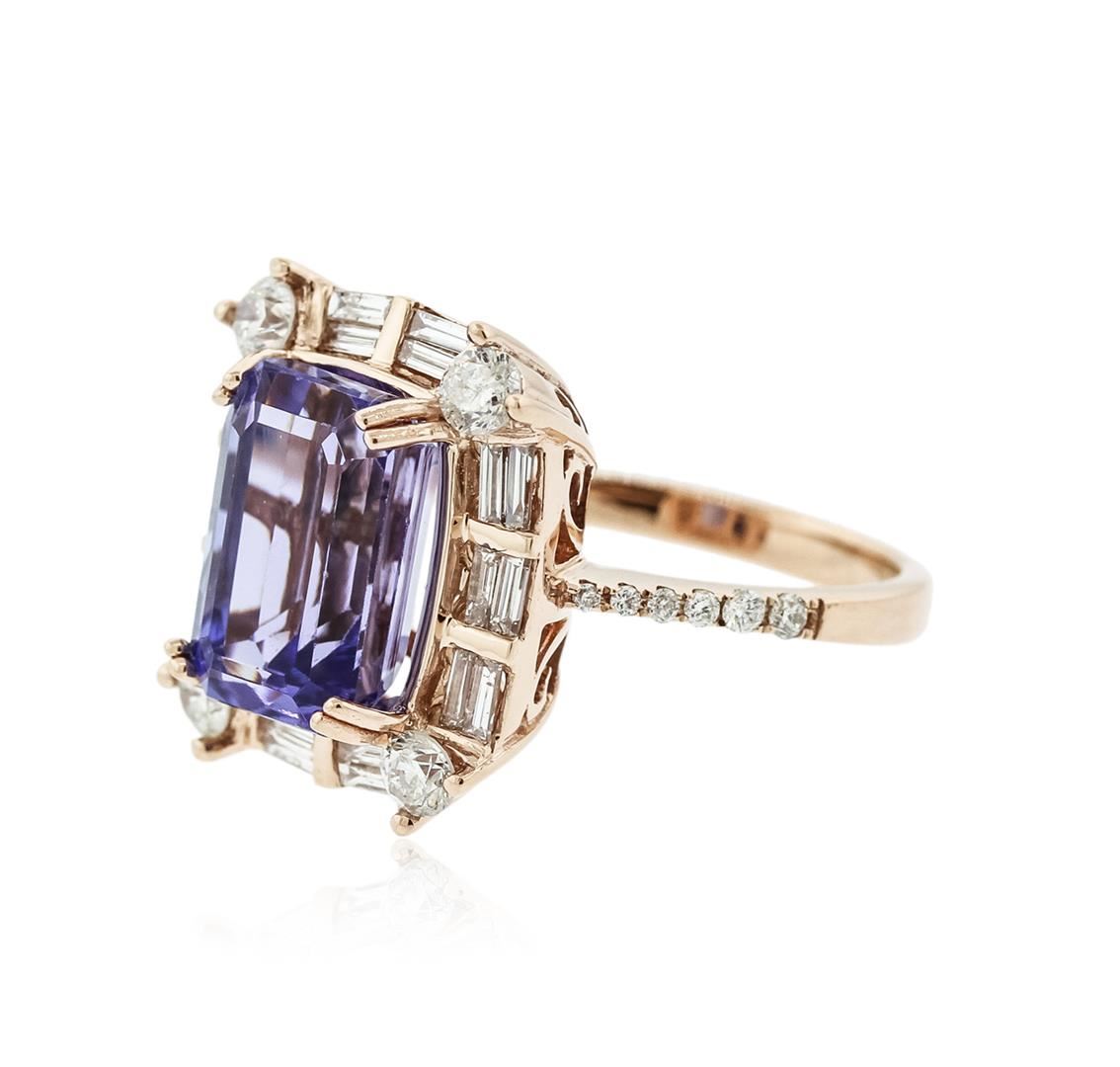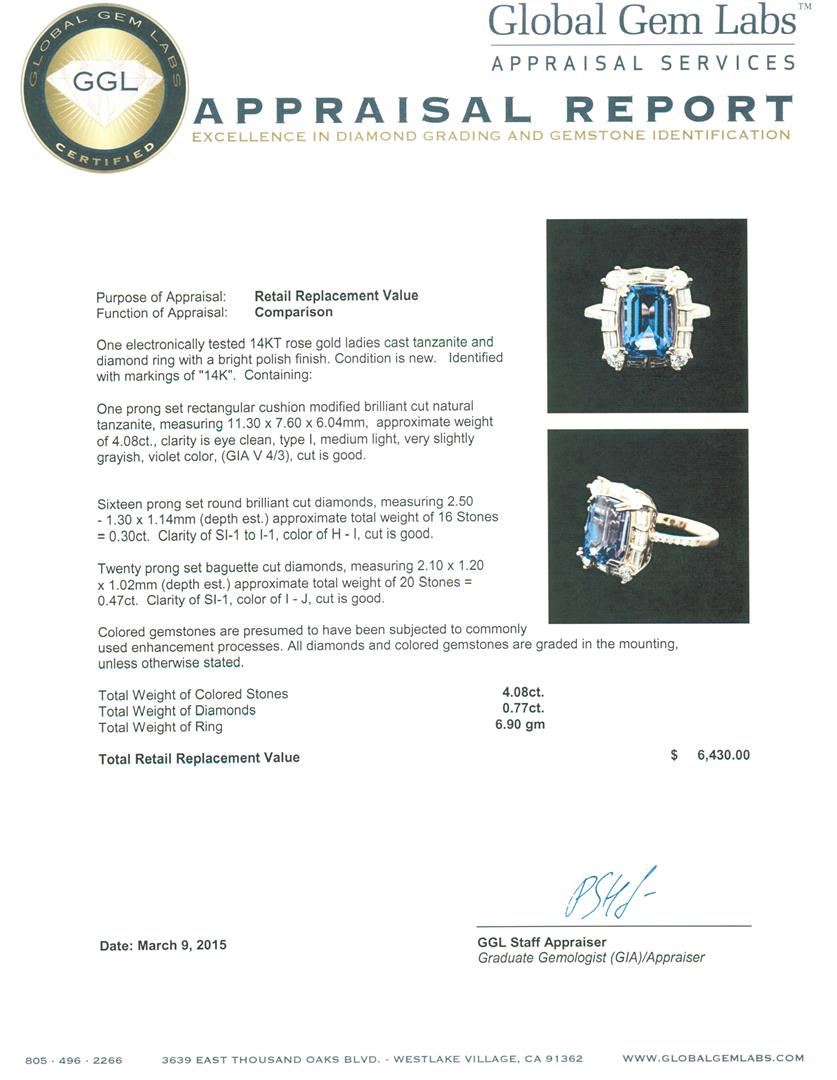 One electronically tested 14KT rose gold ladies cast tanzanite and diamond ring with a bright polish finish. Identified with markings of "14K". Condition is new. Containing: One prong set rectangular cushion modified brilliant cut natural tanzanite, measuring 11.30 x 7.60 x 6.04mm, approximate weight of 4.08ct., clarity is eye clean, type I, medium light, very slightly grayish, violet color, (GIA V 4/3), cut is good. Sixteen prong set round brilliant cut diamonds, measuring 2.50 - 1.30 x 1.14mm (depth est.) approximate total weight of 16 Stones = 0.30ct. Clarity: SI-1 to I-1. Color: H - I, Cut is Good. Twenty prong set baguette cut diamonds, measuring 2.10 x 1.20 x 1.02mm (depth est.) approximate total weight of 20 Stones = 0.47ct. Clarity: SI-1. Color: I - J, Cut is Good. Colored gemstones are presumed to have been subjected to commonly used enhancement processes. All diamonds and colored gemstones are graded in the mounting, unless otherwise stated. Total Weight of Colored Stones 4.08ct. Total Weight of Diamonds 0.77ct. Total Weight of Ring 6.90 grams. GGL Appraised at $6,430.00.