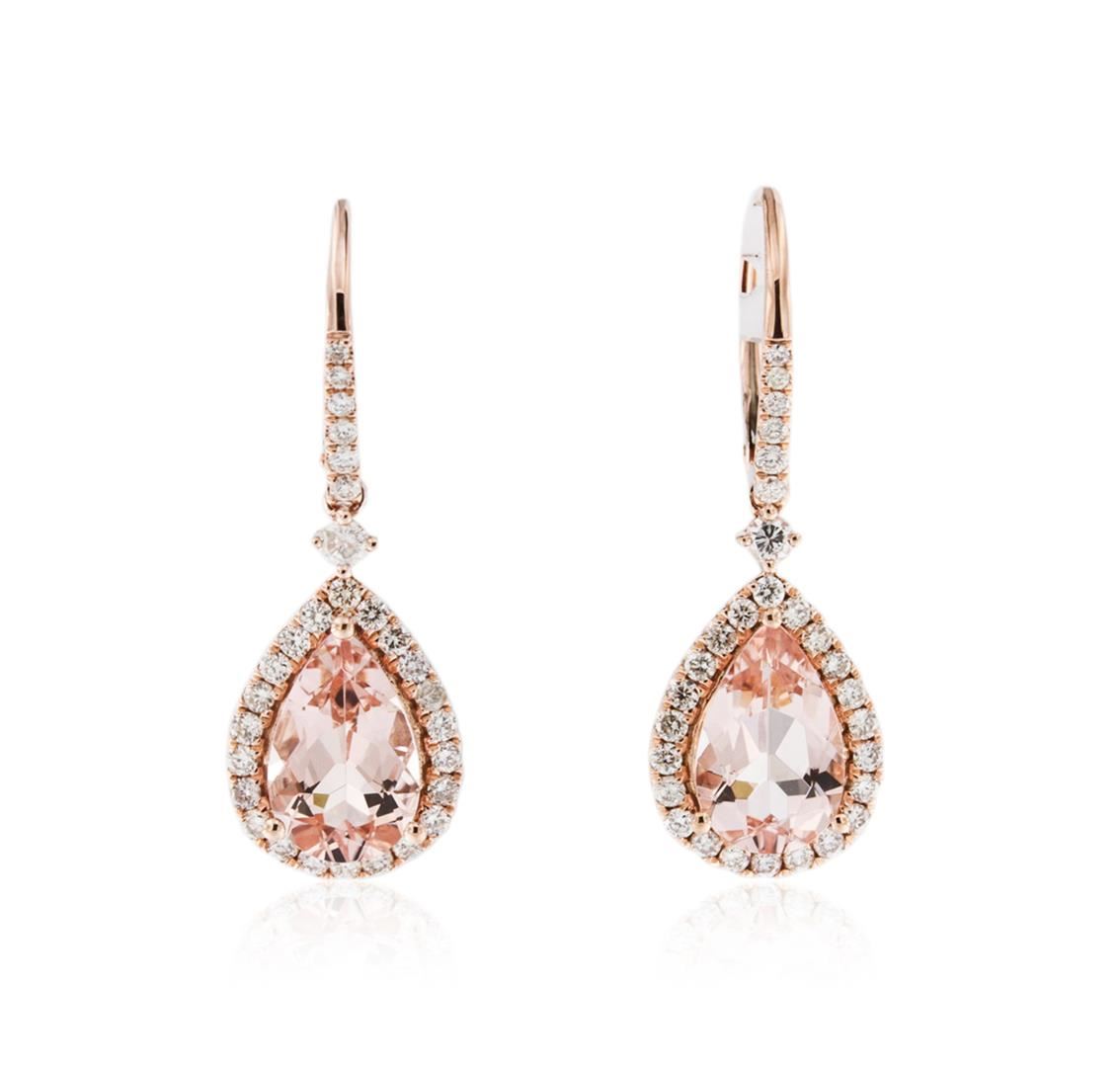 One pair of earrings featuring: 14KT rose gold weighing 3.49 grams containing two morganites with a total weight of 4.11ct and 58 round diamonds with a total weight of 0.84ct.