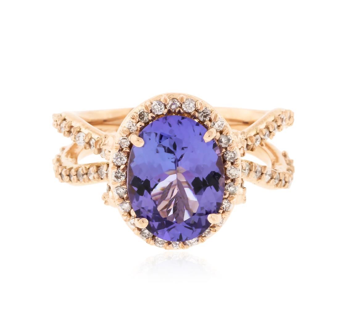 One electronically tested 14KT rose gold ladies cast tanzanite and diamond ring with a bright polish finish. Identified with markings of "14K". Condition is new. Containing: One prong set oval oval modified brilliant cut natural tanzanite, measuring 10.90 x 8.27 x 6.84mm, approximate weight of 4.34ct., clarity is eye clean, type I, medium light, very slightly grayish, violet color, (GIA V 4/3), cut is good. Ninety prong set round brilliant cut diamonds, measuring 1.20 - 1.20 x 0.72mm (depth est.) approximate total weight of 90 Stones = 0.57ct. Clarity: SI-2 to I-2. Color: J - K, Cut is Good. Colored gemstones are presumed to have been subjected to commonly used enhancement processes. All diamonds and colored gemstones are graded in the mounting, unless otherwise stated. Total Weight of Colored Stones 4.34ct. Total Weight of Diamonds 0.57ct. Total Weight of Ring 6.50 grams. GGL Appraised at $4,545.00.