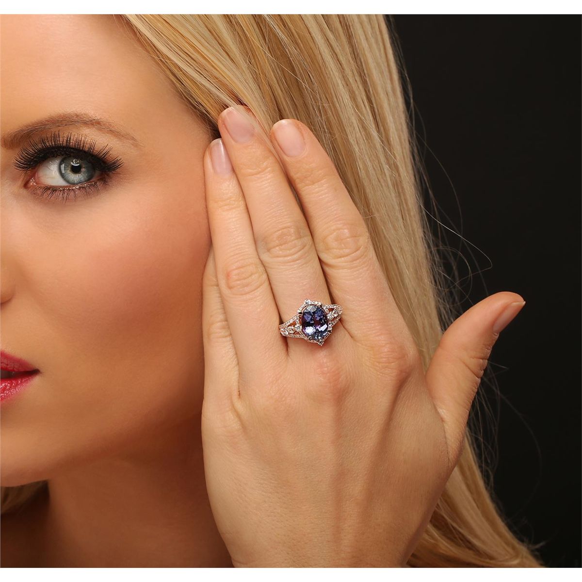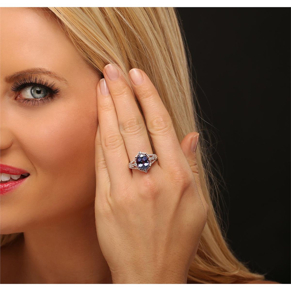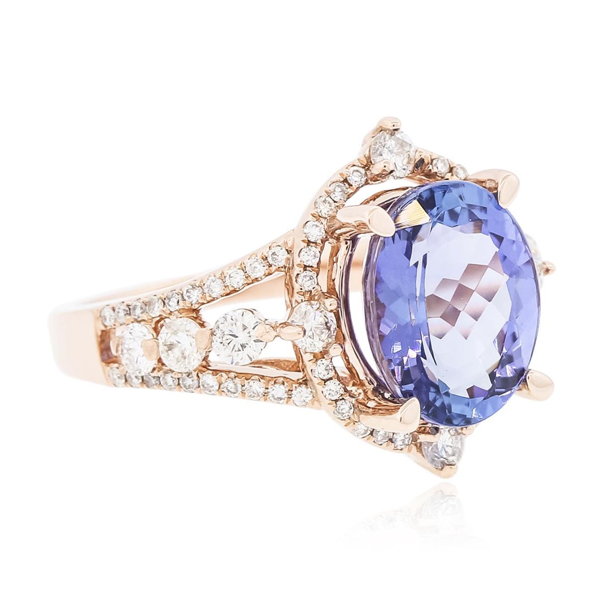One electronically tested 14KT rose gold ladies cast tanzanite and diamond ring with a bright polish finish. Condition is new, good workmanship. The featured tanzanite is set within a diamond bezel supported by elaborate diamond set split shoulders, completed by a one and one-half millimeter wide band. Trademark is PMI. Identified with markings of "14K". Containing: One prong set oval mixed cut natural tanzanite, measuring 11.20 x 8.95 x 6.10mm, 8%. bulge factor, approximate weight of 4.48ct., clarity is eye clean, type I, medium dark, very slightly grayish, bluish violet color, (GIA bV 6/3), cut is good. Transmitting light with no distortion, transparent. Graded in the setting. Tanzanite is a very rare gemstone that is only found in the country of Tanzania. Originally discovered in 1967. Tiffany & Company, named the stone Tanzanite. It is found in the Usumburu Mountains that border the Umba Valley of northern Tanzania. Tanzanite occurs in gray, brown, violet, blue, reddish-purple, & green. The gem is interesting because of its exceptional pleochroism. Rotated in different directions a tanzanite will exhibit multiple changes of color. Tanzanite has a low tolerance to ultrasonic cleaning, and should not be cleaned using this method. Ten prong set round brilliant cut diamonds, measuring 2.60 - 2.40 x 1.50mm (depth est.) approximate. Total Weight of 10 Stones = 0.67ct. Graded in the setting. Clarity: SI-1 to I-1. Color: H - J Sixty-Four prong set round brilliant cut diamonds, measuring 1.10 - 1.00 x 0.63mm (depth est.) approximate. Total Weight of 64 Stones = 0.36ct. Graded in the setting. Clarity: SI-1 to I-1. Color: G - I. Total Weight of Colored Stones 4.48ct. Total Weight of Diamonds 1.03ct. Total Weight of Ring 6.71 grams. AIG Appraised at $15,745.00.