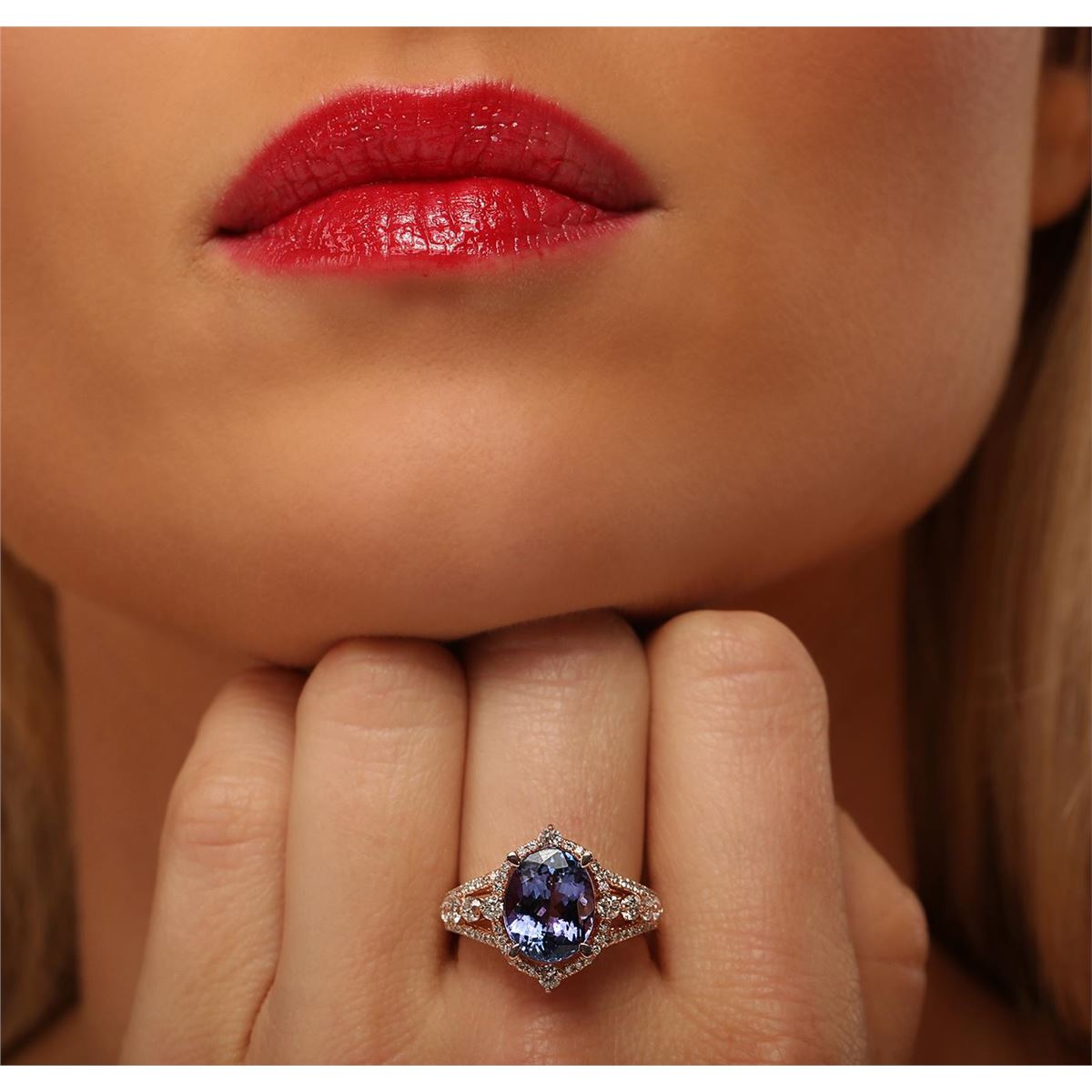 One electronically tested 14KT rose gold ladies cast tanzanite and diamond ring with a bright polish finish. Condition is new, good workmanship. The featured tanzanite is set within a diamond bezel supported by elaborate diamond set split shoulders, completed by a one and one-half millimeter wide band. Trademark is PMI. Identified with markings of "14K". Containing: One prong set oval mixed cut natural tanzanite, measuring 11.20 x 8.95 x 6.10mm, 8%. bulge factor, approximate weight of 4.48ct., clarity is eye clean, type I, medium dark, very slightly grayish, bluish violet color, (GIA bV 6/3), cut is good. Transmitting light with no distortion, transparent. Graded in the setting. Tanzanite is a very rare gemstone that is only found in the country of Tanzania. Originally discovered in 1967. Tiffany & Company, named the stone Tanzanite. It is found in the Usumburu Mountains that border the Umba Valley of northern Tanzania. Tanzanite occurs in gray, brown, violet, blue, reddish-purple, & green. The gem is interesting because of its exceptional pleochroism. Rotated in different directions a tanzanite will exhibit multiple changes of color. Tanzanite has a low tolerance to ultrasonic cleaning, and should not be cleaned using this method. Ten prong set round brilliant cut diamonds, measuring 2.60 - 2.40 x 1.50mm (depth est.) approximate. Total Weight of 10 Stones = 0.67ct. Graded in the setting. Clarity: SI-1 to I-1. Color: H - J Sixty-Four prong set round brilliant cut diamonds, measuring 1.10 - 1.00 x 0.63mm (depth est.) approximate. Total Weight of 64 Stones = 0.36ct. Graded in the setting. Clarity: SI-1 to I-1. Color: G - I. Total Weight of Colored Stones 4.48ct. Total Weight of Diamonds 1.03ct. Total Weight of Ring 6.71 grams. AIG Appraised at $15,745.00.