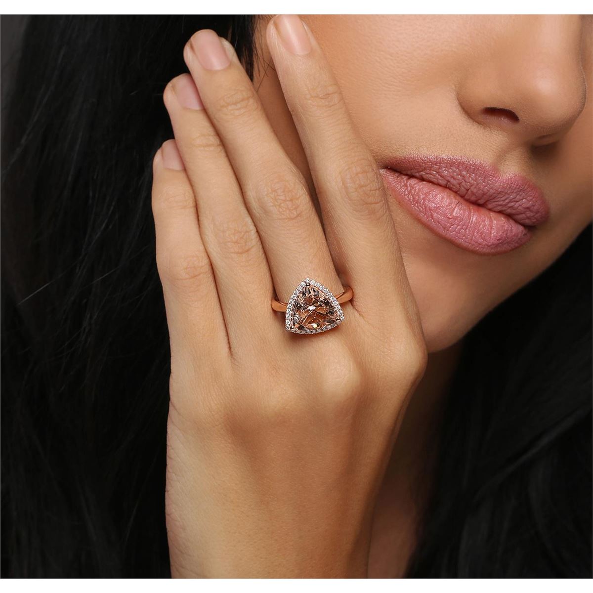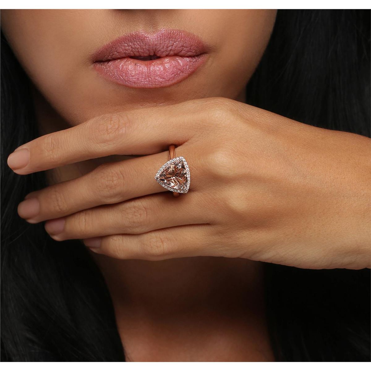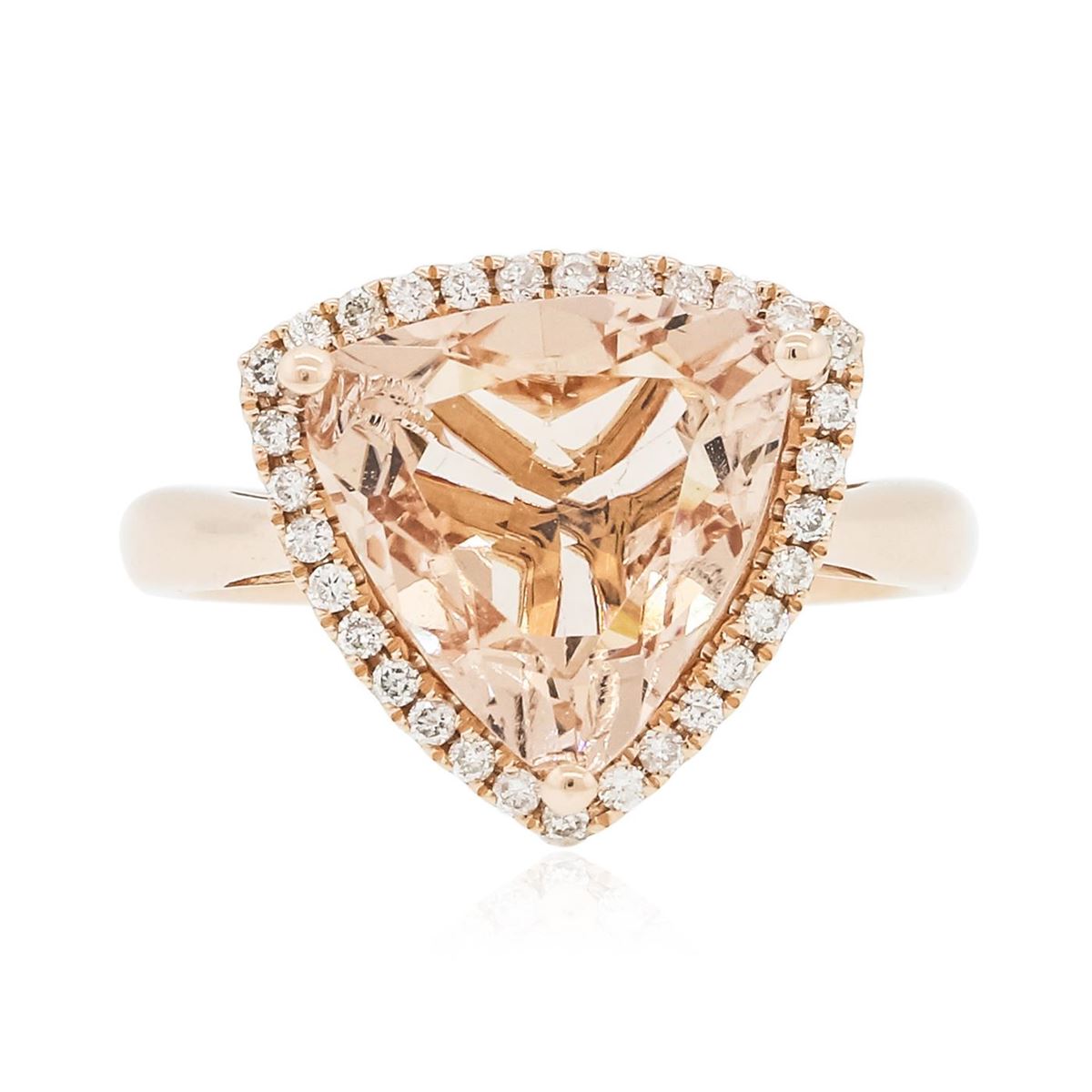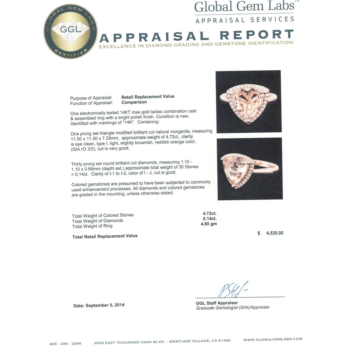 One electronically tested 14KT rose gold ladies combination cast & assembled ring with a bright polish finish. Identified with markings of "14K". Condition is new. Containing: One prong set triangle modified brilliant cut natural morganite, measuring 11.50 x 11.50 x 7.29mm, approximate weight of 4.72ct., clarity is eye clean, type I, light, slightly brownish, reddish orange color, (GIA rO 3/2), cut is very good. Thirty prong set round brilliant cut diamonds, measuring 1.10 - 1.10 x 0.66mm (depth est.) approximate total weight of 30 Stones = 0.14ct. Clarity: I-1 to I-2. Color: I - J, Cut is Good. Colored gemstones are presumed to have been subjected to commonly used enhancement processes. All diamonds and colored gemstones are graded in the mounting, unless otherwise stated. Total Weight of Colored Stones 4.72ct. Total Weight of Diamonds 0.14ct. Total Weight of Ring 4.80 grams. GGL Appraised at $4,535.00.