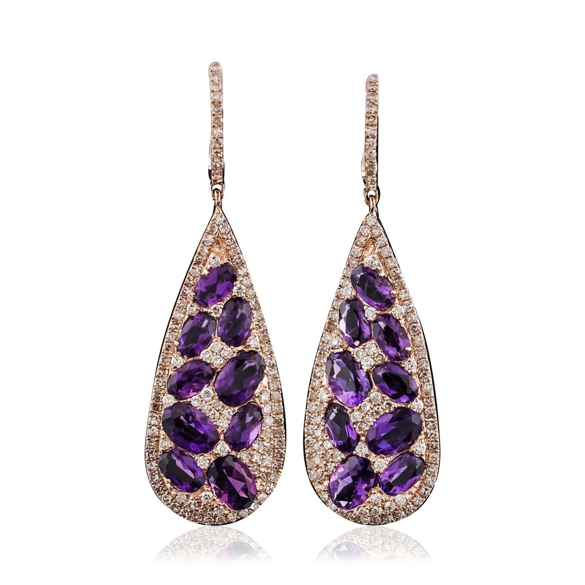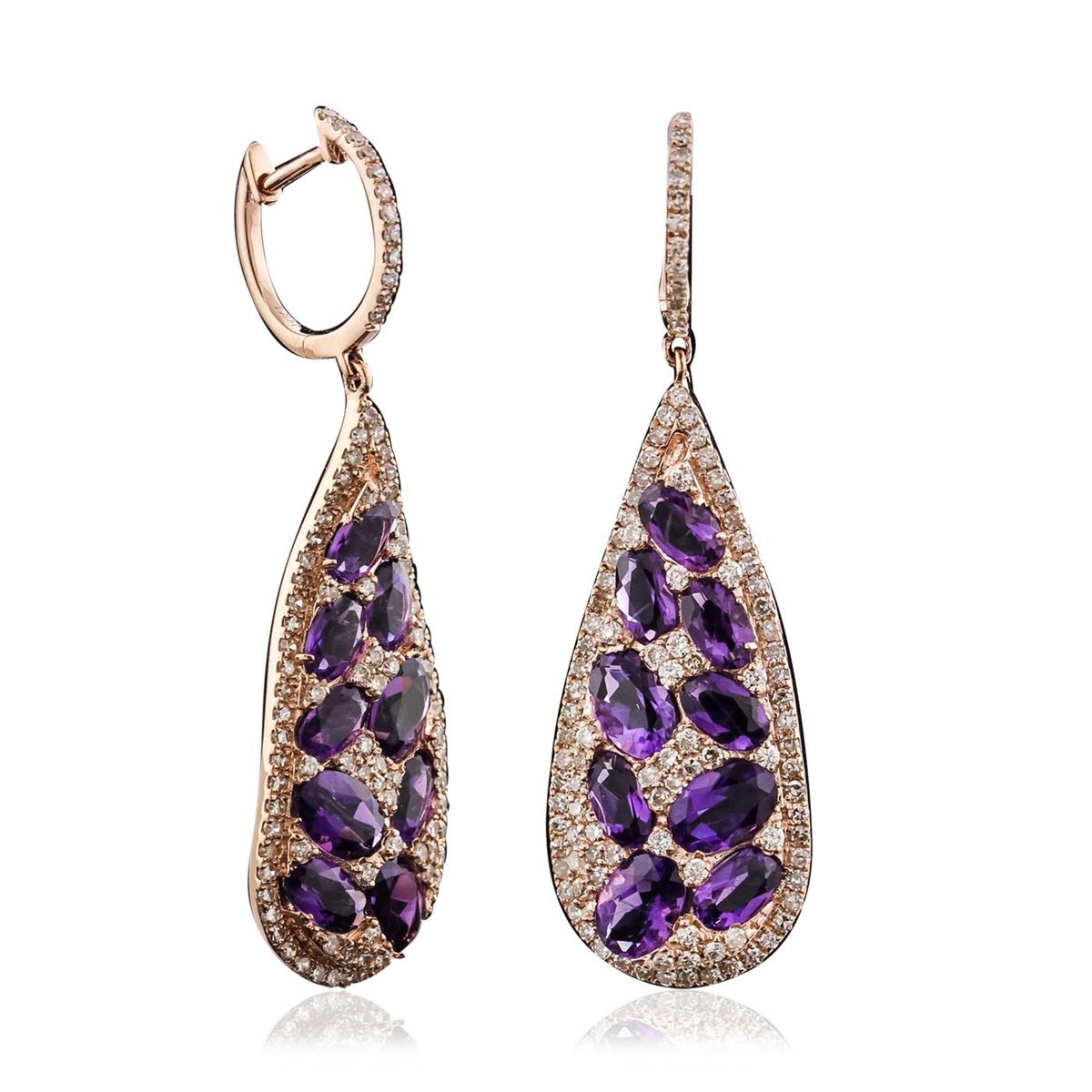 One pair of earrings featuring: 6.2 grams of 14KT rose gold, amethyst with a total weight of 4.90ct, diamonds with a total weight of 1.48cts.