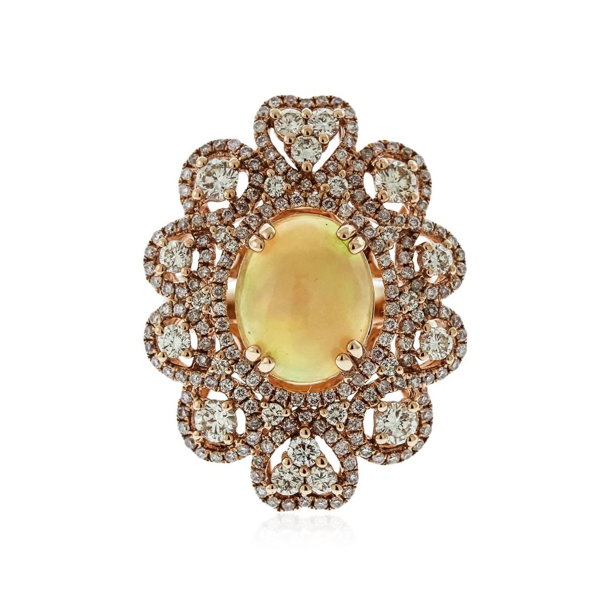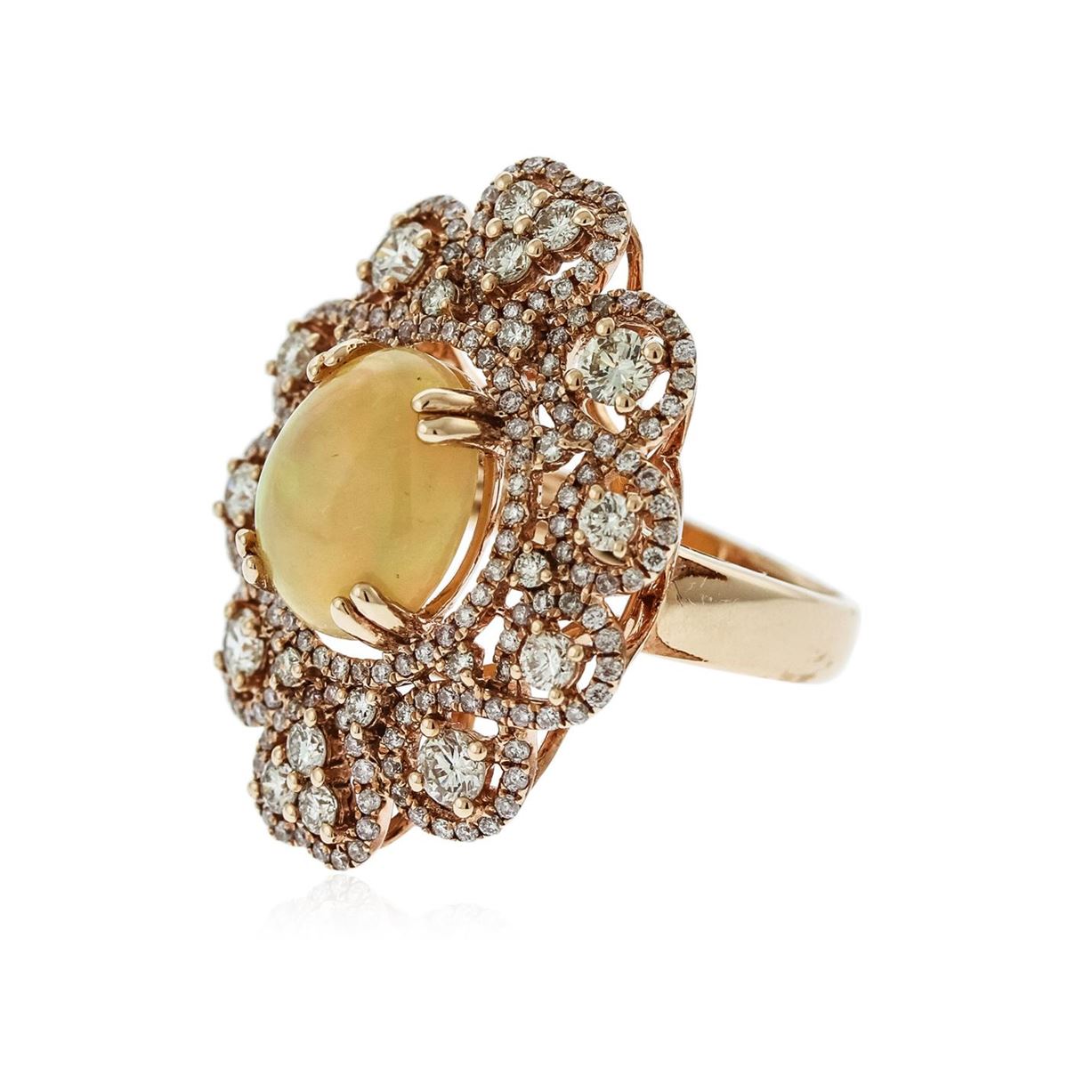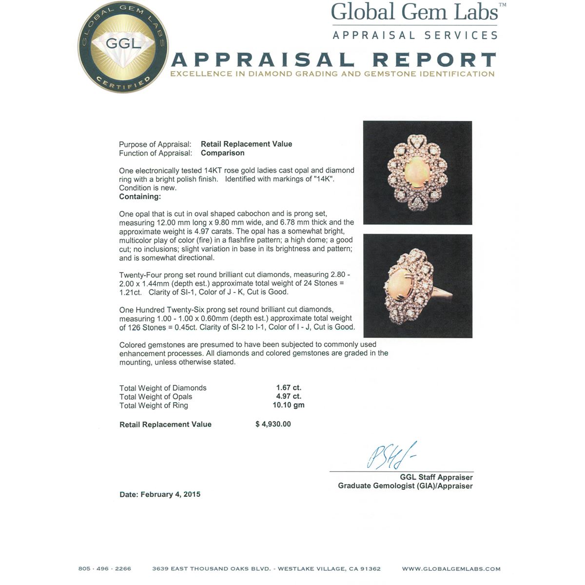 One electronically tested 14KT rose gold ladies cast opal and diamond ring with a bright polish finish. Identified with markings of "14K". Condition is new. Containing: One orange opal that is cut in a oval shaped cabochon and is prong set, measuring 12.00. mm long x 9.80 mm wide, and 6.78 mm thick and the approximate weight is 4.97 carats. The opal has a somewhat bright, multicolor play of color (fire) in a flashfire pattern; a high dome; a good cut; no inclusions; slight variation in base in its brightness and pattern; and is somewhat directional. Twenty-Four prong set round brilliant cut diamonds, measuring 2.80 - 2.00. x 1.44mm (depth est.) approximate total weight of 24 Stones = 1.21ct. Clarity: SI-1. Color: J - K, Cut is Good. One Hundred Twenty-Six prong set round brilliant cut diamonds, measuring 1.00. - 1.00. x 0.60mm (depth est.) approximate total weight of 126 Stones = 0.45ct. Clarity: SI-2 to I-1. Color: I - J, Cut is Good. Colored gemstones are presumed to have been subjected to commonly used enhancement processes. All diamonds and colored gemstones are graded in the mounting, unless otherwise stated. Total Weight of Opals 4.97ct. Total Weight of Diamonds 1.67ct. Total Weight of Ring 10.10 grams. GGL Appraised at $4,930.00.