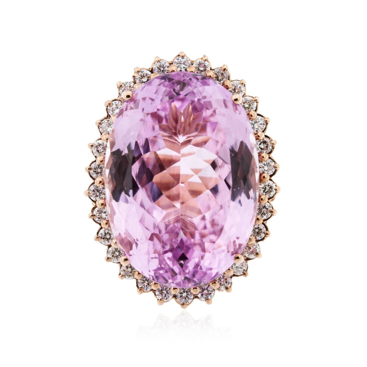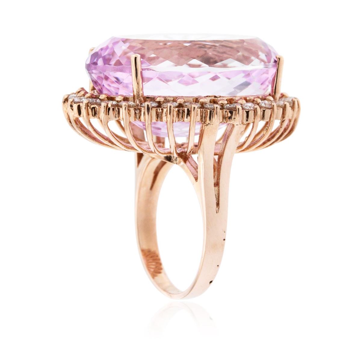 One electronically tested 14KT rose gold ladies cast kunzite spodumene and diamond ring with a bright polish finish. Condition is new, good workmanship. The featured kunzite spodumene is set within a diamond bezel, supported by split shoulders and completed by a two millimeter wide band. Identified with markings of "K14". Containing: One prong set oval modified brilliant cut natural kunzite, measuring 25.93 x 18.52 x 12.62mm, exact weight 45.02ct., type I, medium light, moderately strong Clarity is eye clean, medium, very slightly grayish, purple-pink color, (GIA PPi 5/3), cut is good. Transmitting light with no distortion, transparent. GIA Gemological Report attached. Graded loose prior to setting in the GIA Laboratory, Report #2151953480.Thirty prong set round brilliant cut diamonds, measuring 2.20 - 2.20 x 1.32mm (depth est.) approximate. Total Weight of 30 Stones = 1.15ct. Graded in the setting. Clarity: SI-2 to I-1. Color: F - H. Total Weight of Colored Stones 45.02ct. Total Weight of Diamonds 1.15ct. Total Weight of Ring 19.10 grams. AIG Appraised at $19,335.00.