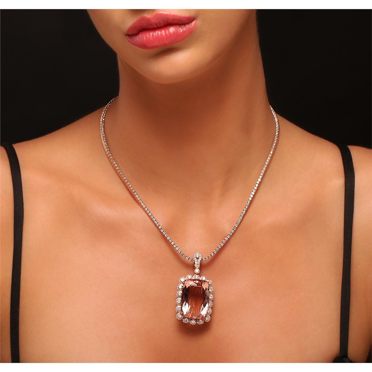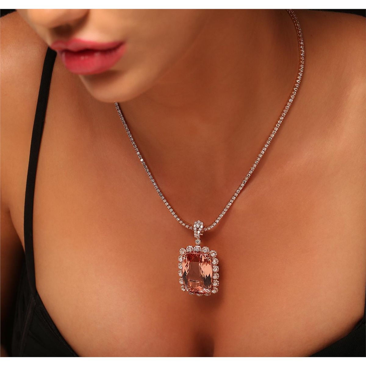One electronically tested 14KT rose gold Ladies combination cast & assembled pendant & chain 16.5 inch long, medium with a hidden box clasp with a bright polish finish. Condition is new. Identified with markings of "14K". Containing: One prong set rectangular cushion modified brilliant cut natural morganite, measuring 28.32 x 19.82 x 11.24mm, exact weight 48.30ct., clarity is eye clean, type I, light, brownish, reddish orange color, (GIA rO 3/1), cut is very good. GIA Report: 1166000254. One Hundred Eighty-Two prong set round brilliant cut diamonds, measuring 2.00 - 2.00 x 1.20mm (depth est.) approximate. Total Weight of 182 Stones = 5.31ct. . Clarity: I-1 to I-2. Color: J - K, Cut is Good. Nineteen prong set round brilliant cut diamonds, measuring 2.50 - 2.50 x 1.50mm (depth est.) approximate. Total Weight of 19 Stones = 1.09ct. . Clarity: I-1 to I-2. Color: J - K, Cut is Good. One Hundred Twenty-Six prong set round brilliant cut diamonds, measuring 1.00 - 1.00 x 0.60mm (depth est.) approximate. Total Weight of 126 Stones = 0.45ct. . Clarity: I-1 to I-2. Color: J - K, Cut is Good. Fifteen prong set round brilliant cut diamonds, measuring 1.50 - 1.50 x 0.90mm (depth est.) approximate. Total Weight of 15 Stones = 0.19ct. . Clarity: I-1 to I-2. Color: I - J, Cut is Good. Total Weight of Colored Stones 48.30ct. Total Weight of Diamonds 7.04ct. Total Weight of Pendant & Chain 40.70 grams. GGL Appraised at $50,350.00.