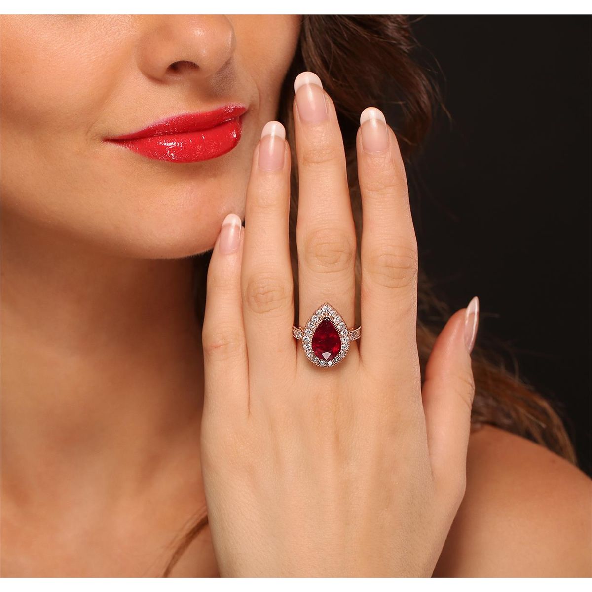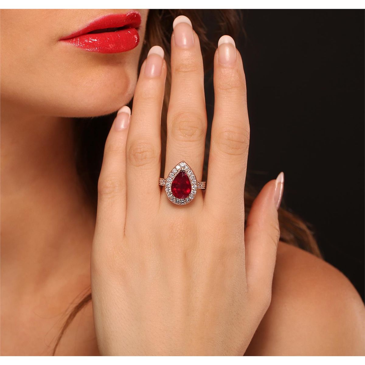 One electronically tested 14KT rose gold Ladies combination cast & assembled fancy ring with a high polish finish. Condition is new. Identified with markings of "14K". Containing: One prong set pear modified brilliant cut natural ruby, measuring 12.00 x 9.00 x 5.80mm, approximate weight of 5.01ct., clarity is heavily included, type II, medium dark, moderately strong, strongly purplish red color, (GIA stpR 6/4), cut is good. Indications of heat treatment with glass and flux residue. Colored gemstones are presumed to have been subjected to commonly used and possible undetectable color/clarity enhancement processes. Twenty-Nine bead set round brilliant cut diamonds, measuring 2.30 - 2.30 x 1.38mm (depth est.) approximate total weight of 29 Stones = 1.29ct. Clarity of I-1 to I-2, Color of H - I, Cut is Good. Thirty-Two prong set round brilliant cut diamonds, measuring 1.40 - 1.40 x 0.84mm (depth est.) approximate total weight of 32 Stones = 0.32ct. Clarity of I-1 to I-2, Color of H - I, Cut is Good. Total Weight of Colored Stones 5.01ct. Total Weight of Diamonds 1.61ct. Total Weight of Ring 7.70gm. GGL Appraised at $6,810.00.