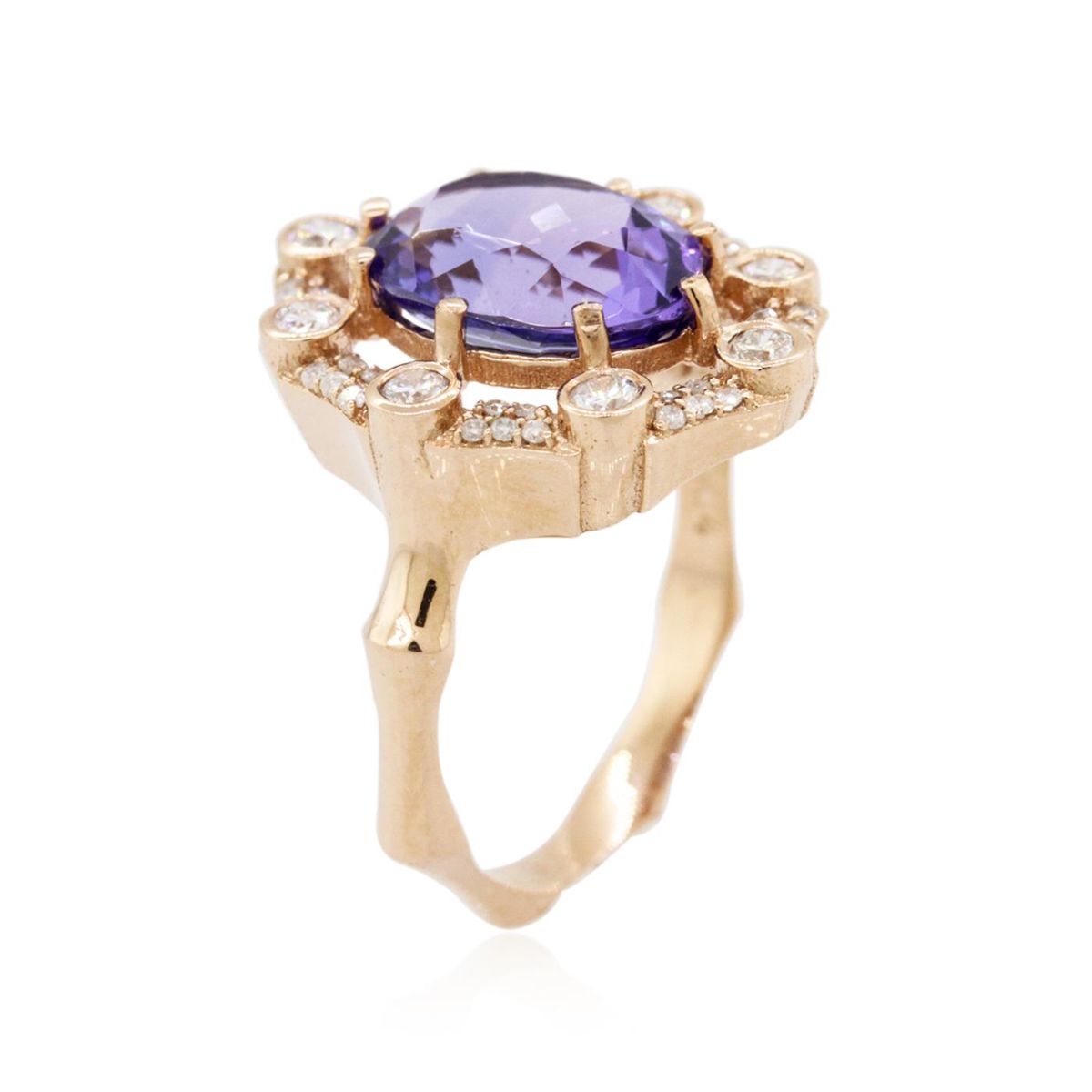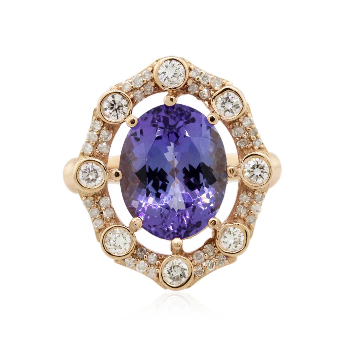 One electronically tested 14KT rose gold ladies combination cast & assembled engagement ring with a bright polish finish. Identified with markings of "K14". Condition is new. Containing: One prong set round modified brilliant cut natural tanzanite, measuring 11.00 - 8.00 x 6.18 mm, approximate weight of 5.01ct., clarity is eye clean, type I, medium light, moderately strong, violet color, (GIA V 4/4), cut is good. Eight bezel set round brilliant cut diamonds, measuring 2.00 - 2.00 x 1.20mm (depth est.) approximate total weight of 8 Stones = 0.23ct. Clarity: SI-1 to SI-2. Color: I - J, Cut is Good. Forty prong set round brilliant cut diamonds, measuring 1.00 - 1.00 x 0.60mm (depth est.) approximate total weight of 40 Stones = 0.14ct. Clarity: I-1 to I-2. Color: I - J, Cut is Good. Colored gemstones are presumed to have been subjected to commonly used enhancement processes. All diamonds and colored gemstones are graded in the mounting, unless otherwise stated. Total Weight of Colored Stones 5.01ct. Total Weight of Diamonds 0.38ct. Total Weight of Ring 4.70 grams. GGL Appraised at $9,245.00.