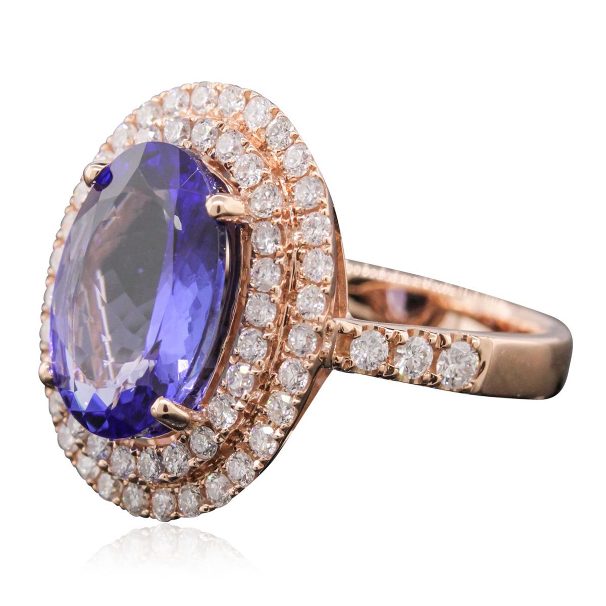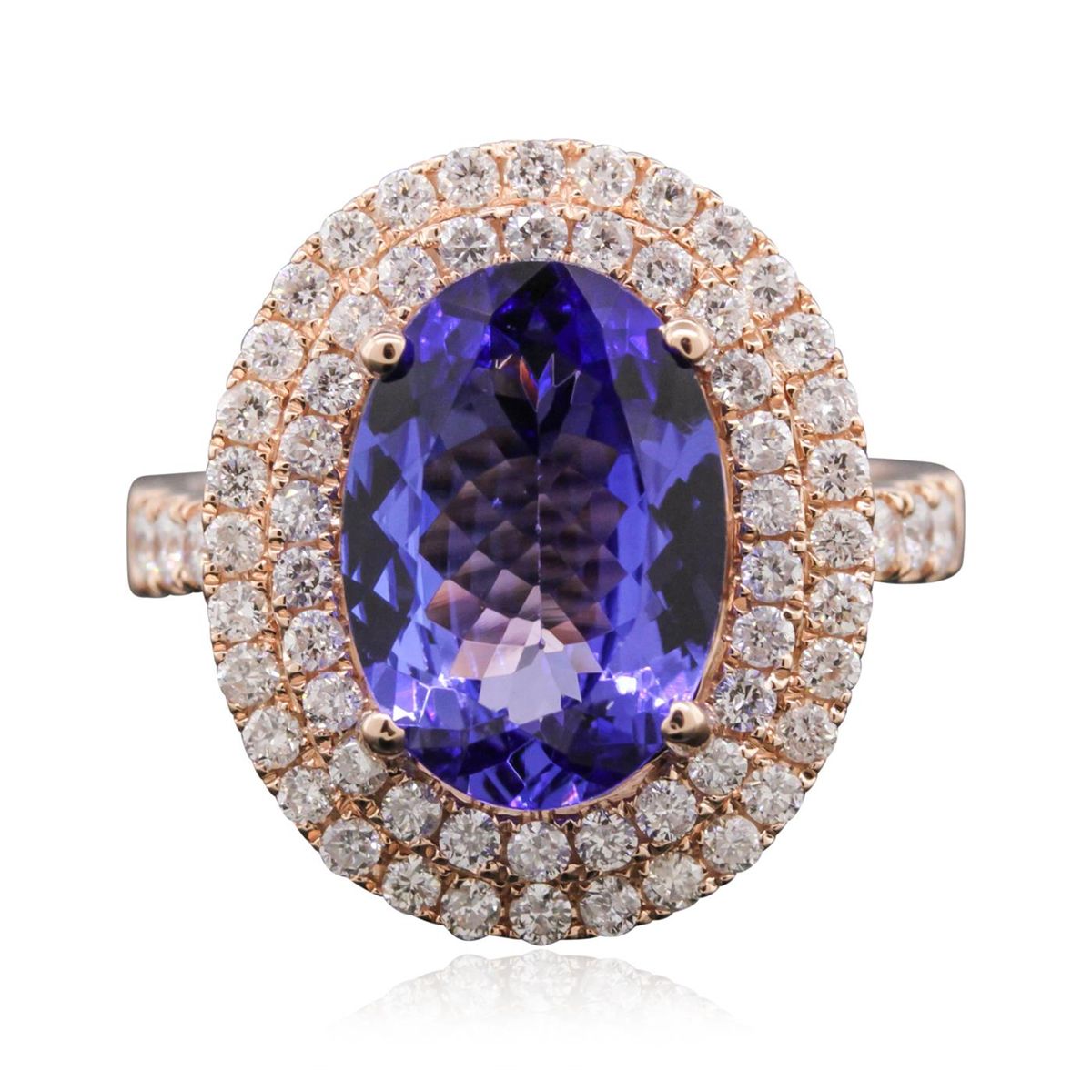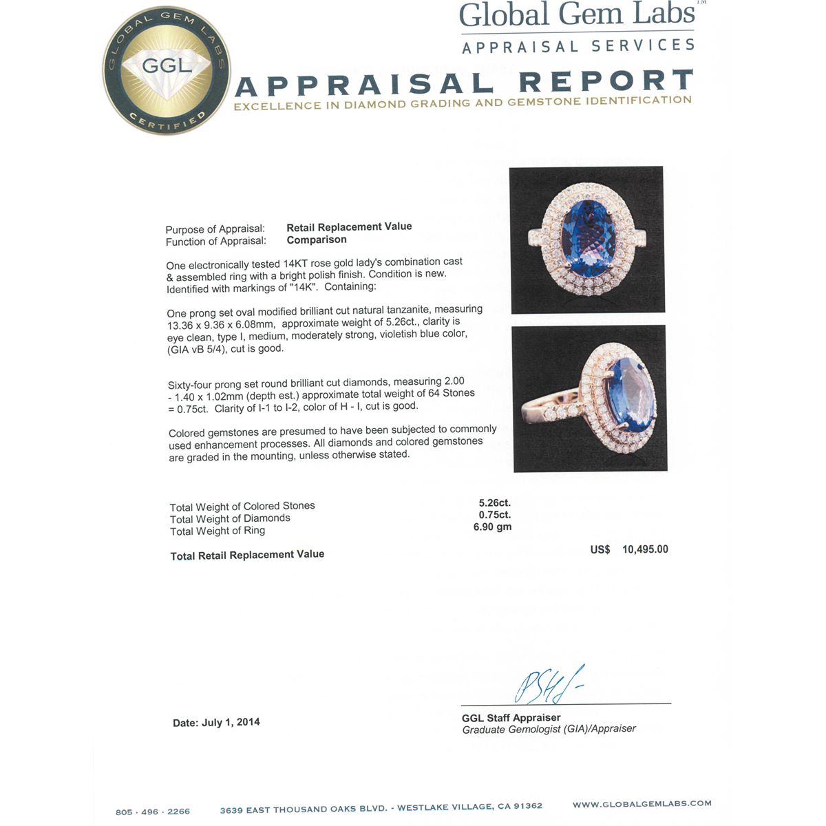 One electronically tested 14KT rose gold Ladies combination cast & assembled ring with a bright polish finish. Condition is new. Identified with markings of "14K". Containing: One prong set oval modified brilliant cut natural tanzanite, measuring 13.36 x 9.36 x 6.08mm, approximate weight of 5.26ct., clarity is eye clean, type I, medium, moderately strong, violetish blue color, (GIA vB 5/4), cut is good. Sixty-Four prong set round brilliant cut diamonds, measuring 2.00 - 1.40 x 1.02mm (depth est.) approximate total weight of 64 Stones = 0.75ct. Clarity: I-1 to I-2. Color: H - I, Cut is Good. Colored gemstones are presumed to have been subjected to commonly used enhancement processes. All diamonds and colored gemstones are graded in the mounting, unless otherwise stated. Total Weight of Colored Stones 5.26ct. Total Weight of Diamonds 0.75ct. Total Weight of Ring 6.90 grams. GGL Appraised at $10,495.00.