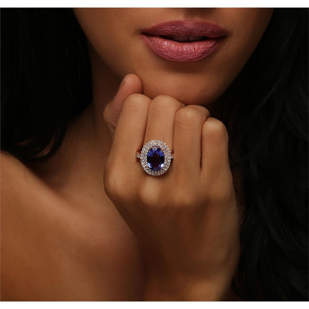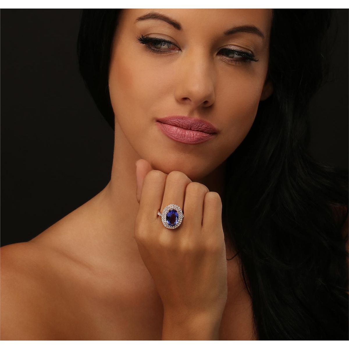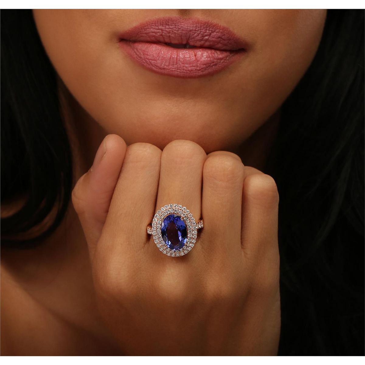 One electronically tested 14KT rose gold Ladies combination cast & assembled ring with a bright polish finish. Condition is new. Identified with markings of "14K". Containing: One prong set oval modified brilliant cut natural tanzanite, measuring 13.36 x 9.36 x 6.08mm, approximate weight of 5.26ct., clarity is eye clean, type I, medium, moderately strong, violetish blue color, (GIA vB 5/4), cut is good. Sixty-Four prong set round brilliant cut diamonds, measuring 2.00 - 1.40 x 1.02mm (depth est.) approximate total weight of 64 Stones = 0.75ct. Clarity: I-1 to I-2. Color: H - I, Cut is Good. Colored gemstones are presumed to have been subjected to commonly used enhancement processes. All diamonds and colored gemstones are graded in the mounting, unless otherwise stated. Total Weight of Colored Stones 5.26ct. Total Weight of Diamonds 0.75ct. Total Weight of Ring 6.90 grams. GGL Appraised at $10,495.00.