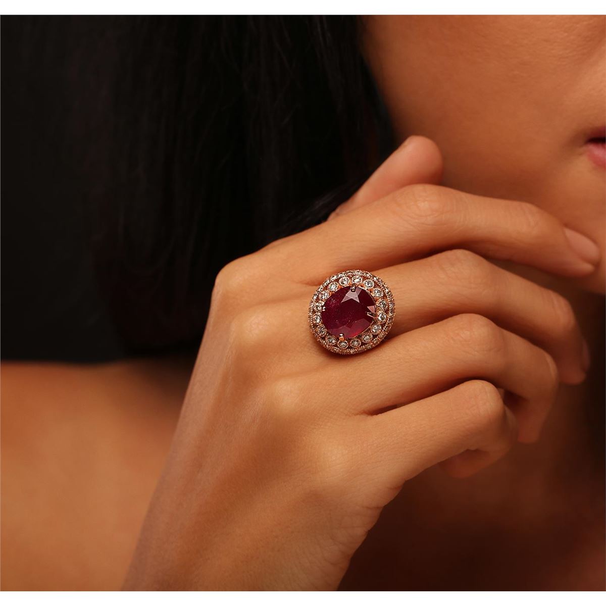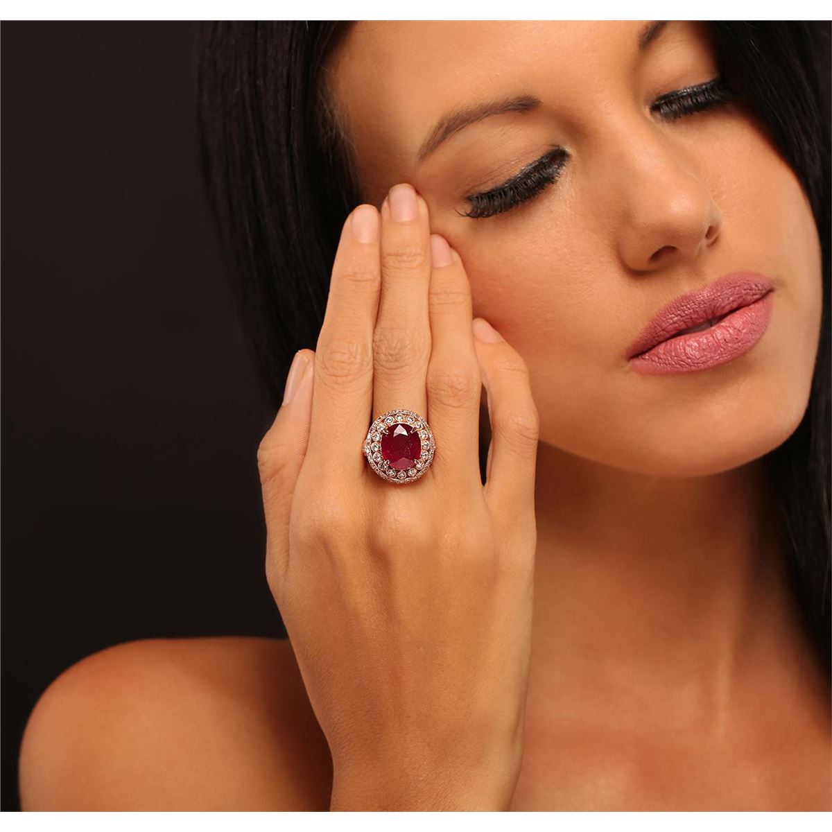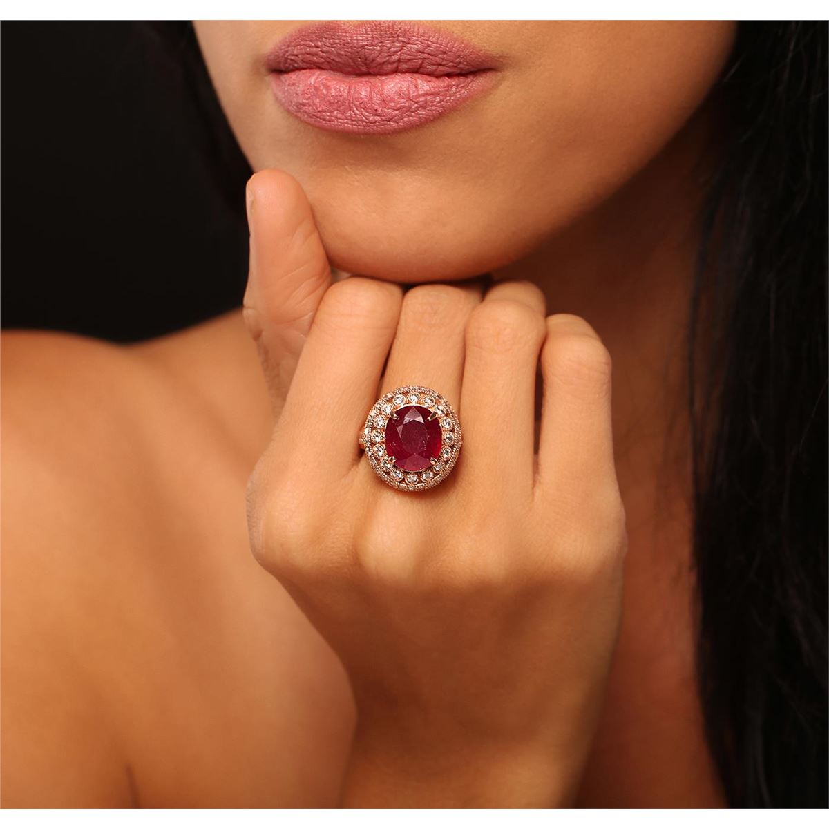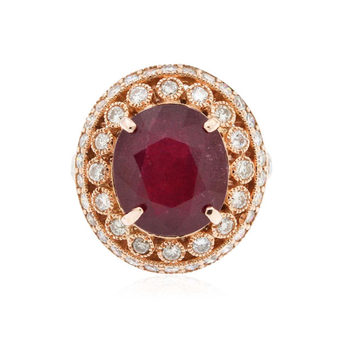 One electronically tested 14KT rose gold Ladies combination cast & assembled ring with a bright polish finish. Condition is new. Identified with markings of "K14". Containing: One prong set oval modified brilliant cut natural ruby, measuring 12.54 x 10.91 x 7.32mm, approximate weight of 5.47ct., clarity is heavily included, type III, cut is good. Colored gemstones are presumed to have been subjected to commonly used color/clarity enhancement processes. Twenty-Two prong set round brilliant cut diamonds, measuring 2.00 - 2.00 x 1.20mm (depth est.) approximate. Total Weight of 22 Stones = 0.64ct. Clarity: SI-2 to I-1. Color: I - J, Cut is Good. Thirty-Three prong set diamonds, measuring 1.20 x 1.20 x 0.74mm (depth est.) approximate. Total Weight of 33 Stones = 0.00ct. Clarity: I-1. Color: I - J, Cut is Good. Total Weight of Colored Stones 5.47ct. Total Weight of Diamonds 0.64ct. Total Weight of Ring 9.20 grams. GGL Appraised at $5,355.00.