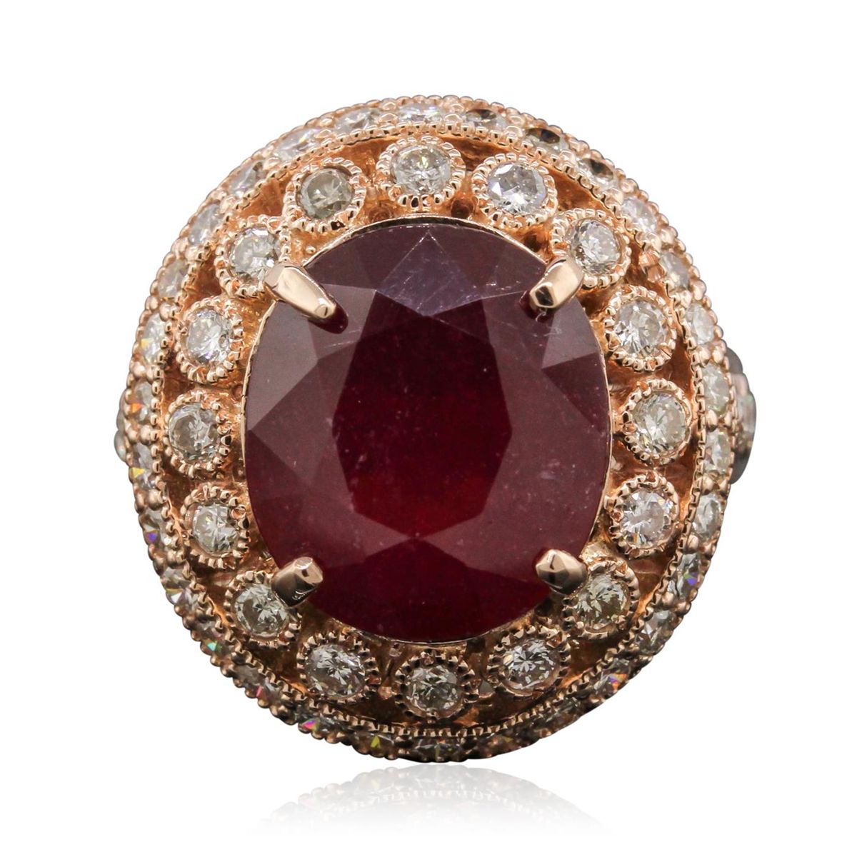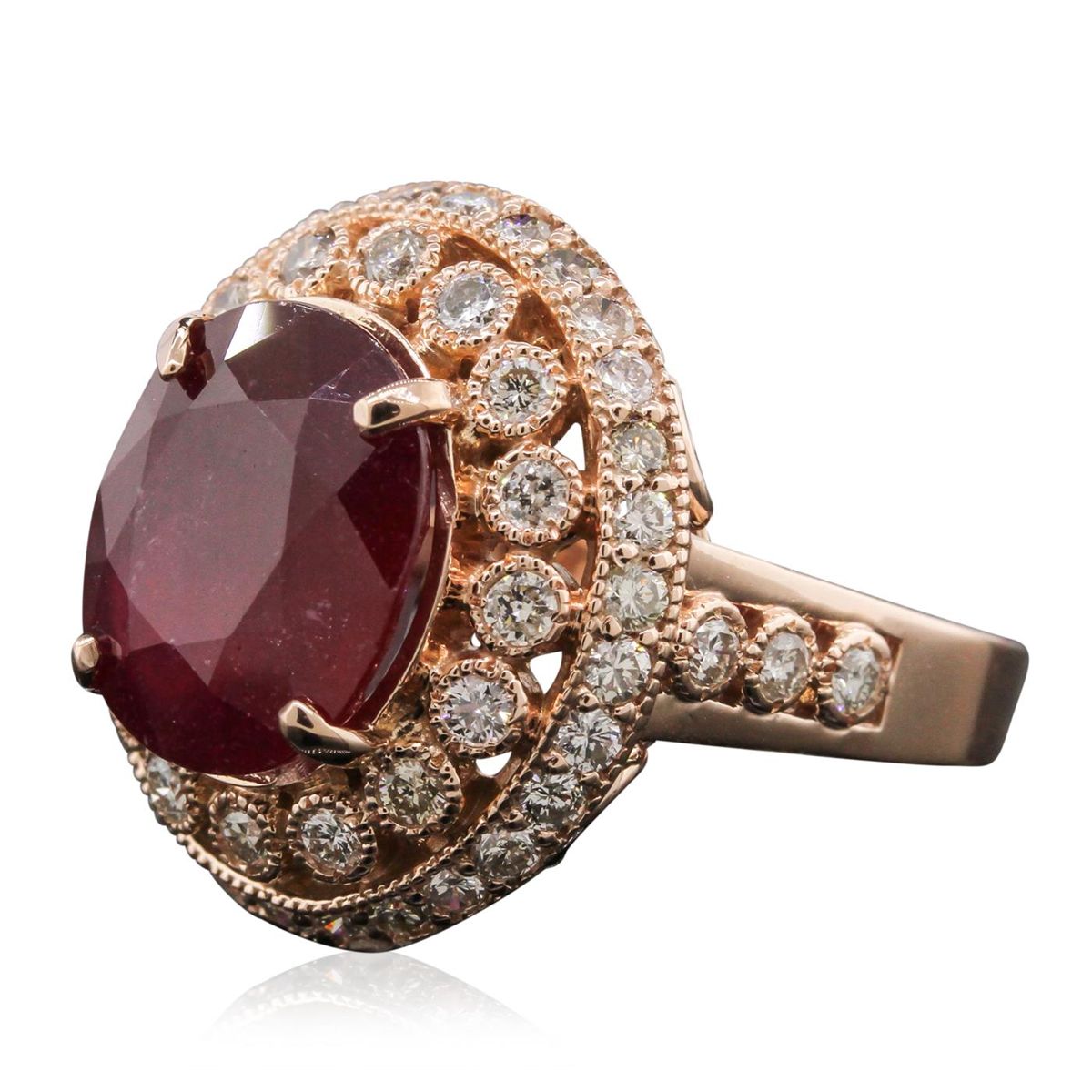 One electronically tested 14KT rose gold Ladies combination cast & assembled ring with a bright polish finish. Condition is new. Identified with markings of "K14". Containing: One prong set oval modified brilliant cut natural ruby, measuring 12.54 x 10.91 x 7.32mm, approximate weight of 5.47ct., clarity is heavily included, type III, cut is good. Colored gemstones are presumed to have been subjected to commonly used color/clarity enhancement processes. Twenty-Two prong set round brilliant cut diamonds, measuring 2.00 - 2.00 x 1.20mm (depth est.) approximate. Total Weight of 22 Stones = 0.64ct. Clarity: SI-2 to I-1. Color: I - J, Cut is Good. Thirty-Three prong set diamonds, measuring 1.20 x 1.20 x 0.74mm (depth est.) approximate. Total Weight of 33 Stones = 0.00ct. Clarity: I-1. Color: I - J, Cut is Good. Total Weight of Colored Stones 5.47ct. Total Weight of Diamonds 0.64ct. Total Weight of Ring 9.20 grams. GGL Appraised at $5,355.00.