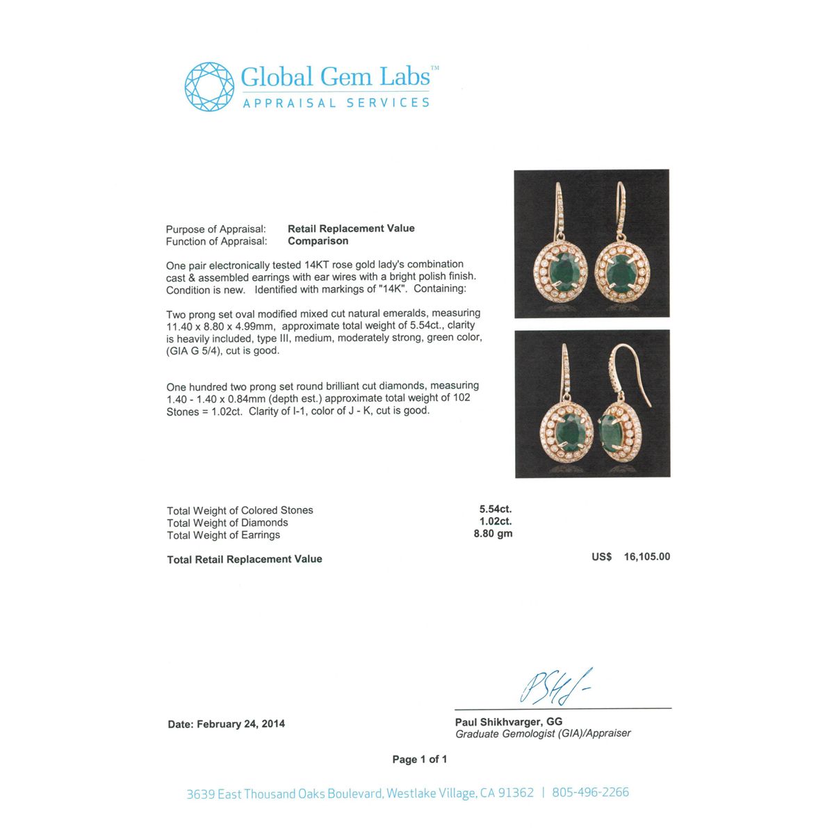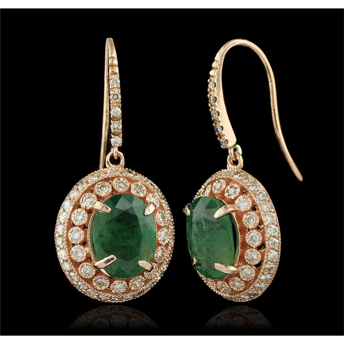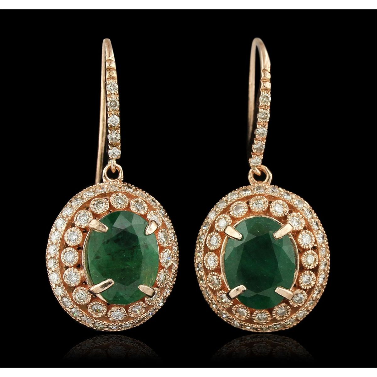 One pair electronically tested 14KT rose gold Ladies combination cast & assembled earrings with ear wires with a bright polish finish. Condition is new. Identified with markings of "14K". Containing: Two prong set oval modified mixed cut natural emeralds, measuring 11.40 x 8.80 x 4.99mm, approximate total weight of 5.54ct., clarity is heavily included, type III, medium, moderately strong, green color, (GIA G 5/4), cut is good. One Hundred Two prong set round brilliant cut diamonds, measuring 1.40 - 1.40 x 0.84mm (depth est.) approximate total weight of 102 Stones = 1.02ct. Clarity of I-1, Color of J - K, Cut is Good. Total Weight of Colored Stones 5.54ct. Total Weight of Diamonds 1.02ct. Total Weight of Earrings 8.80gm. GGL Appraised at $16,105.00.
