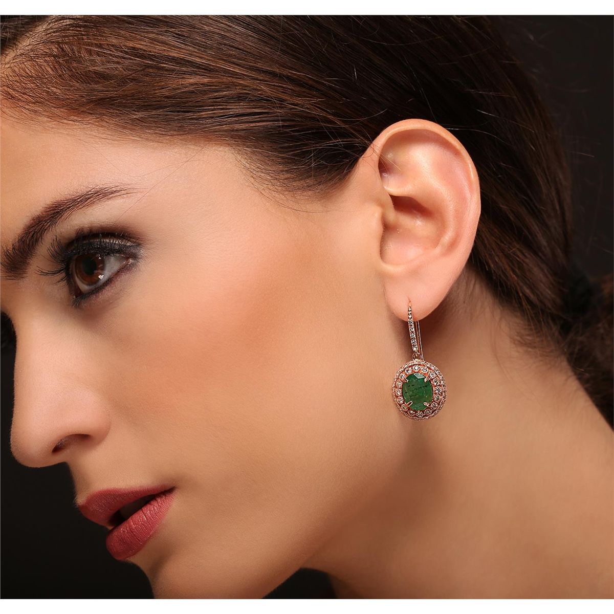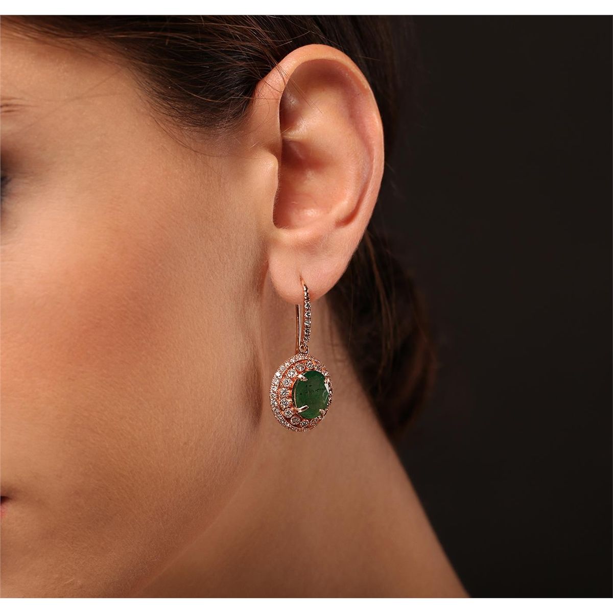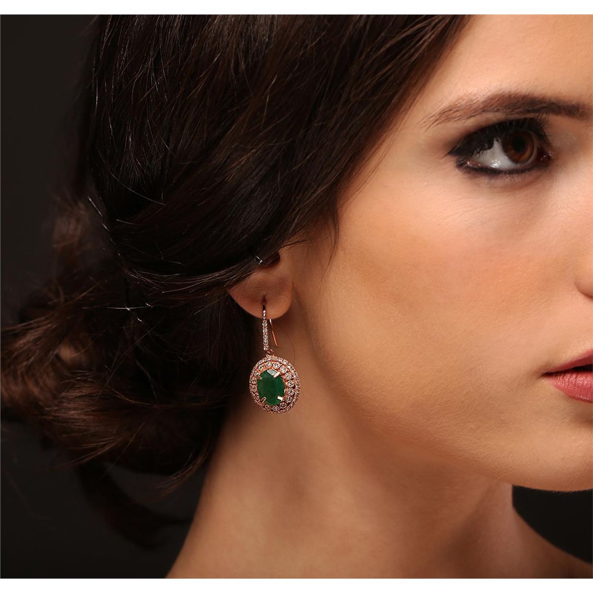 One pair electronically tested 14KT rose gold Ladies combination cast & assembled earrings with ear wires with a bright polish finish. Condition is new. Identified with markings of "14K". Containing: Two prong set oval modified mixed cut natural emeralds, measuring 11.40 x 8.80 x 4.99mm, approximate total weight of 5.54ct., clarity is heavily included, type III, medium, moderately strong, green color, (GIA G 5/4), cut is good. One Hundred Two prong set round brilliant cut diamonds, measuring 1.40 - 1.40 x 0.84mm (depth est.) approximate total weight of 102 Stones = 1.02ct. Clarity of I-1, Color of J - K, Cut is Good. Total Weight of Colored Stones 5.54ct. Total Weight of Diamonds 1.02ct. Total Weight of Earrings 8.80gm. GGL Appraised at $16,105.00.