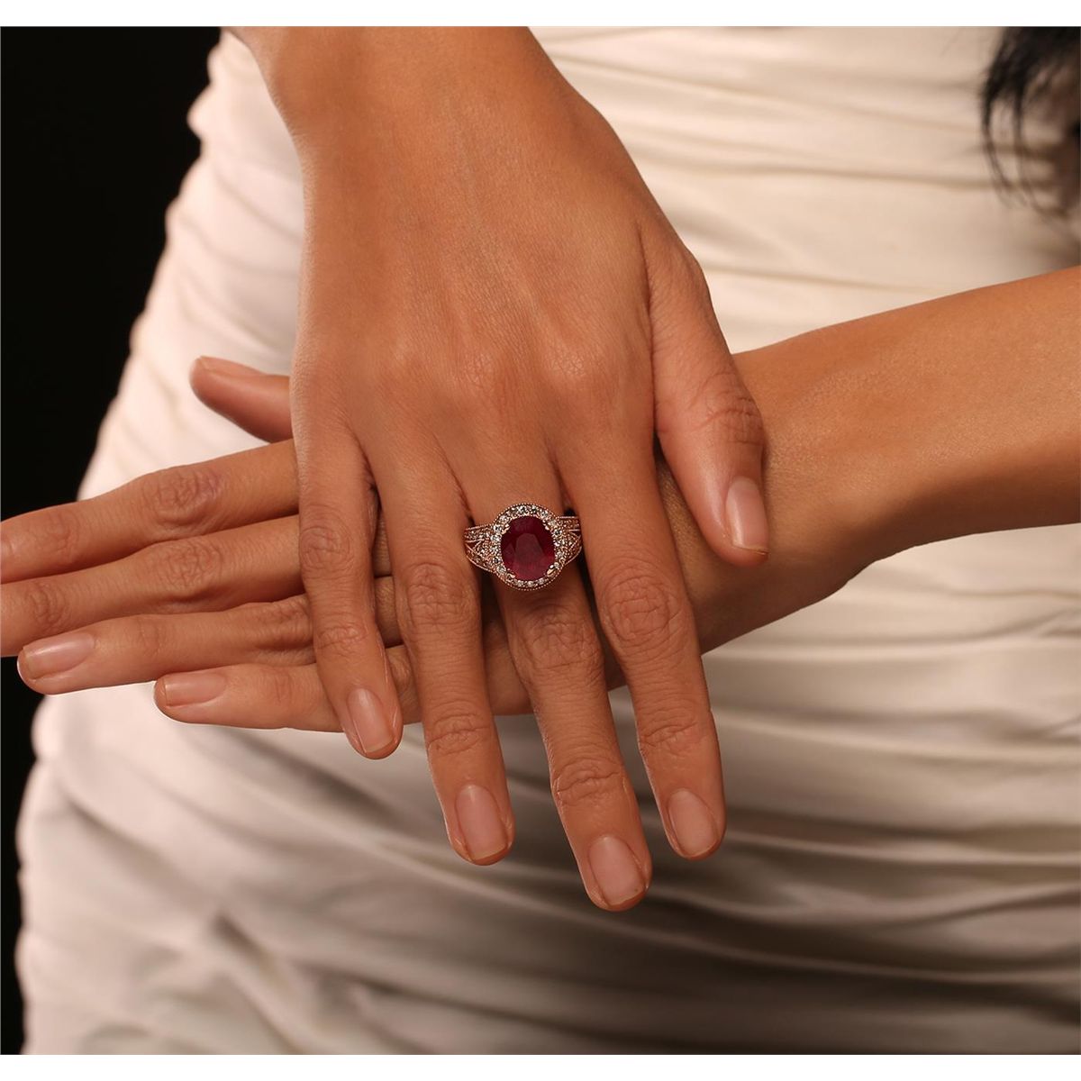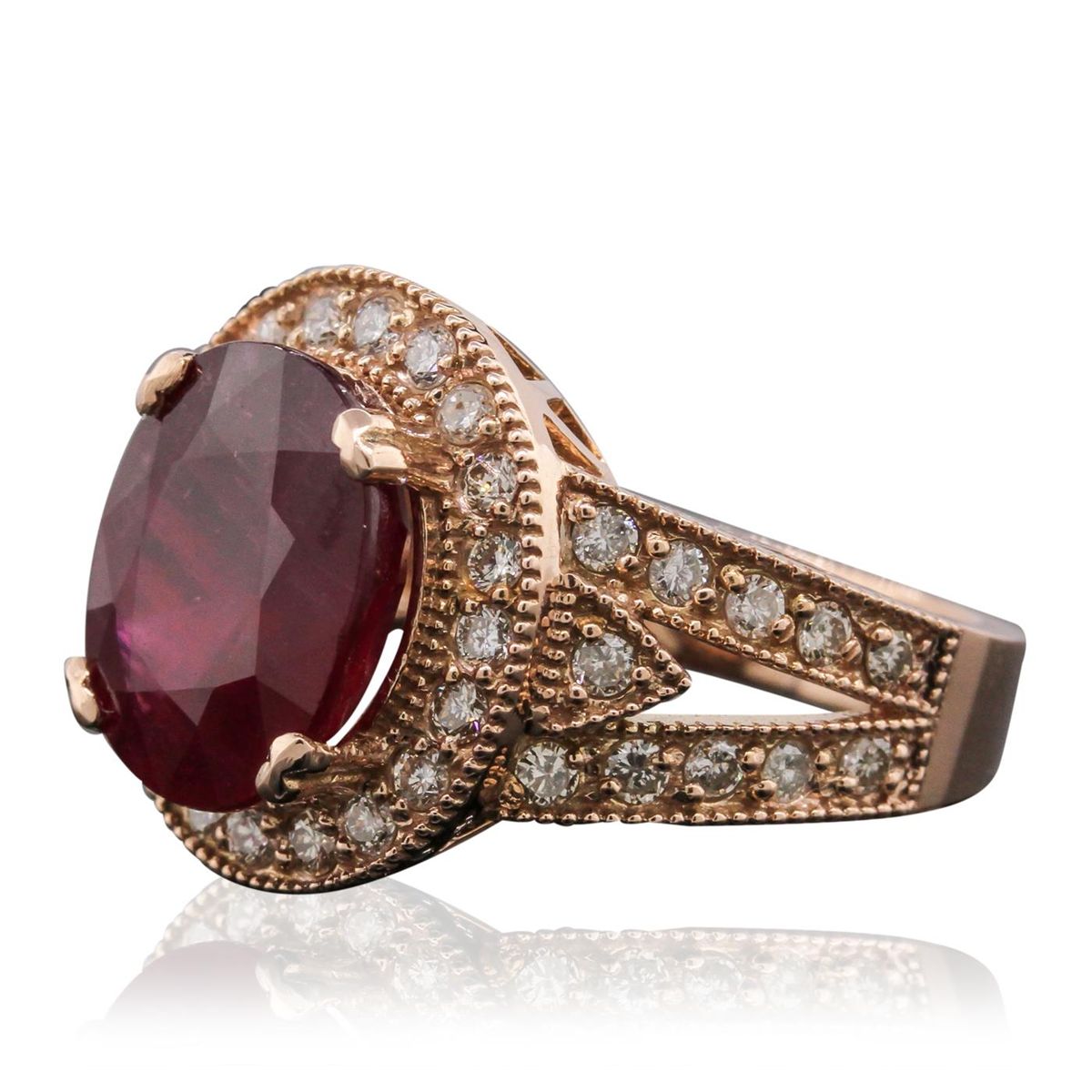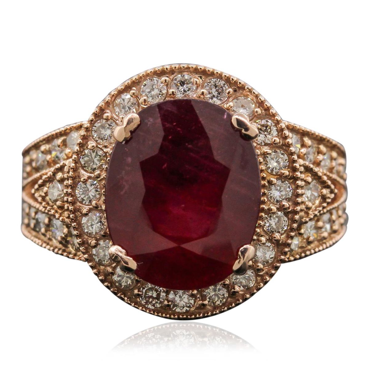 One electronically tested 14KT rose gold Ladies combination cast & assembled ring with a bright polish finish. Condition is new. Identified with markings of "K14". Containing: One prong set oval modified brilliant cut natural ruby, measuring 12.47 x 10.24 x 6.55mm, approximate weight of 5.66ct., clarity is heavily included, type I, cut is good. Colored gemstones are presumed to have been subjected to commonly used color/clarity enhancement processes. Forty-Two prong set round brilliant cut diamonds, measuring 1.80 - 1.80 x 1.08mm (depth est.) approximate. Total Weight of 42 Stones = 0.90ct. Clarity: I-1 to I-2. Color: K - L, Cut is Good. Total Weight of Colored Stones 5.66ct. Total Weight of Diamonds 0.90ct. Total Weight of Ring 9.40 grams. GGL Appraised at $5,690.00.