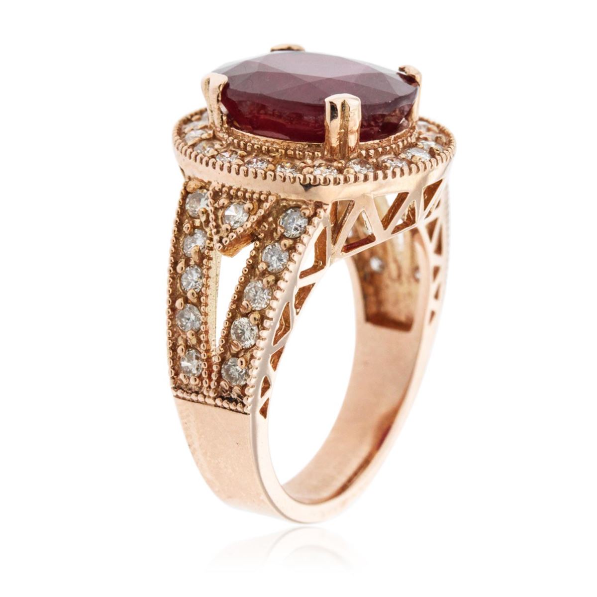 One electronically tested 14KT rose gold Ladies combination cast & assembled ring with a bright polish finish. Condition is new. Identified with markings of "K14". Containing: One prong set oval modified brilliant cut natural ruby, measuring 12.47 x 10.24 x 6.55mm, approximate weight of 5.66ct., clarity is heavily included, type I, cut is good. Colored gemstones are presumed to have been subjected to commonly used color/clarity enhancement processes. Forty-Two prong set round brilliant cut diamonds, measuring 1.80 - 1.80 x 1.08mm (depth est.) approximate. Total Weight of 42 Stones = 0.90ct. Clarity: I-1 to I-2. Color: K - L, Cut is Good. Total Weight of Colored Stones 5.66ct. Total Weight of Diamonds 0.90ct. Total Weight of Ring 9.40 grams. GGL Appraised at $5,690.00.