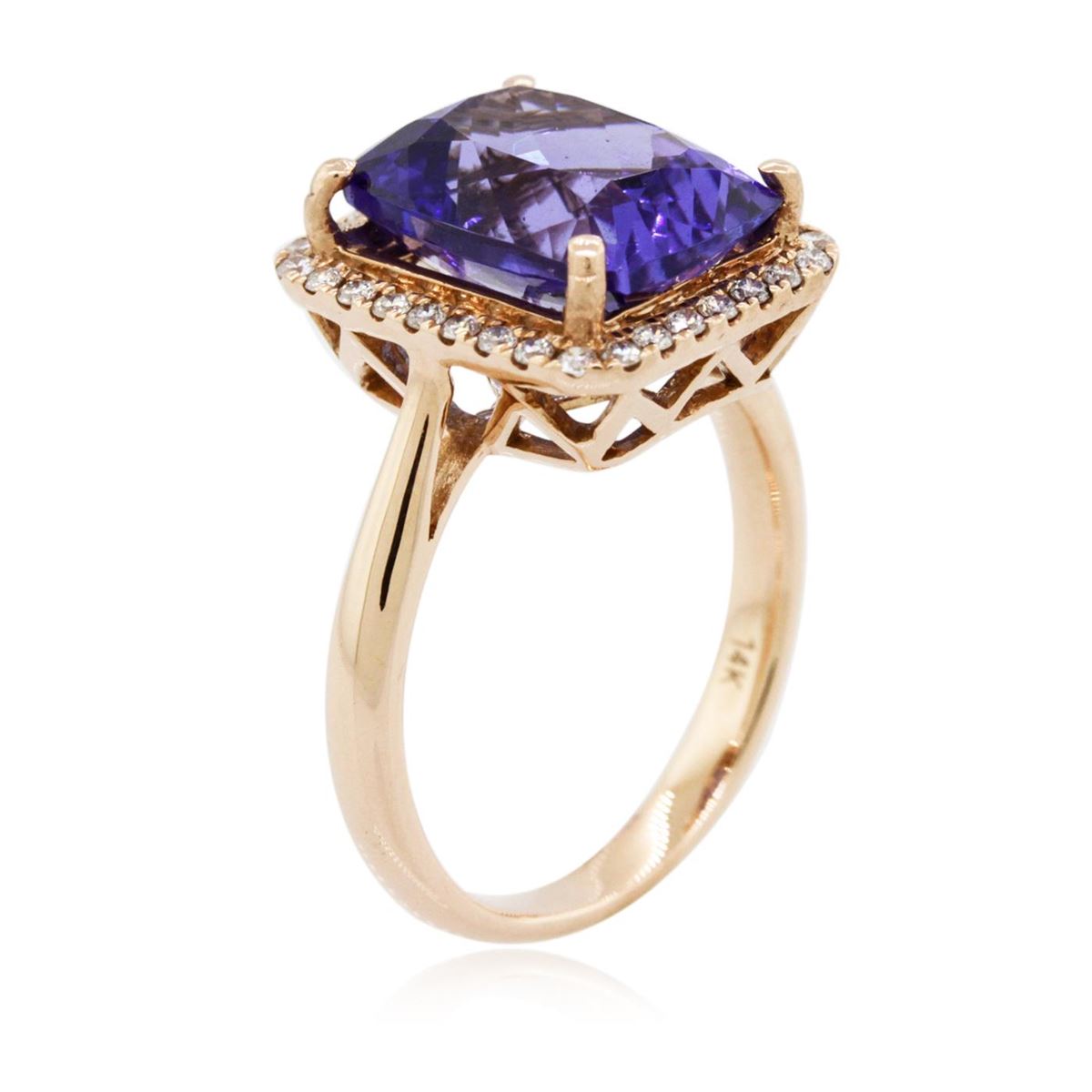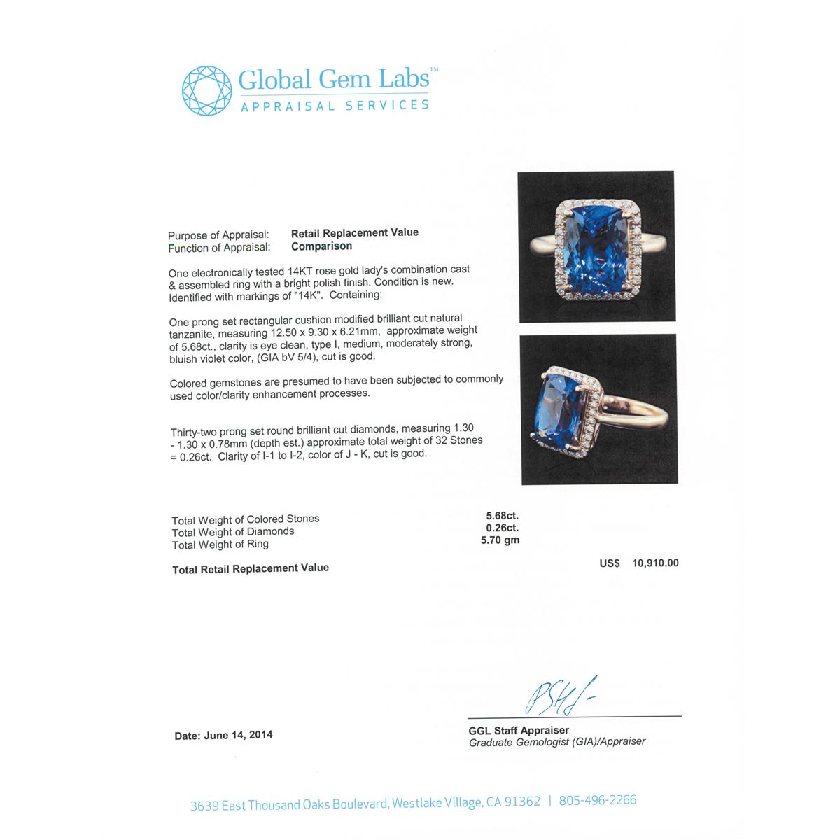 One electronically tested 14KT rose gold Ladies combination cast & assembled ring with a bright polish finish. Condition is new. Identified with markings of "14K". Containing: One prong set rectangular cushion modified brilliant cut natural tanzanite, measuring 12.50 x 9.30 x 6.21mm, approximate weight of 5.68ct., clarity is eye clean, type I, medium, moderately strong, bluish violet color, (GIA bV 5/4), cut is good. Colored gemstones are presumed to have been subjected to commonly used color/clarity enhancement processes. Thirty-Two prong set round brilliant cut diamonds, measuring 1.30 - 1.30 x 0.78mm (depth est.) approximate. Total Weight of 32 Stones = 0.26ct. Clarity: I-1 to I-2. Color: J - K, Cut is Good. Total Weight of Colored Stones 5.68ct. Total Weight of Diamonds 0.26ct. Total Weight of Ring 5.70 grams. GGL Appraised at $10,910.00.