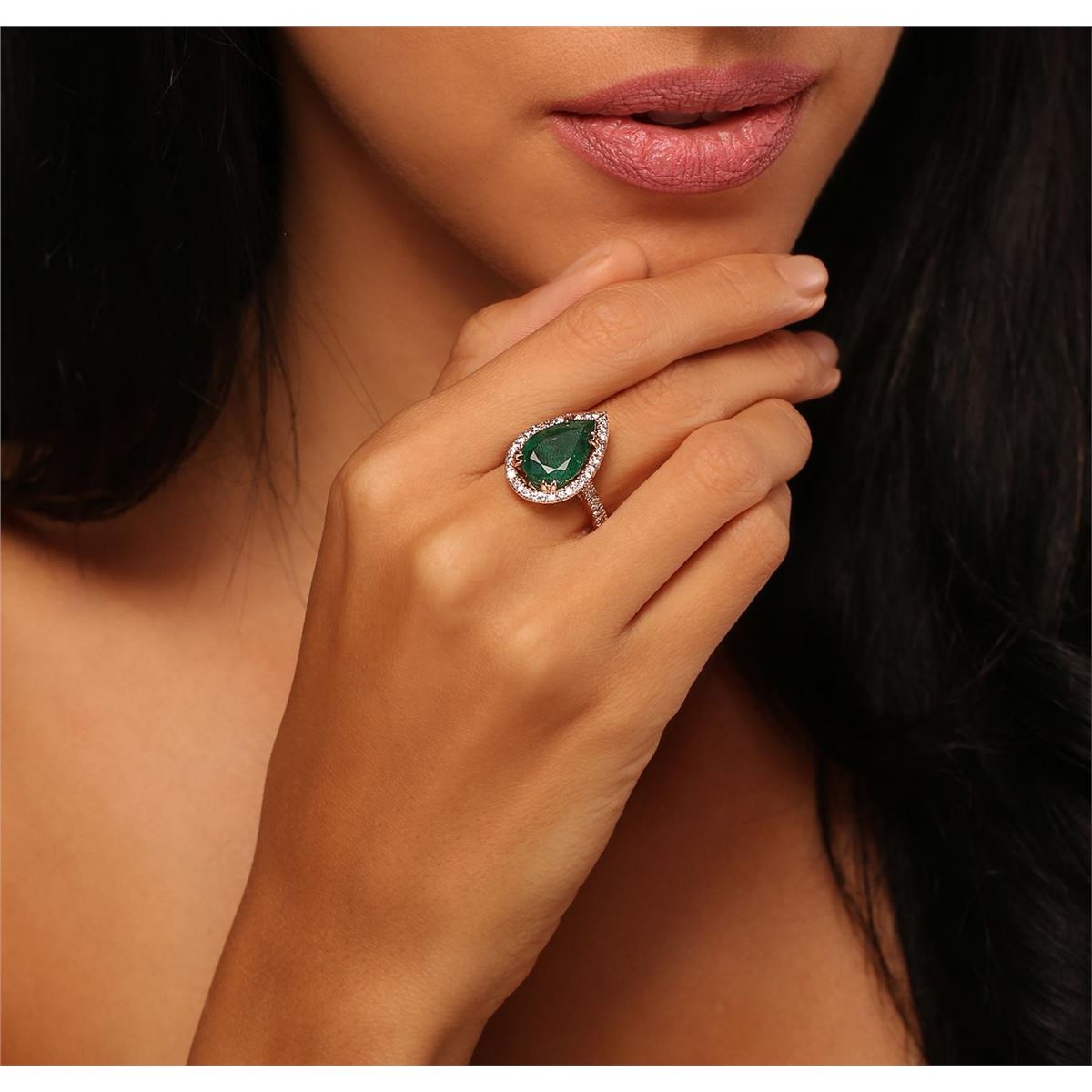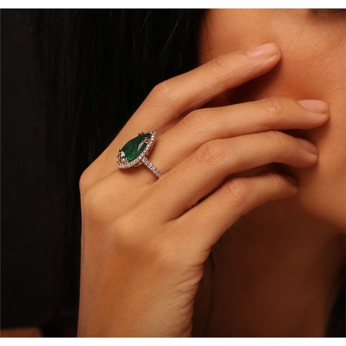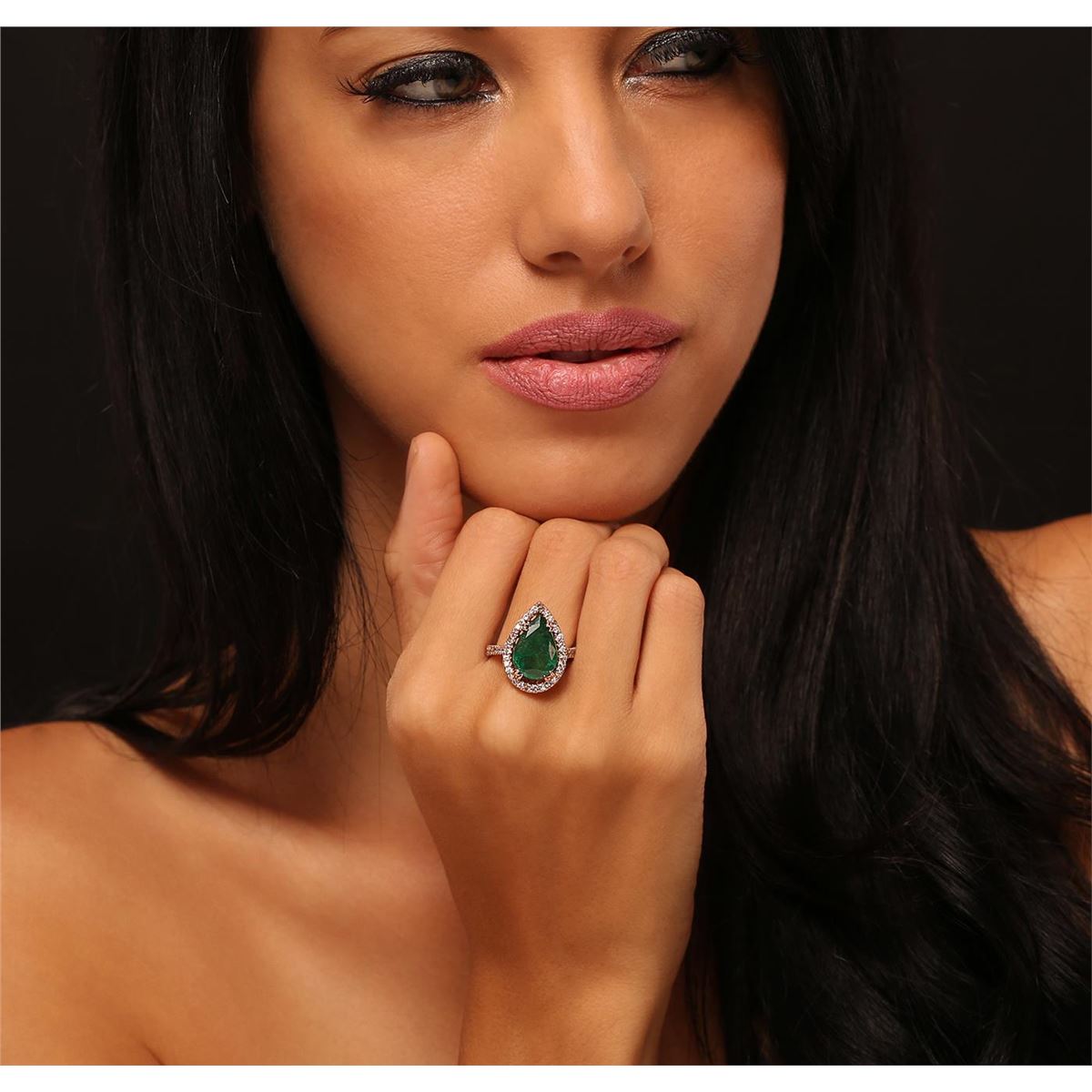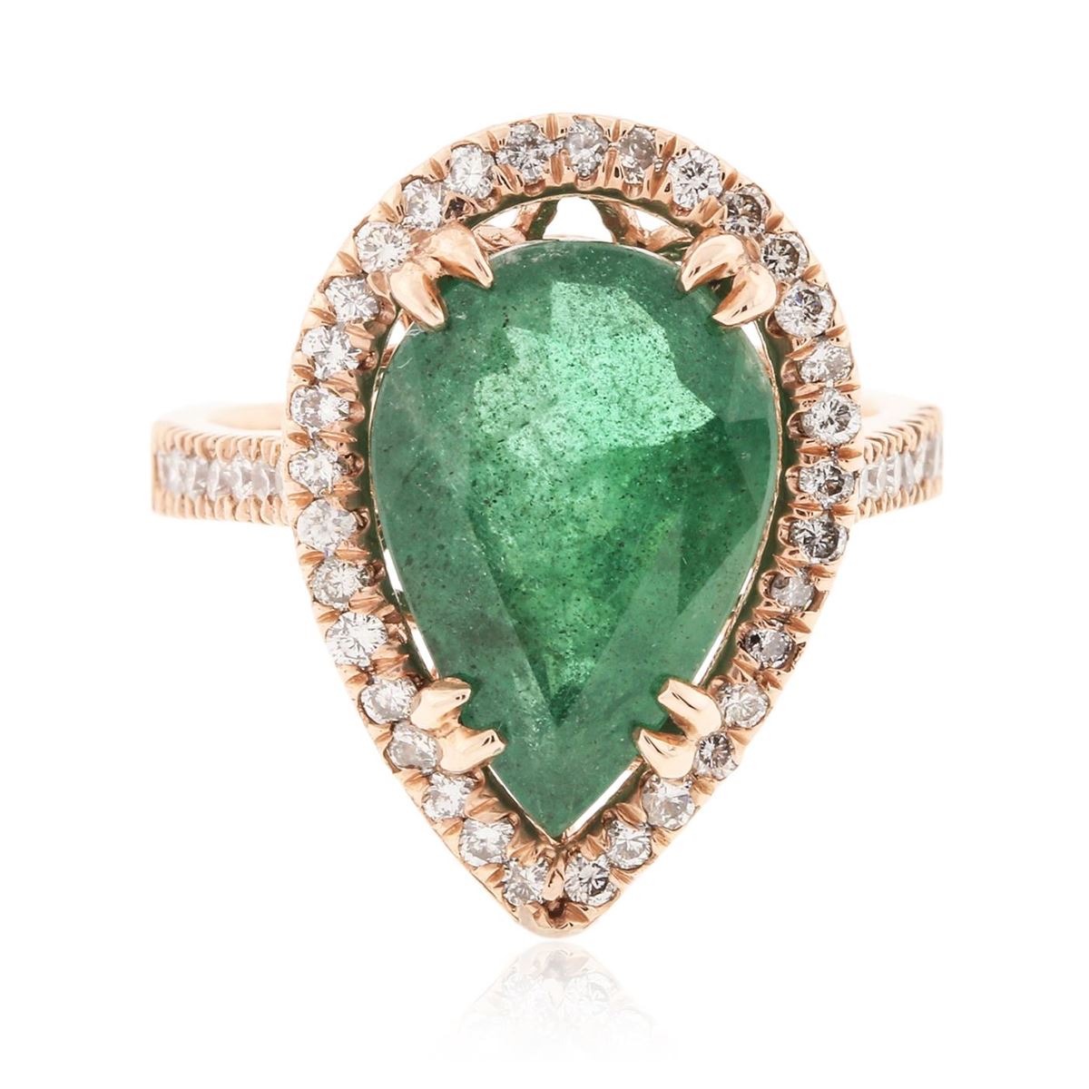 One electronically tested 14KT rose gold Ladies combination cast & assembled ring with a bright polish finish. Identified with markings of "K14". Condition is new. Containing: One prong set pear modified mixed cut natural emerald, measuring 15.10 x 10.21 x 7.00mm, approximate weight of 5.87ct., clarity is heavily included, type III, medium, moderately strong, green color, (GIA G 5/4), cut is good. Colored gemstones are presumed to have been subjected to commonly used color/clarity enhancement processes. Forty-Seven prong set round brilliant cut diamonds, measuring 1.50 - 1.50 x 0.90mm (depth est.) approximate. Total Weight of 47 Stones = 0.58ct. Clarity: I-1 to I-2. Color: I - J, Cut is Good. Total Weight of Colored Stones 5.87ct. Total Weight of Diamonds 0.58ct. Total Weight of Ring 5.90 grams. GGL Appraised at $11,345.00.