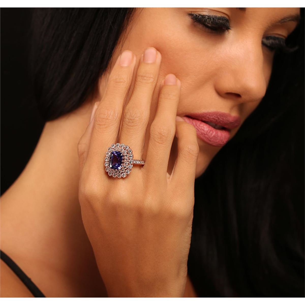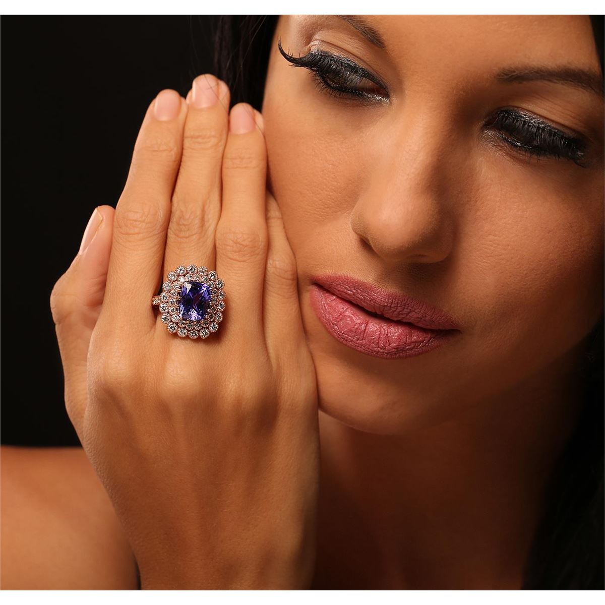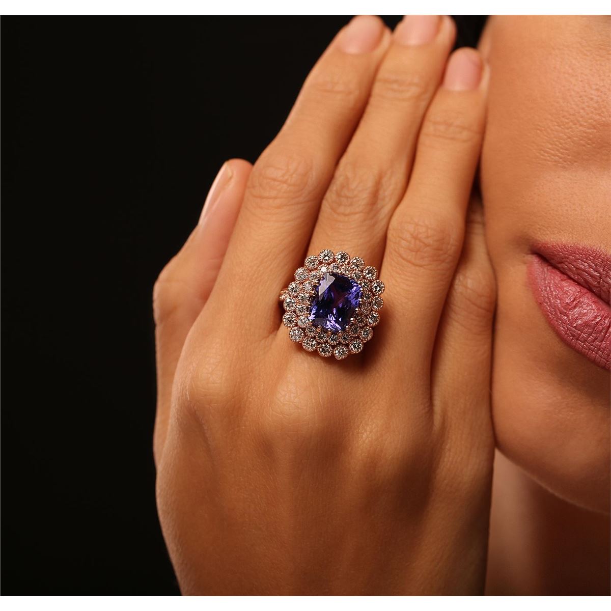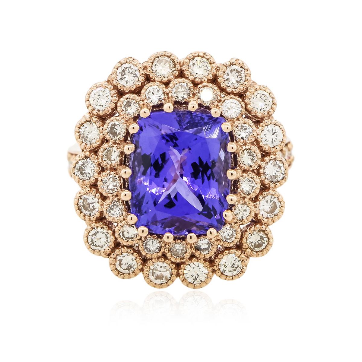 One electronically tested 14KT rose gold Ladies combination cast & assembled ring with a bright polish finish. Condition is new. Identified with markings of "K14". Containing: One prong set rectangular cushion modified brilliant cut natural tanzanite, measuring 11.20 x 9.92 x 6.80mm, approximate weight of 5.95ct., clarity is eye clean, type I, medium, moderately strong, bluish violet color, (GIA bV 5/4), cut is very good. Colored gemstones are presumed to have been subjected to commonly used color/clarity enhancement processes. Thirty-One prong set round brilliant cut diamonds, measuring 1.60 - 1.60 x 0.96mm (depth est.) approximate. Total Weight of 31 Stones = 0.46ct. Clarity: I-1 to I-2. Color: L - M, Cut is Good. Nineteen prong set round brilliant cut diamonds, measuring 2.50 - 2.50 x 1.50mm (depth est.) approximate. Total Weight of 19 Stones = 1.09ct. Clarity: SI-1 to SI-2. Color: M - N, Cut is Good. Total Weight of Colored Stones 5.95ct. Total Weight of Diamonds 1.55ct. Total Weight of Ring 8.90 grams. GGL Appraised at $13,395.00.