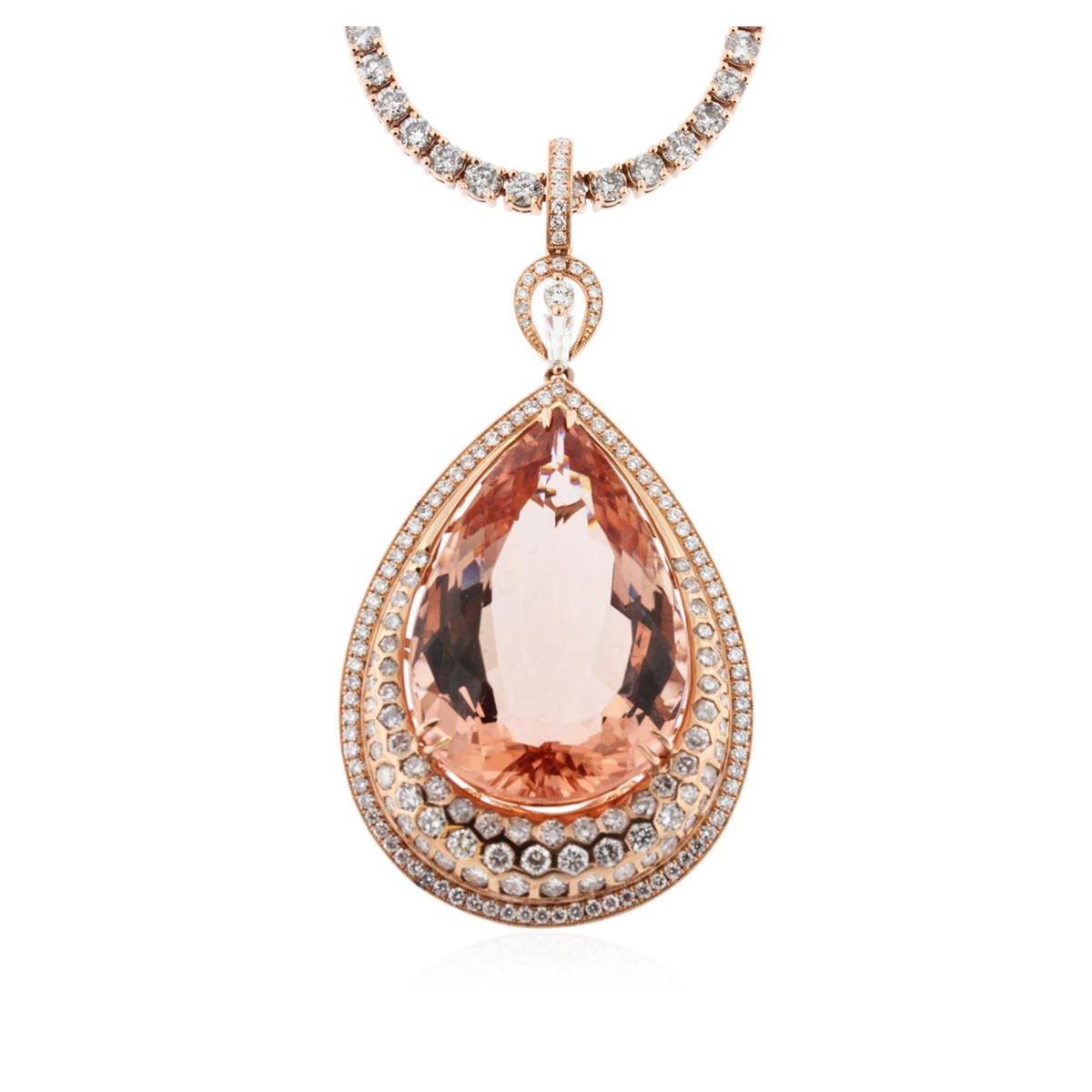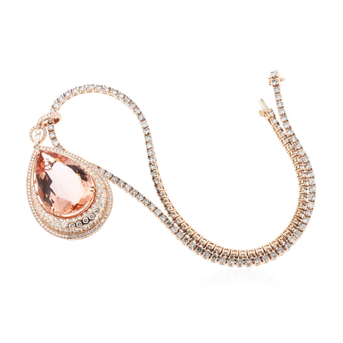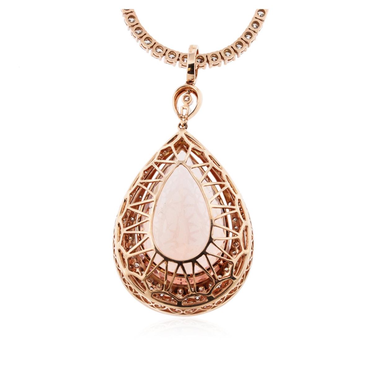 One electronically tested 14KT rose gold Ladies combination cast & assembled pendant & chain 17.0 inch long, medium with a hidden box clasp with a bright polish finish. Condition is new. Identified with markings of "14K". Containing: One prong set pear modified brilliant cut natural morganite, measuring 35.12 x 23.19 x 13.74mm, exact weight 57.46ct., clarity is eye clean, type I, light, brownish, reddish orange color, (GIA rO 3/1), cut is very good. GIA Report: 11660000157. One Hundred Twenty-Four prong set round brilliant cut diamonds, measuring 3.00 - 3.00 x 1.80mm (depth est.) approximate. Total Weight of 124 Stones = 12.25ct. Clarity: I-3. Color: I - J, Cut is Good. Eighty-Three prong set round brilliant cut diamonds, measuring 1.40 - 1.40 x 0.84mm (depth est.) approximate. Total Weight of 83 Stones = 0.83ct. Clarity: I-1. Color: G - H, Cut is Good. Fifty-Three gypsy set round brilliant cut diamonds, measuring 2.30 - 1.50 x 1.14mm (depth est.) approximate. Total Weight of 53 Stones = 1.33ct. Clarity: I-1. Color: G - H, Cut is Good. One prong set baguette cut (tapered) diamond, measuring 4.80 x 2.00 x 1.70mm (depth est.) approximate weight of 0.15ct. Clarity: VS-2. Color: G, Cut is Very Good. Total Weight of Colored Stones 57.46ct. Total Weight of Diamonds 14.56ct. Total Weight of Pendant & Chain 58.20 grams. GGL Appraised at $71,475.00.