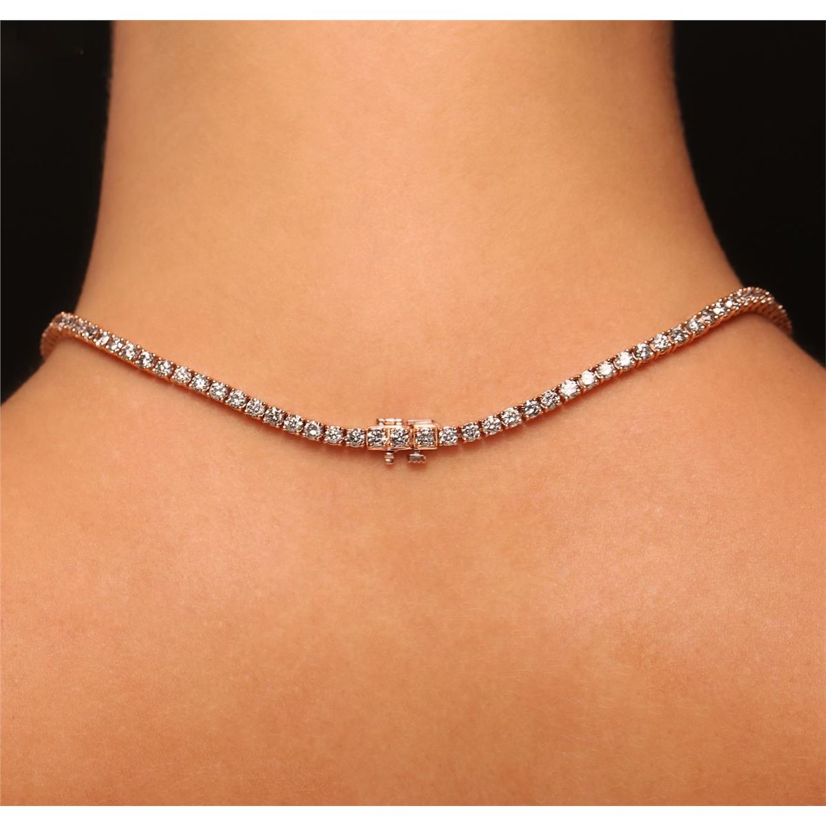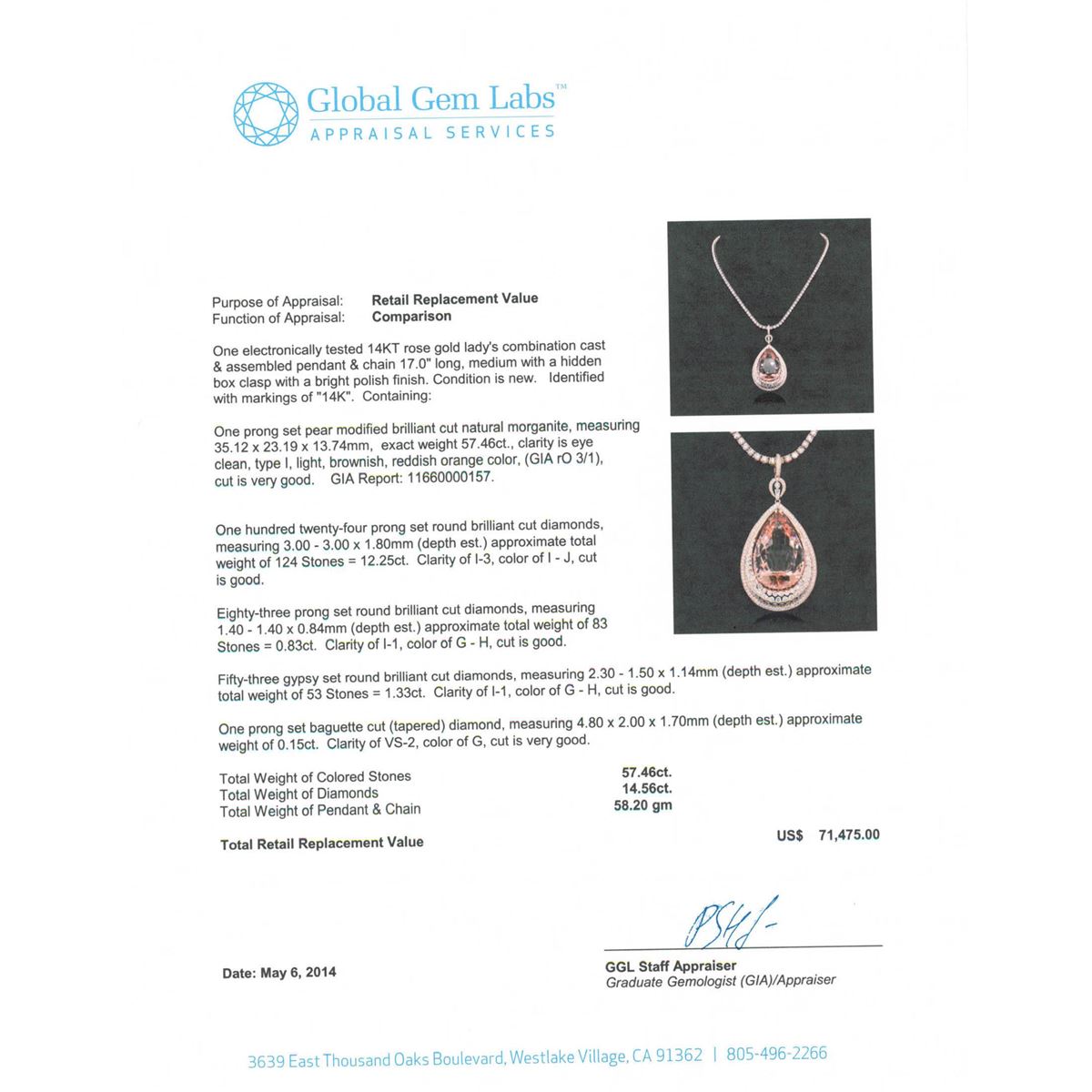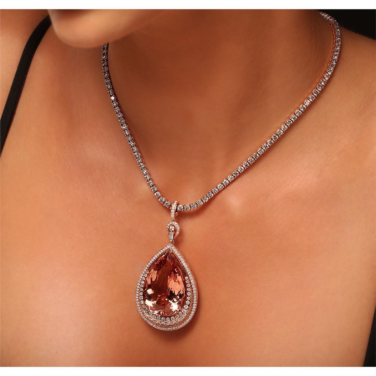 One electronically tested 14KT rose gold Ladies combination cast & assembled pendant & chain 17.0 inch long, medium with a hidden box clasp with a bright polish finish. Condition is new. Identified with markings of "14K". Containing: One prong set pear modified brilliant cut natural morganite, measuring 35.12 x 23.19 x 13.74mm, exact weight 57.46ct., clarity is eye clean, type I, light, brownish, reddish orange color, (GIA rO 3/1), cut is very good. GIA Report: 11660000157. One Hundred Twenty-Four prong set round brilliant cut diamonds, measuring 3.00 - 3.00 x 1.80mm (depth est.) approximate. Total Weight of 124 Stones = 12.25ct. Clarity: I-3. Color: I - J, Cut is Good. Eighty-Three prong set round brilliant cut diamonds, measuring 1.40 - 1.40 x 0.84mm (depth est.) approximate. Total Weight of 83 Stones = 0.83ct. Clarity: I-1. Color: G - H, Cut is Good. Fifty-Three gypsy set round brilliant cut diamonds, measuring 2.30 - 1.50 x 1.14mm (depth est.) approximate. Total Weight of 53 Stones = 1.33ct. Clarity: I-1. Color: G - H, Cut is Good. One prong set baguette cut (tapered) diamond, measuring 4.80 x 2.00 x 1.70mm (depth est.) approximate weight of 0.15ct. Clarity: VS-2. Color: G, Cut is Very Good. Total Weight of Colored Stones 57.46ct. Total Weight of Diamonds 14.56ct. Total Weight of Pendant & Chain 58.20 grams. GGL Appraised at $71,475.00.
