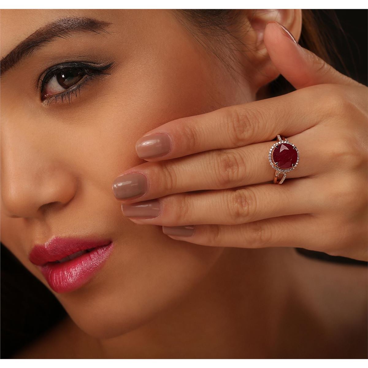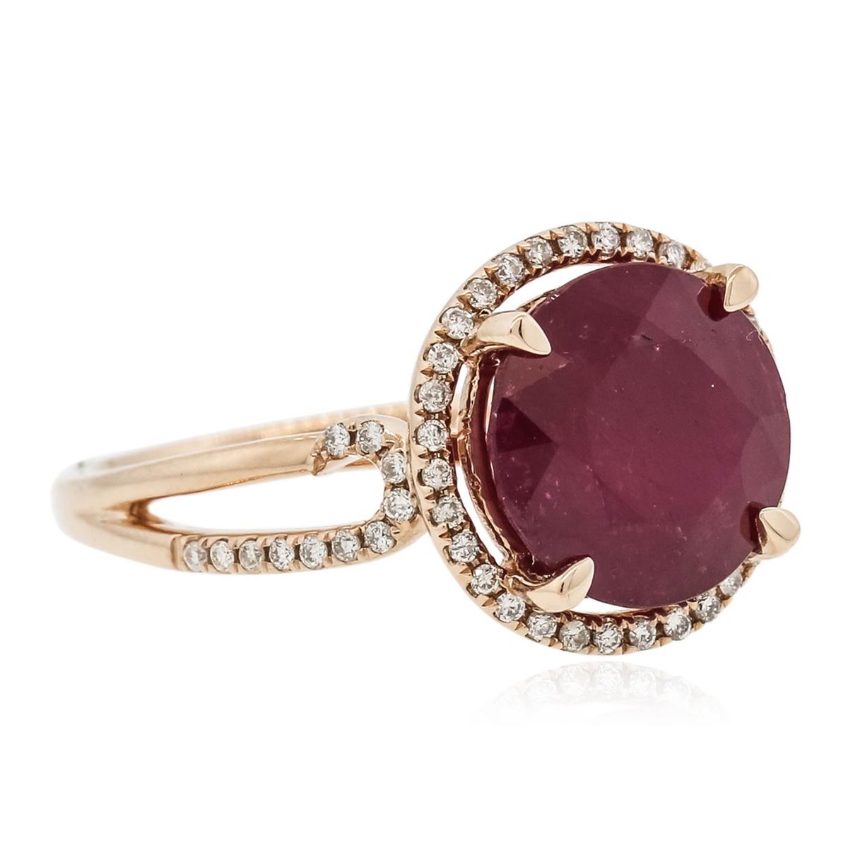 One electronically tested 14KT rose gold ladies cast ruby and diamond ring with a bright polish finish. The featured ruby is set within a diamond bezel supported by diamond set shoulders, completed by a one and one-half millimeter wide band. Trademark is PMI. Identified with markings of "14K". Condition is new, good workmanship. Containing: One prong set round brilliant cut natural ruby, measuring 10.20 - 10.15 x 6.70 mm, 10%. bulge factor, approximate weight of 6.13ct., clarity is heavily included, type II, dark, very slightly brownish, slightly purplish red color, (GIA slpR 7/3), cut is good. Transmitting light somewhat diffusely, transparent to translucent. Naturally occurring internal & external characteristics are present. Indications of laboratory high temperature heat treatment, with glass & flux additives. Graded in the setting. Ruby has a low tolerance to rhodium plating, repolishing the surface, & ultrasonic cleaning.Fifty-Four prong set round brilliant cut diamonds, measuring 1.10 - 1.00 x 0.63mm (depth est.) approximate total weight of 54 Stones = 0.32ct. Graded in the setting. Clarity: SI-1 to I-1. Color: G - I. Total Weight of Colored Stones 6.13ct. Total Weight of Diamonds 0.32ct. Total Weight of Ring 4.10 grams. AIG Appraised at $3,065.00.