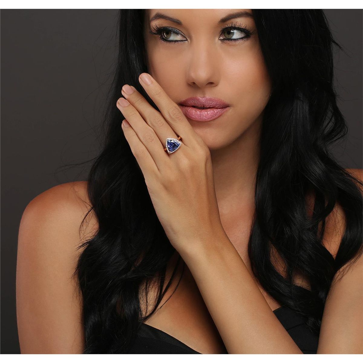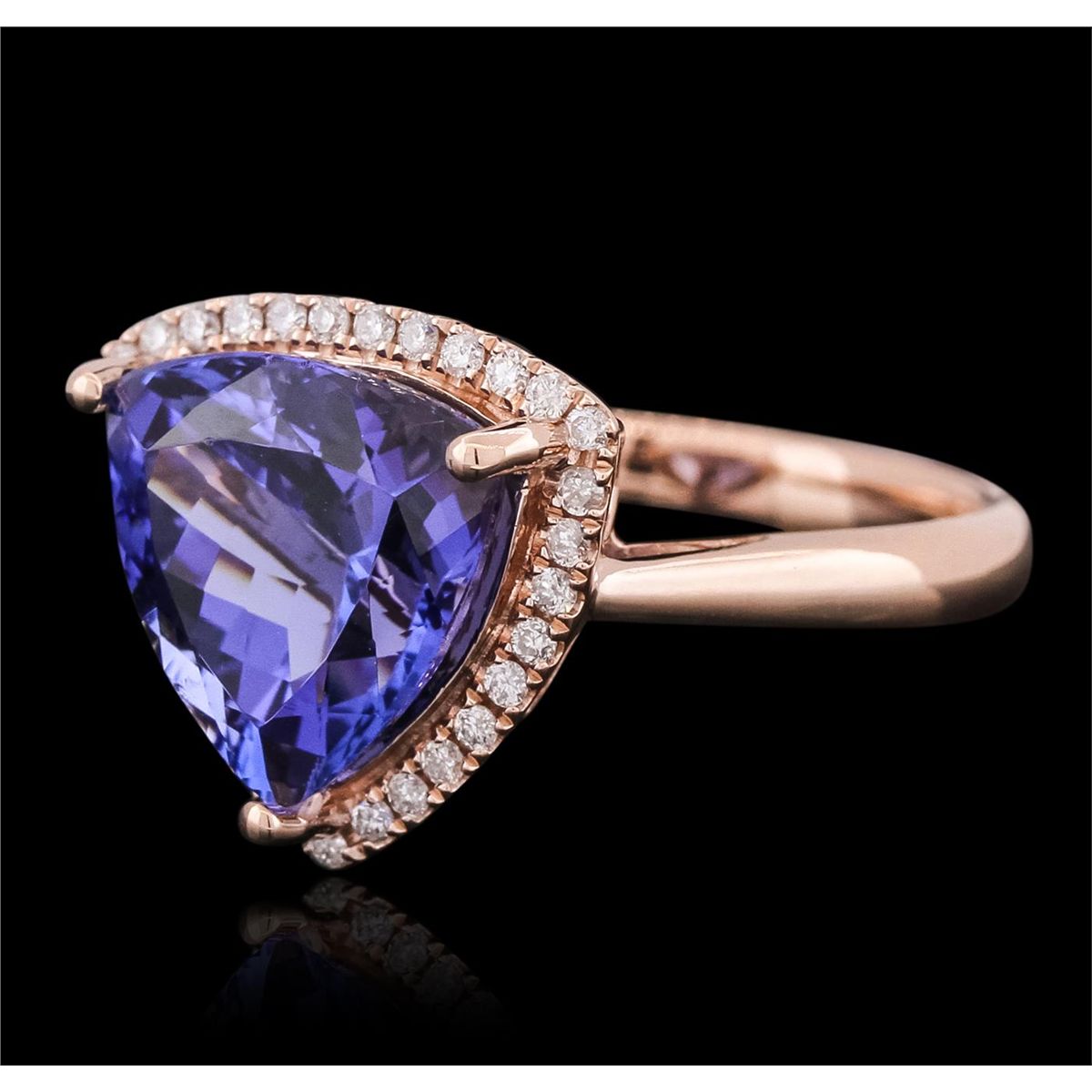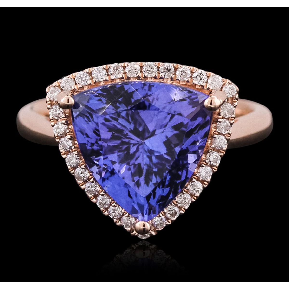 One electronically tested 14KT rose gold ladies combination cast & assembled ring with a bright polish finish. Identified with markings of "14K". Condition is new. Containing: One prong set triangle modified brilliant cut natural tanzanite, measuring 11.80 x 11.80 x 7.48mm, approximate weight of 6.28ct., clarity is eye clean, type I, medium, moderately strong, violetish blue color, (GIA vB 5/4), cut is very good. Thirty-One prong set round brilliant cut diamonds, measuring 1.10 - 1.10 x 0.66mm (depth est.) approximate total weight of 31 Stones = 0.15ct. Clarity: I-1 to I-2. Color: I - J, Cut is Good. Colored gemstones are presumed to have been subjected to commonly used enhancement processes. All diamonds and colored gemstones are graded in the mounting, unless otherwise stated. Total Weight of Colored Stones 6.28ct. Total Weight of Diamonds 0.15ct. Total Weight of Ring 5.10 grams. GGL Appraised at $10,305.00.