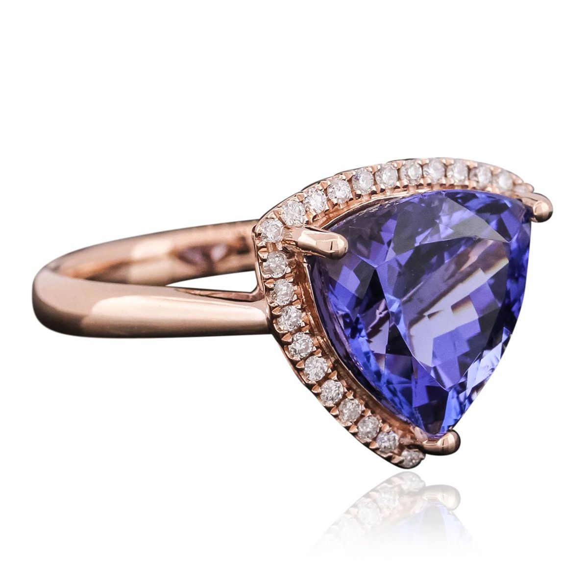 One electronically tested 14KT rose gold ladies combination cast & assembled ring with a bright polish finish. Identified with markings of "14K". Condition is new. Containing: One prong set triangle modified brilliant cut natural tanzanite, measuring 11.80 x 11.80 x 7.48mm, approximate weight of 6.28ct., clarity is eye clean, type I, medium, moderately strong, violetish blue color, (GIA vB 5/4), cut is very good. Thirty-One prong set round brilliant cut diamonds, measuring 1.10 - 1.10 x 0.66mm (depth est.) approximate total weight of 31 Stones = 0.15ct. Clarity: I-1 to I-2. Color: I - J, Cut is Good. Colored gemstones are presumed to have been subjected to commonly used enhancement processes. All diamonds and colored gemstones are graded in the mounting, unless otherwise stated. Total Weight of Colored Stones 6.28ct. Total Weight of Diamonds 0.15ct. Total Weight of Ring 5.10 grams. GGL Appraised at $10,305.00.