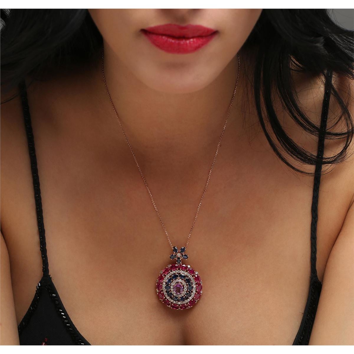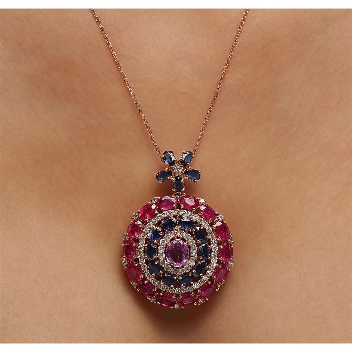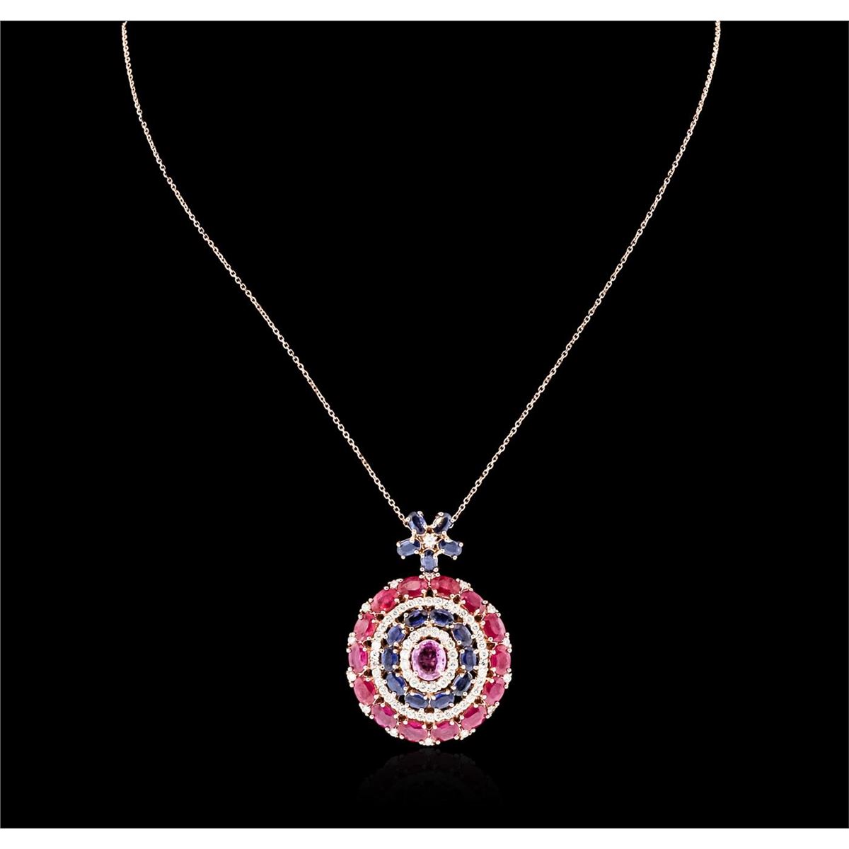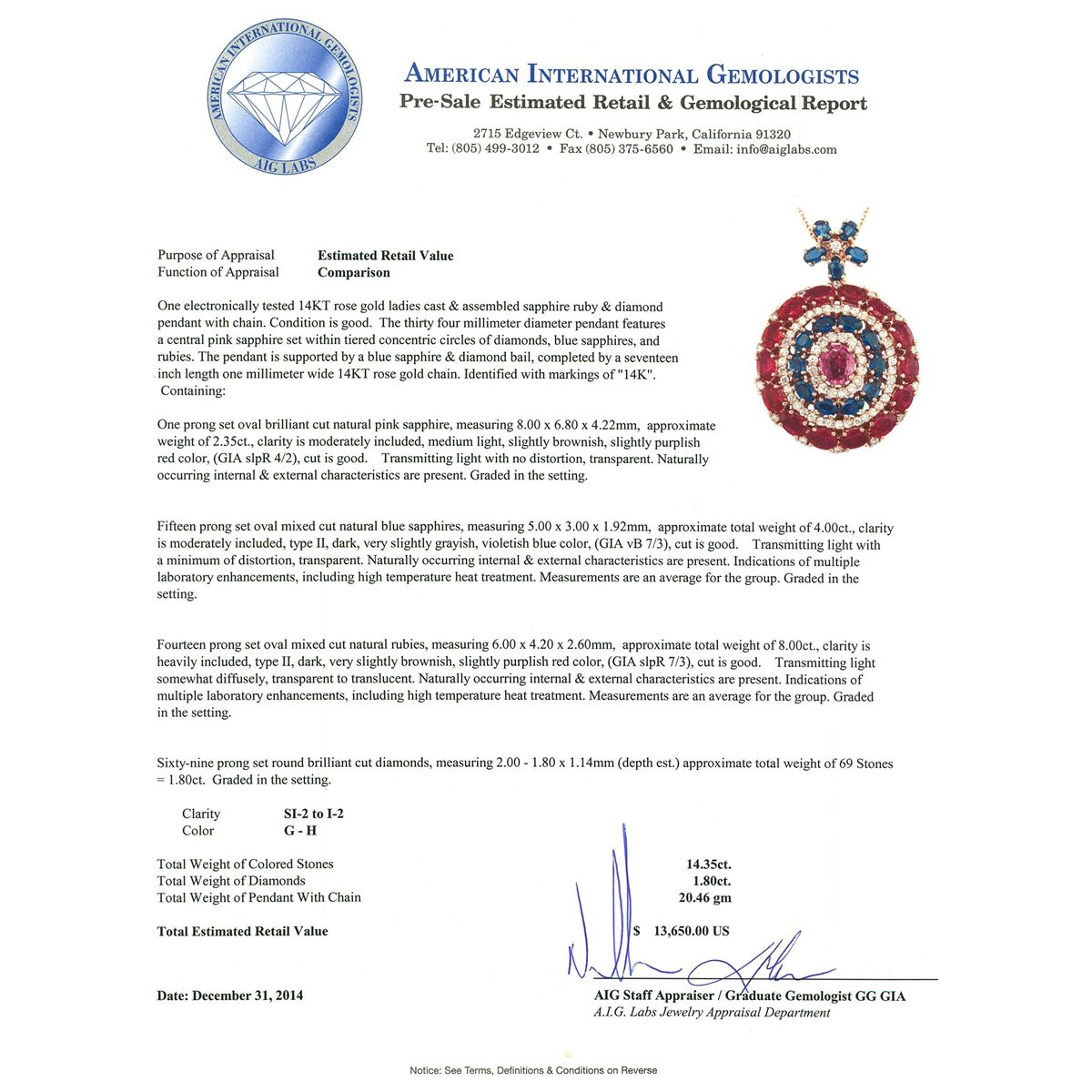 One electronically tested 14KT rose gold ladies cast & assembled sapphire ruby & diamond pendant with chain. The thirty four millimeter diameter pendant features a central pink sapphire set within tiered concentric circles of diamonds, blue sapphires, and rubies. The pendant is supported by a blue sapphire & diamond bail, completed by a seventeen inch length one millimeter wide 14KT rose gold chain. Identified with markings of "14K". Condition is good. Containing: One prong set oval brilliant cut natural pink sapphire, measuring 8.00 x 6.80 x 4.22mm, approximate weight of 2.35ct., clarity is moderately included, medium light, slightly brownish, slightly purplish red color, (GIA slpR 4/2), cut is good. Transmitting light with no distortion, transparent. Naturally occurring internal & external characteristics are present. Graded in the setting. Fifteen prong set oval mixed cut natural blue sapphires, measuring 5.00 x 3.00 x 1.92mm, approximate total weight of 4.00ct., clarity is moderately included, type II, dark, very slightly grayish, violetish blue color, (GIA vB 7/3), cut is good. Transmitting light with a minimum of distortion, transparent. Naturally occurring internal & external characteristics are present. Indications of multiple laboratory enhancements, including high temperature heat treatment. Measurements are an average for the group. Graded in the setting. Fourteen prong set oval mixed cut natural rubies, measuring 6.00 x 4.20 x 2.60mm, approximate total weight of 8.00ct., clarity is heavily included, type II, dark, very slightly brownish, slightly purplish red color, (GIA slpR 7/3), cut is good. Transmitting light somewhat diffusely, transparent to translucent. Naturally occurring internal & external characteristics are present. Indications of multiple laboratory enhancements, including high temperature heat treatment. Measurements are an average for the group. Graded in the setting. Sixty-Nine prong set round brilliant cut diamonds, measuring 2.00 - 1.80 x 1.14mm (depth est.) approximate total weight of 69 Stones = 1.80ct. Graded in the setting. Clarity: SI-2 to I-2. Color: G - H. Total Weight of Colored Stones 14.35ct. Total Weight of Diamonds 1.80ct. Total Weight of Pendant With Chain 20.46 grams. AIG Appraised at $13,650.00.