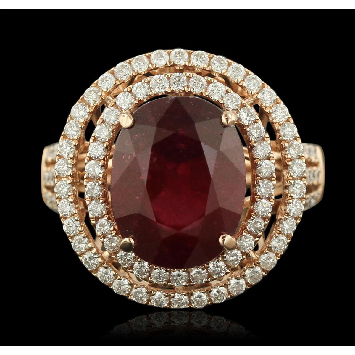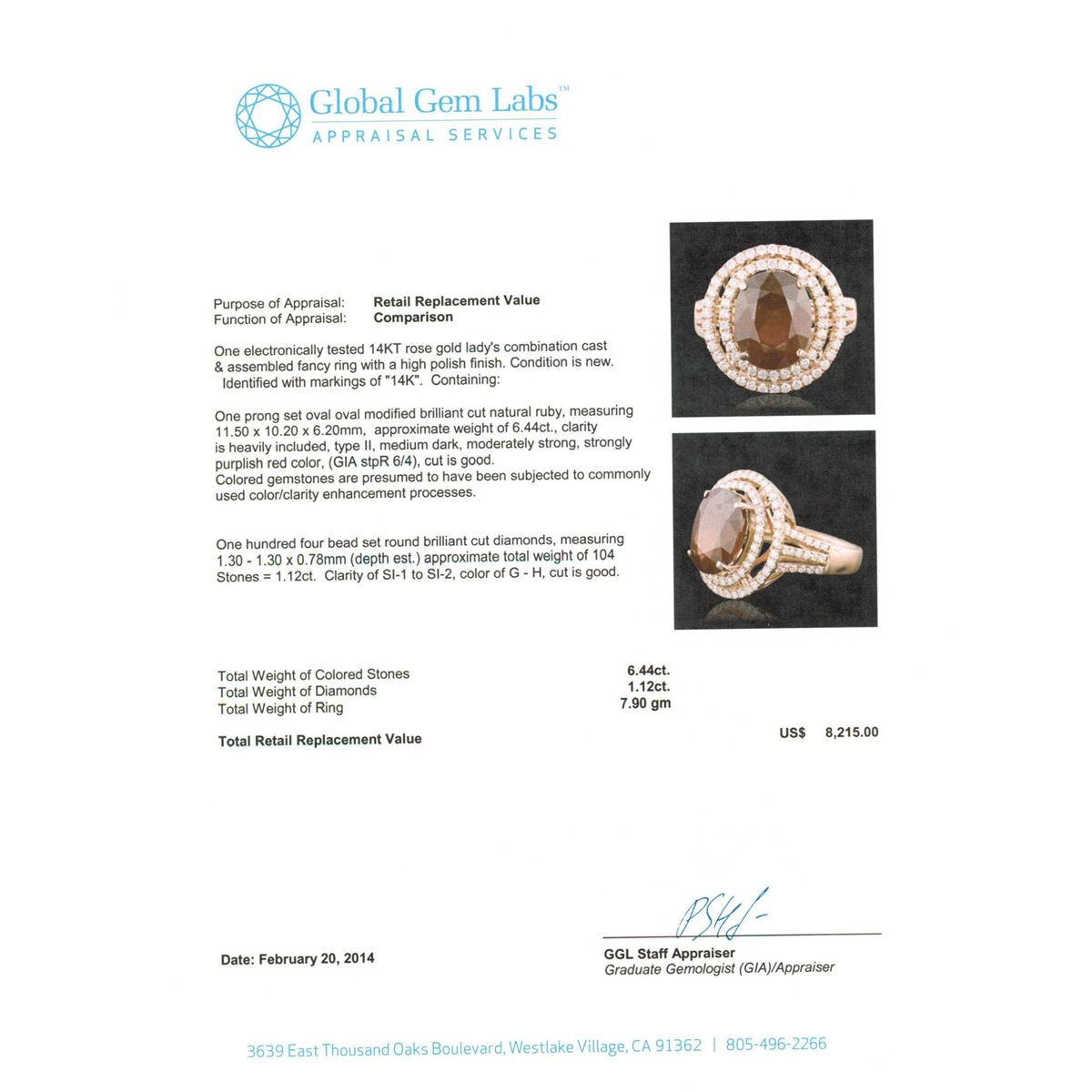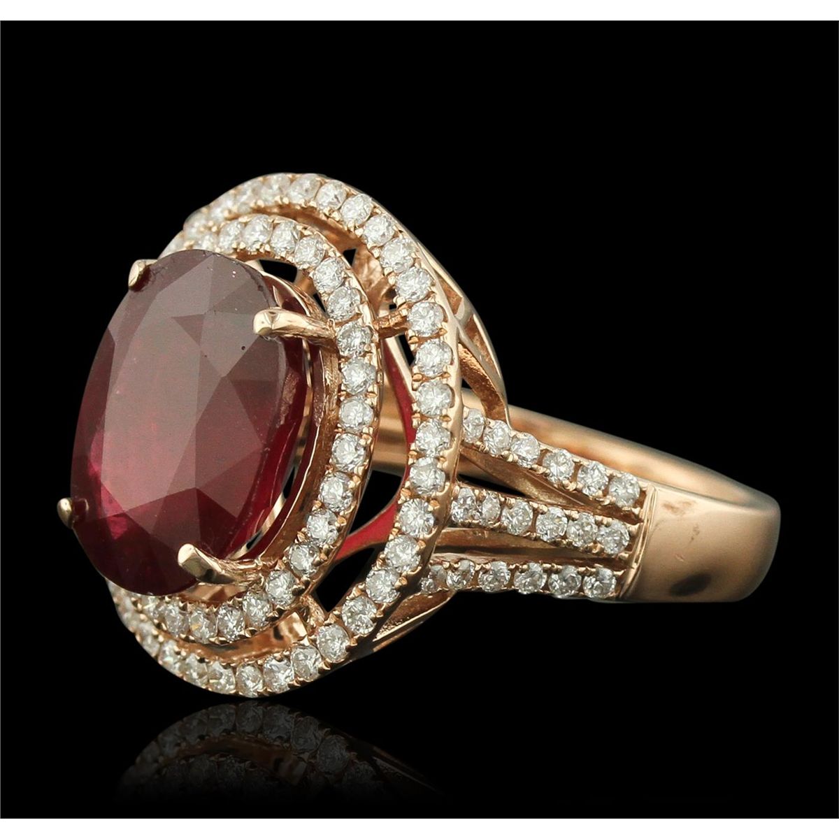One electronically tested 14KT rose gold Ladies combination cast & assembled fancy ring with a high polish finish. Condition is new. Identified with markings of "14K". Containing: One prong set oval modified brilliant cut natural ruby, measuring 11.50 x 10.20 x 6.20mm, approximate weight of 6.44ct., clarity is heavily included, type II, medium dark, moderately strong, strongly purplish red color, (GIA stpR 6/4), cut is good. Colored gemstones are presumed to have been subjected to commonly used color/clarity enhancement processes. One Hundred Four bead set round brilliant cut diamonds, measuring 1.30 - 1.30 x 0.78mm (depth est.) approximate. Total Weight of 104 Stones = 1.12ct. Clarity: SI-1 to SI-2. Color: G - H, Cut is Good. Total Weight of Colored Stones 6.44ct. Total Weight of Diamonds 1.12ct. Total Weight of Ring 7.90 grams. GGL Appraised at $8,215.00.