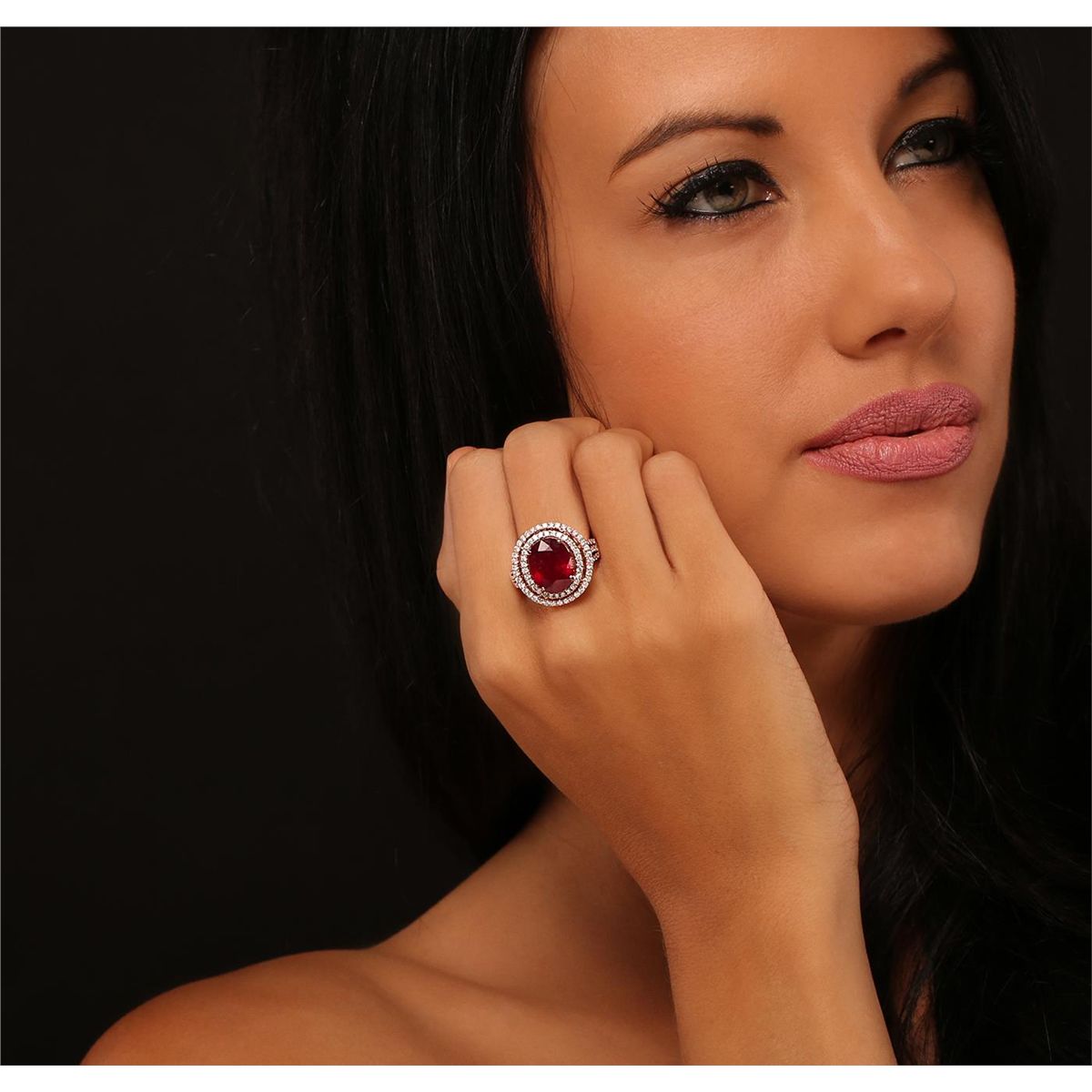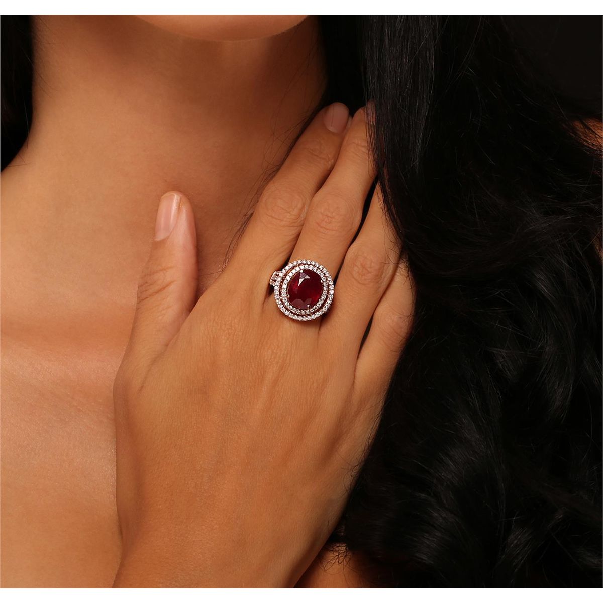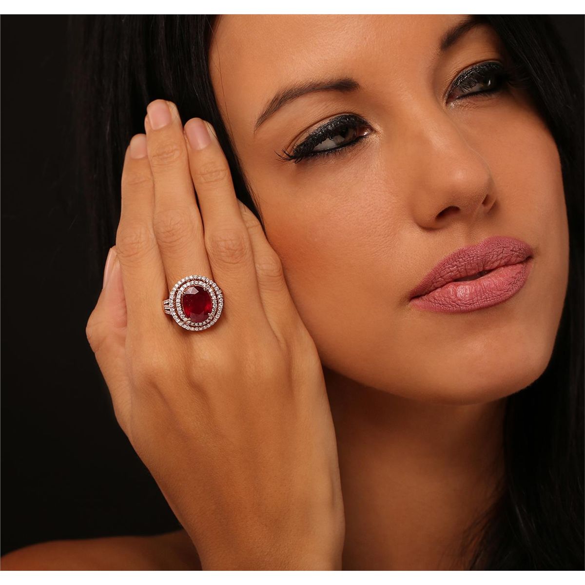 One electronically tested 14KT rose gold Ladies combination cast & assembled fancy ring with a high polish finish. Condition is new. Identified with markings of "14K". Containing: One prong set oval modified brilliant cut natural ruby, measuring 11.50 x 10.20 x 6.20mm, approximate weight of 6.44ct., clarity is heavily included, type II, medium dark, moderately strong, strongly purplish red color, (GIA stpR 6/4), cut is good. Colored gemstones are presumed to have been subjected to commonly used color/clarity enhancement processes. One Hundred Four bead set round brilliant cut diamonds, measuring 1.30 - 1.30 x 0.78mm (depth est.) approximate. Total Weight of 104 Stones = 1.12ct. Clarity: SI-1 to SI-2. Color: G - H, Cut is Good. Total Weight of Colored Stones 6.44ct. Total Weight of Diamonds 1.12ct. Total Weight of Ring 7.90 grams. GGL Appraised at $8,215.00.