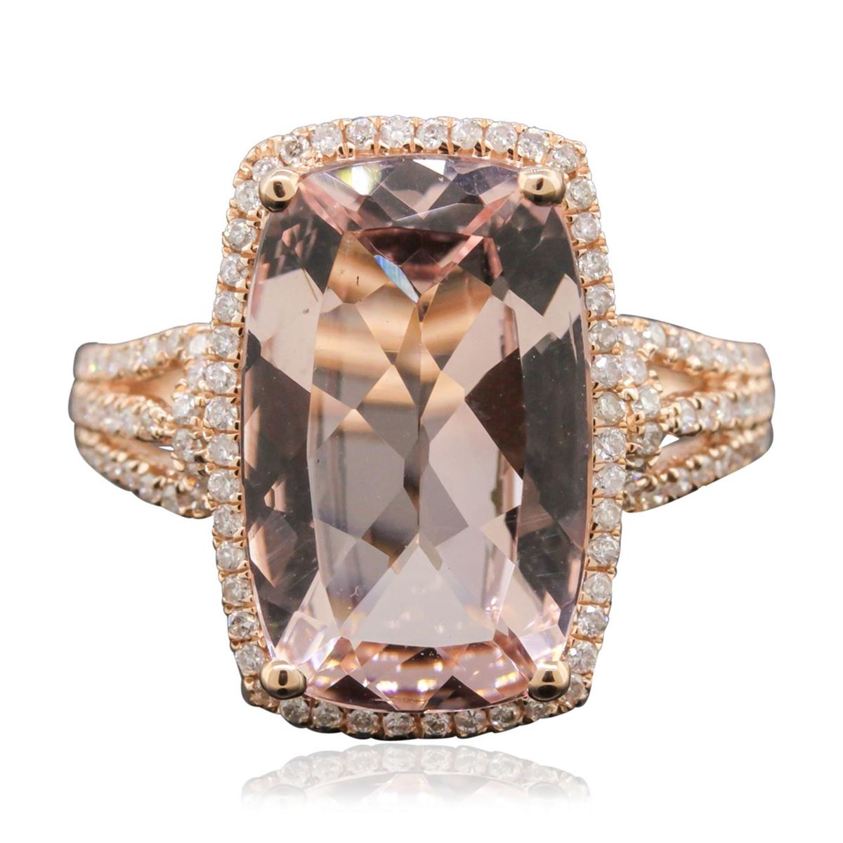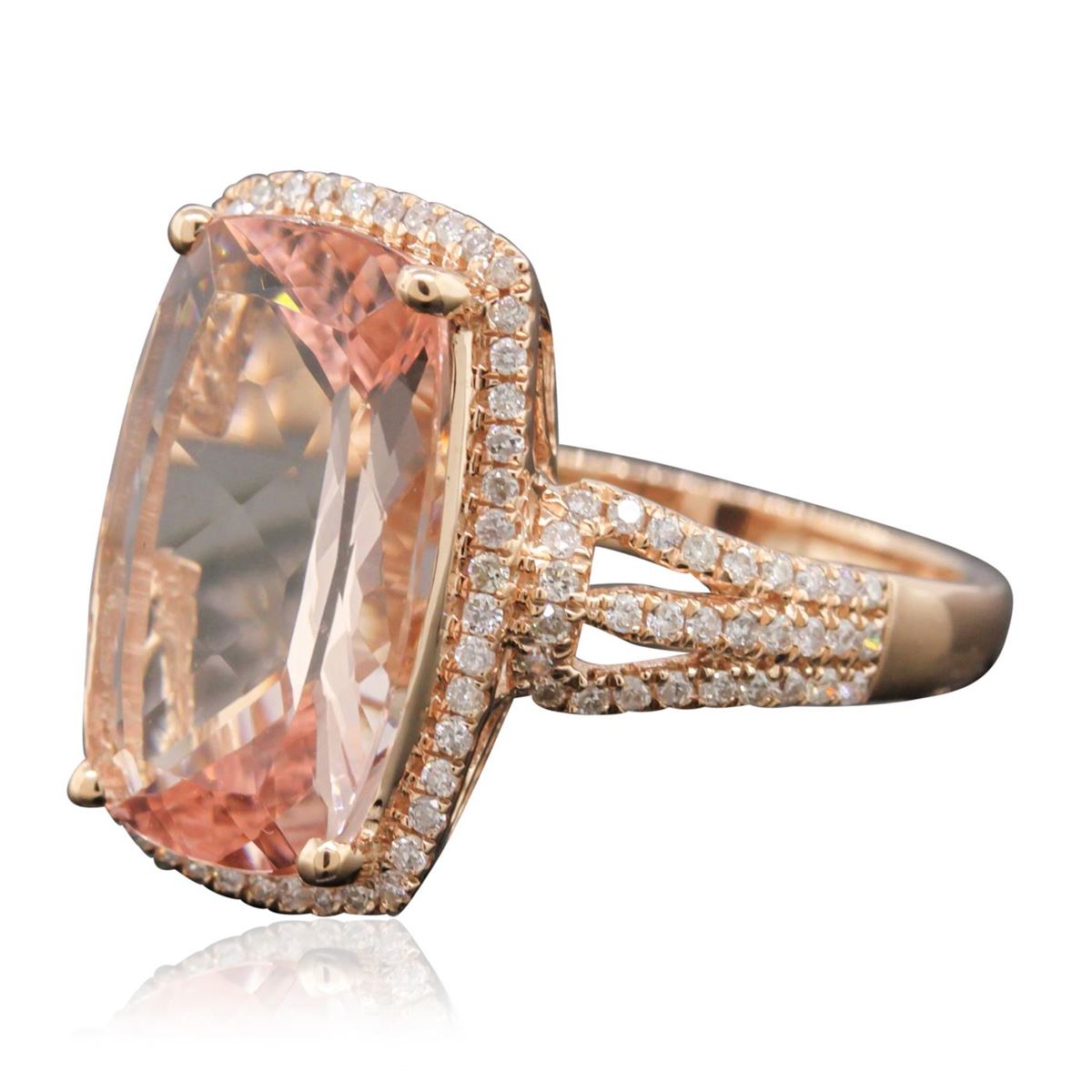 One ring featuring: 14KT rose gold with a total weight of 3.49 grams, (1) morganite with a total weight of 6.45ct, and (108) diamonds with a total weight of 0.44ctw.