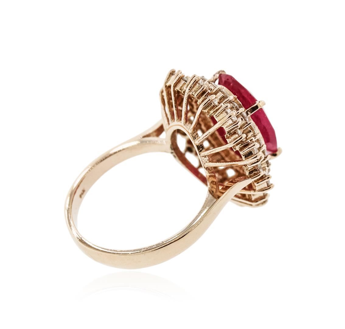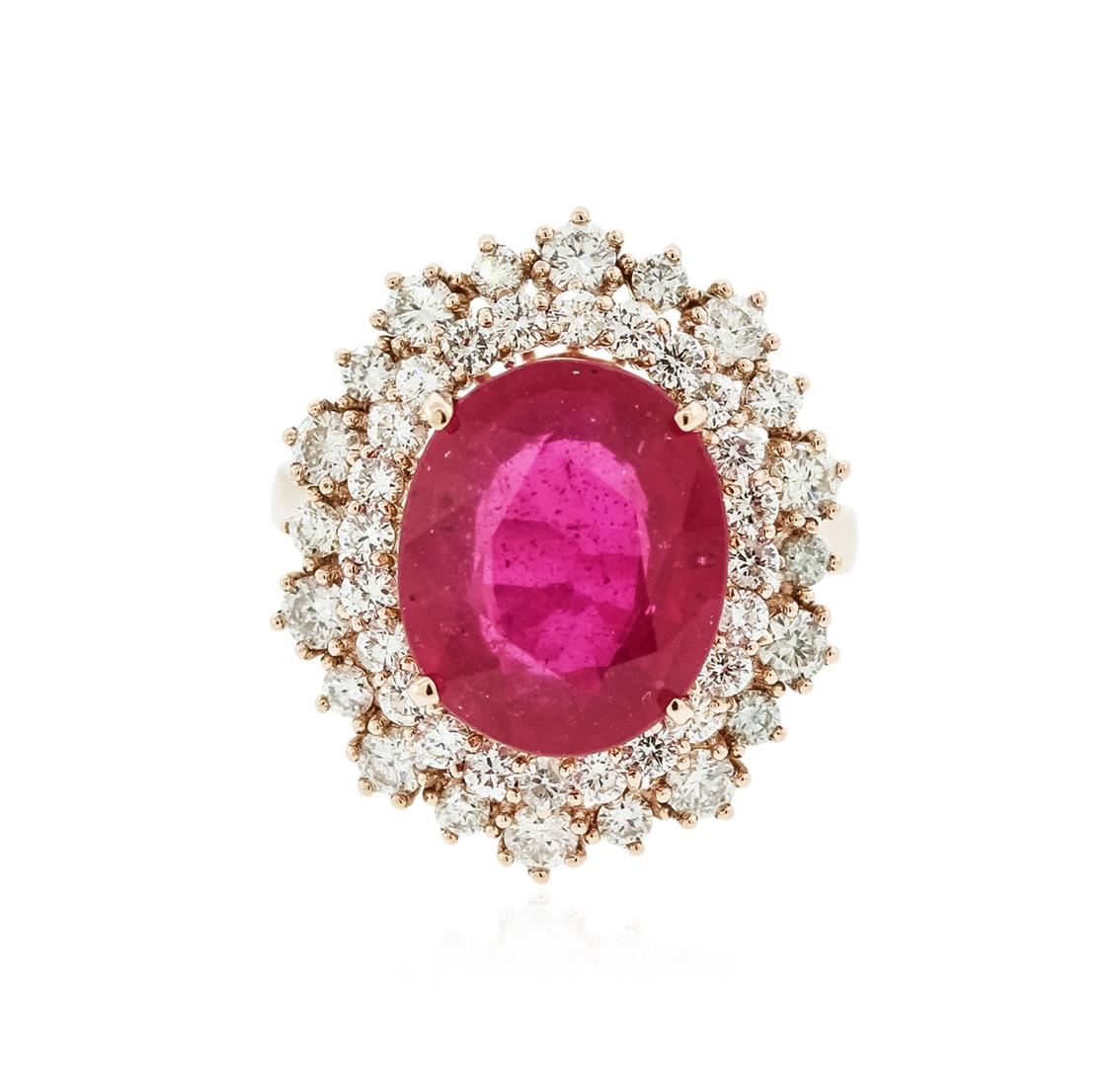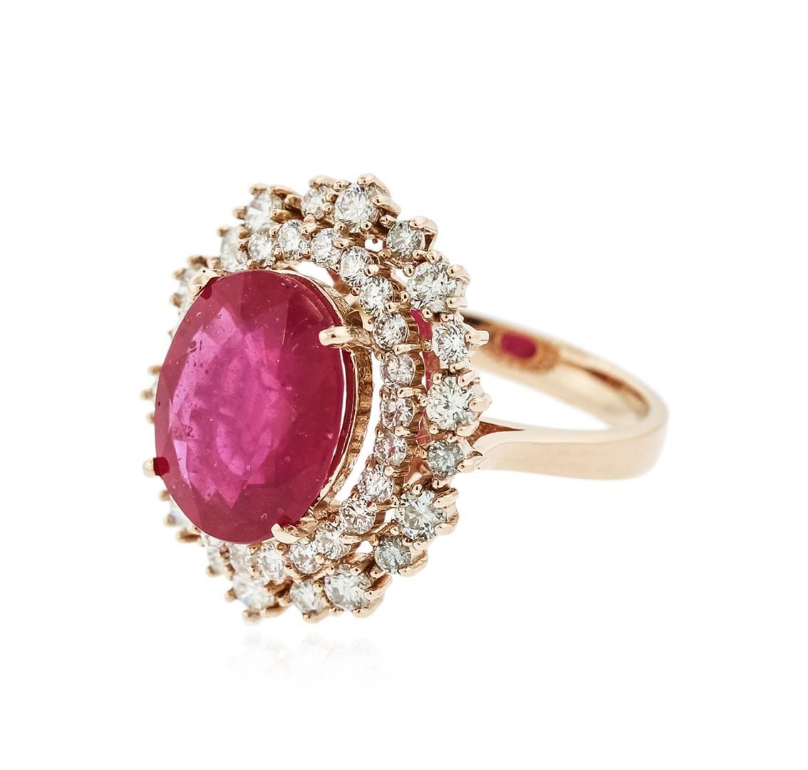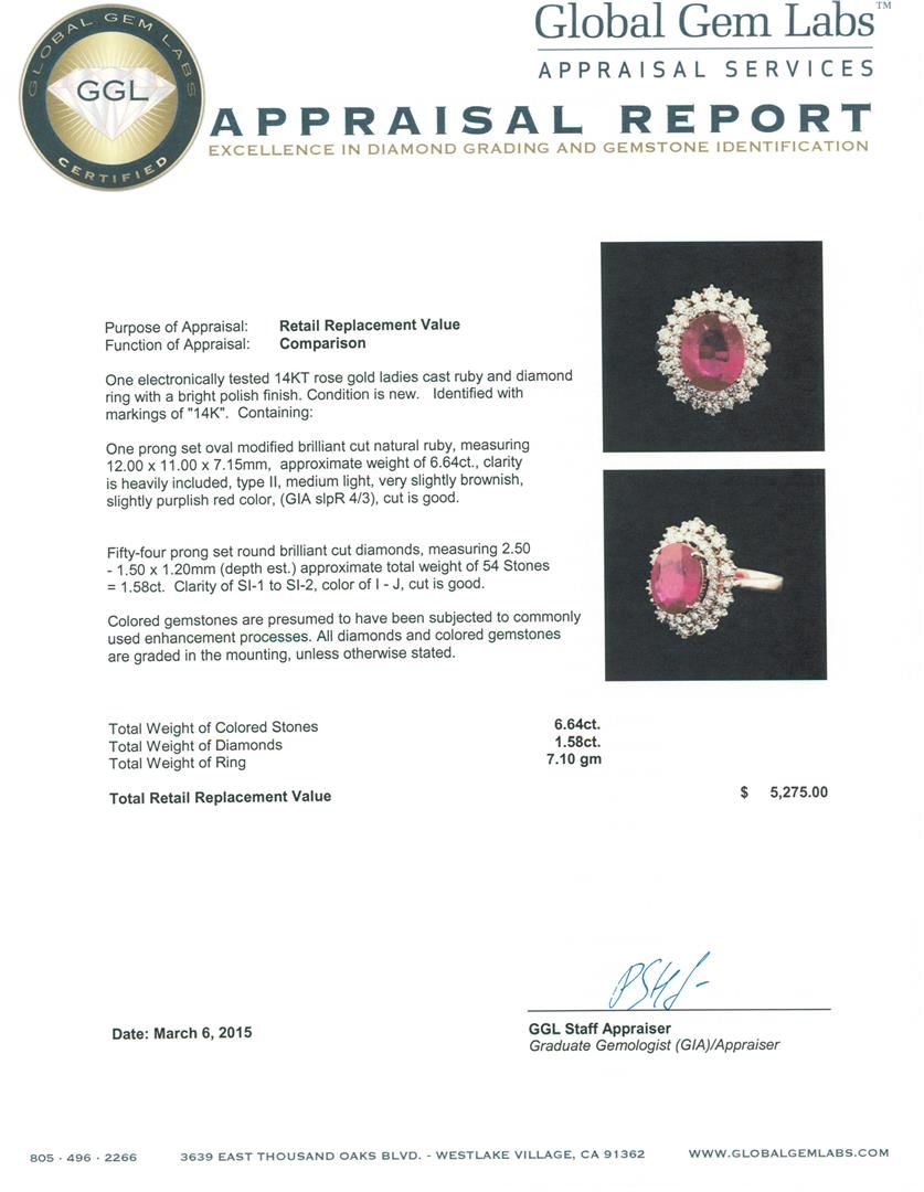 One electronically tested 14KT rose gold ladies cast ruby and diamond ring with a bright polish finish. Identified with markings of "14K". Condition is new. Containing: One prong set oval modified brilliant cut natural ruby, measuring 12.00 x 11.00 x 7.15mm, approximate weight of 6.64ct., clarity is heavily included, type II, medium light, very slightly brownish, slightly purplish red color, (GIA slpR 4/3), cut is good. Fifty-Four prong set round brilliant cut diamonds, measuring 2.50 - 1.50 x 1.20mm (depth est.) approximate total weight of 54 Stones = 1.58ct.. Clarity: SI-1 to SI-2. Color: I - J, Cut is Good. Colored gemstones are presumed to have been subjected to commonly used enhancement processes. All diamonds and colored gemstones are graded in the mounting, unless otherwise stated.. Total Weight of Colored Stones 6.64ct.. Total Weight of Diamonds 1.58ct.. Total Weight of Ring 7.10 grams. GGL Appraised at $5,275.00.