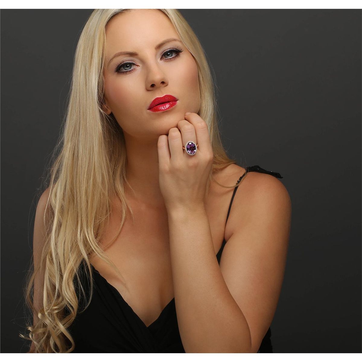 One electronically tested 14KT rose gold ladies combination cast & assembled amethyst and diamond ring with a flat shank with a bright polish finish. Identified with markings of "14K". Condition is new. Containing: One prong set oval modified brilliant cut natural amethyst, measuring 15.91 x 11.79 x 6.53mm, approximate weight of 6.66ct., clarity is eye clean, type II, medium, moderately strong, purple color, (GIA P 5/4), cut is good. Thirty-Eight prong set round brilliant cut diamonds, measuring 1.10 - 1.10 x 0.66mm (depth est.) stated total weight of 38 Stones = 0.18ct. Clarity: I-1 to I-2. Color: I - J, Cut is Good. Colored gemstones are presumed to have been subjected to commonly used enhancement processes. All diamonds and colored gemstones are graded in the mounting, unless otherwise stated total weight of Colored Stones 6.66ct. Total Weight of Diamonds 0.18ct. Total Weight of Ring 7.00 grams. GGL Appraised at $3,640.00.